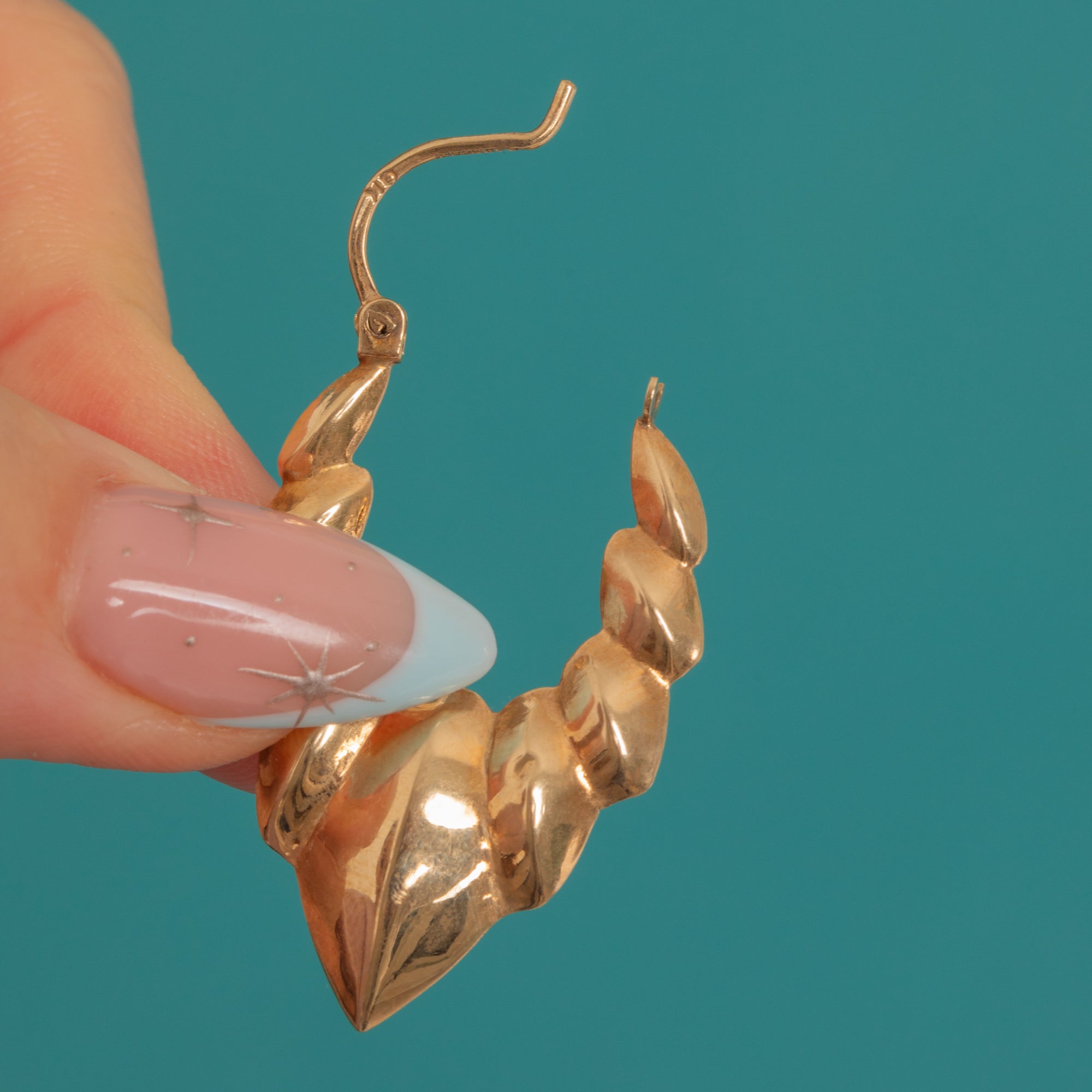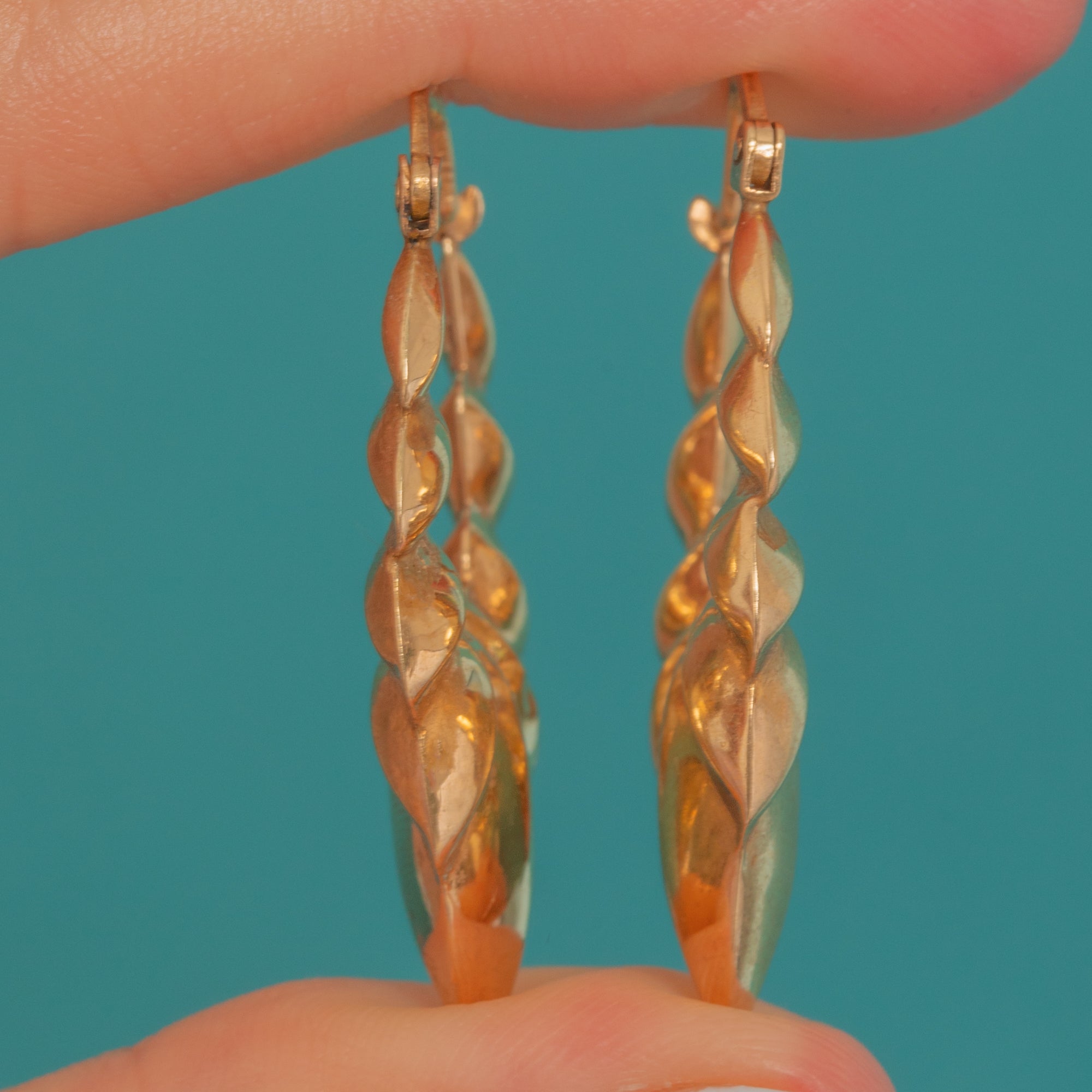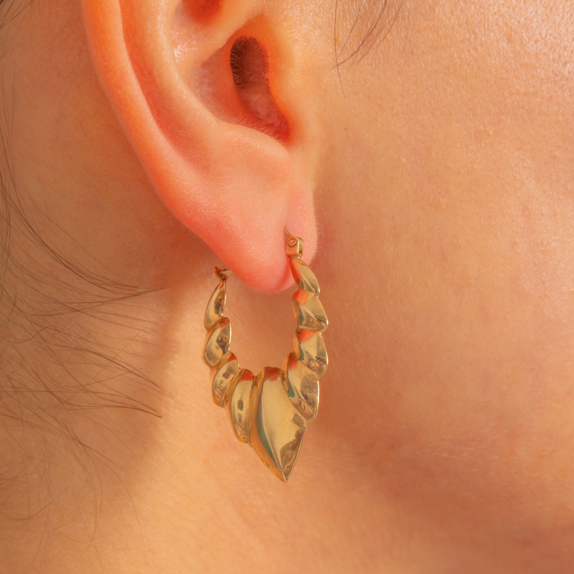 Architectural and effortlessly chic, these Vintage 9ct Gold “Wings” hoop earrings embody the sleek geometry of the 1990s. Their sculptural creole silhouette flares into softly ridged wing-like contours, finished with a mirror-bright polish that catches the light beautifully.