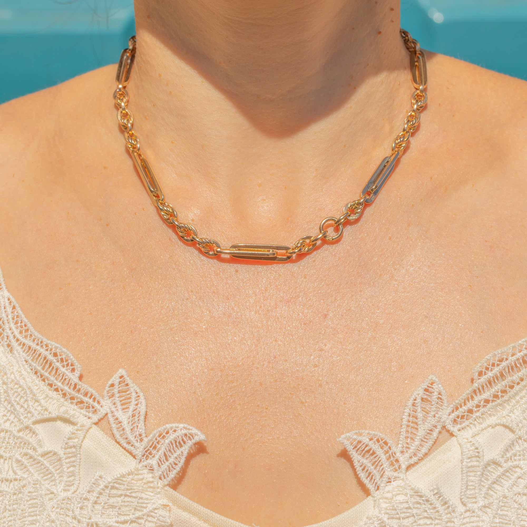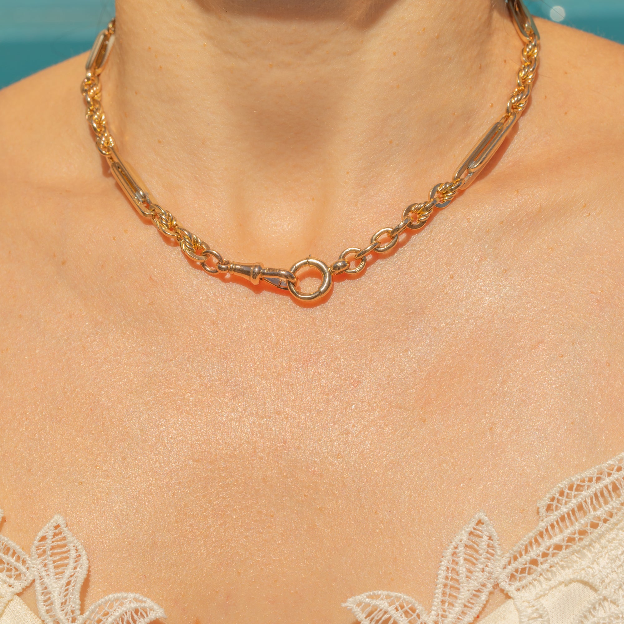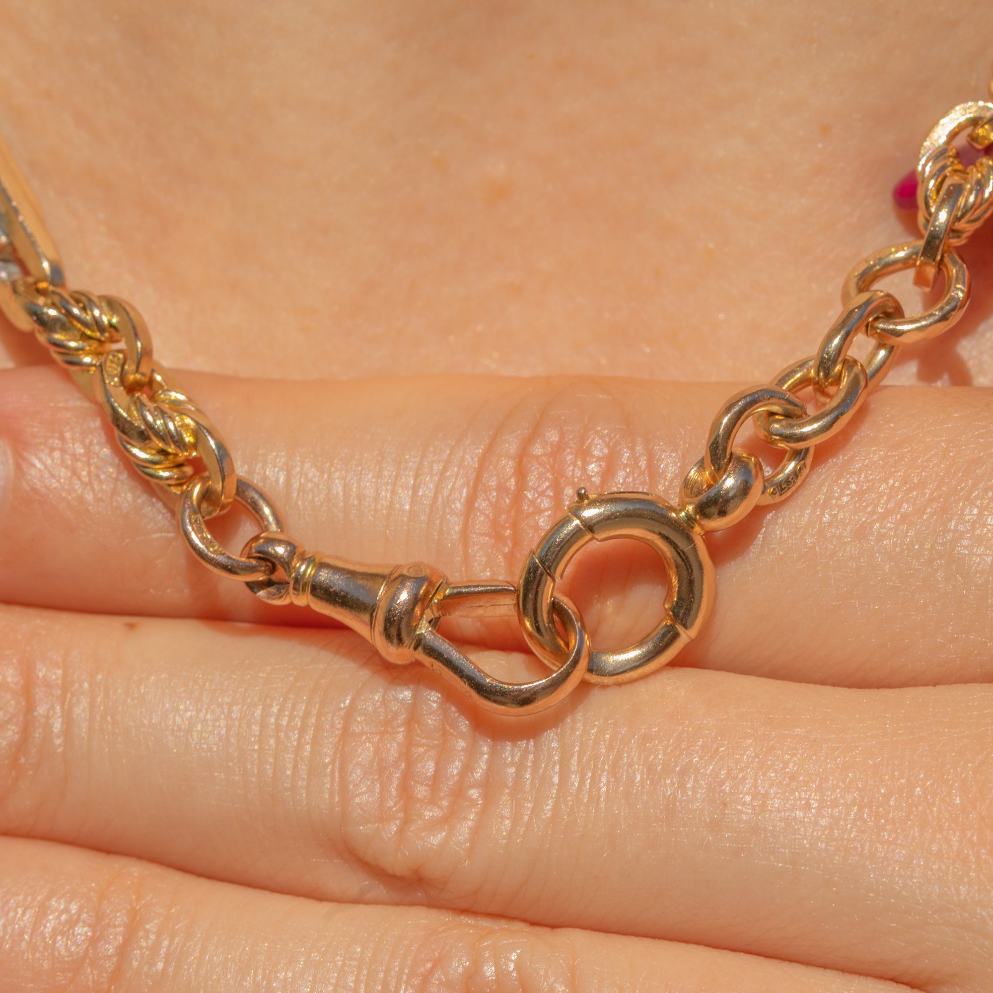 VERY GOOD: The solid Gold is bright and buttery and the links are all securely connected. The chain shows minimal surface wear consistent with age. Please note: the bolt ring does not spring back automatically and must be closed manually, but it remains secure when fastened. A stunning, tactile piece that pairs effortlessly with both casual and formal looks.