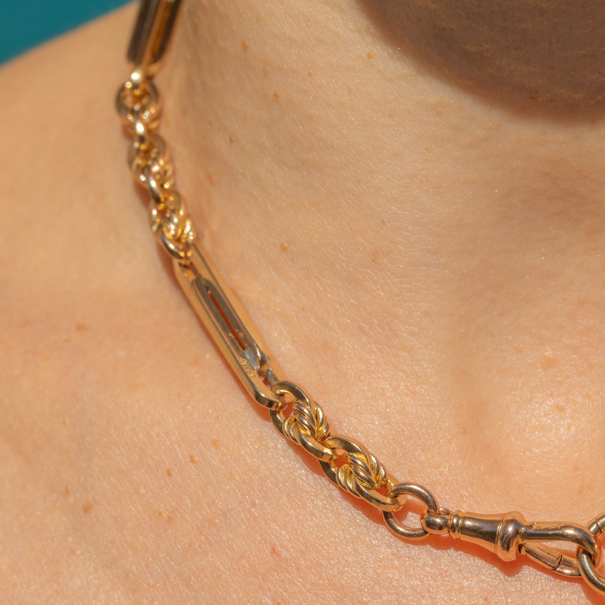 A luxurious addition to your collection, this Victorian lover's knot Albert chain is a solid Gold masterpiece! This chunky heirloom piece is crafted from 41 grams of solid Gold and features a delightful large bolt-ring and dog-clip.