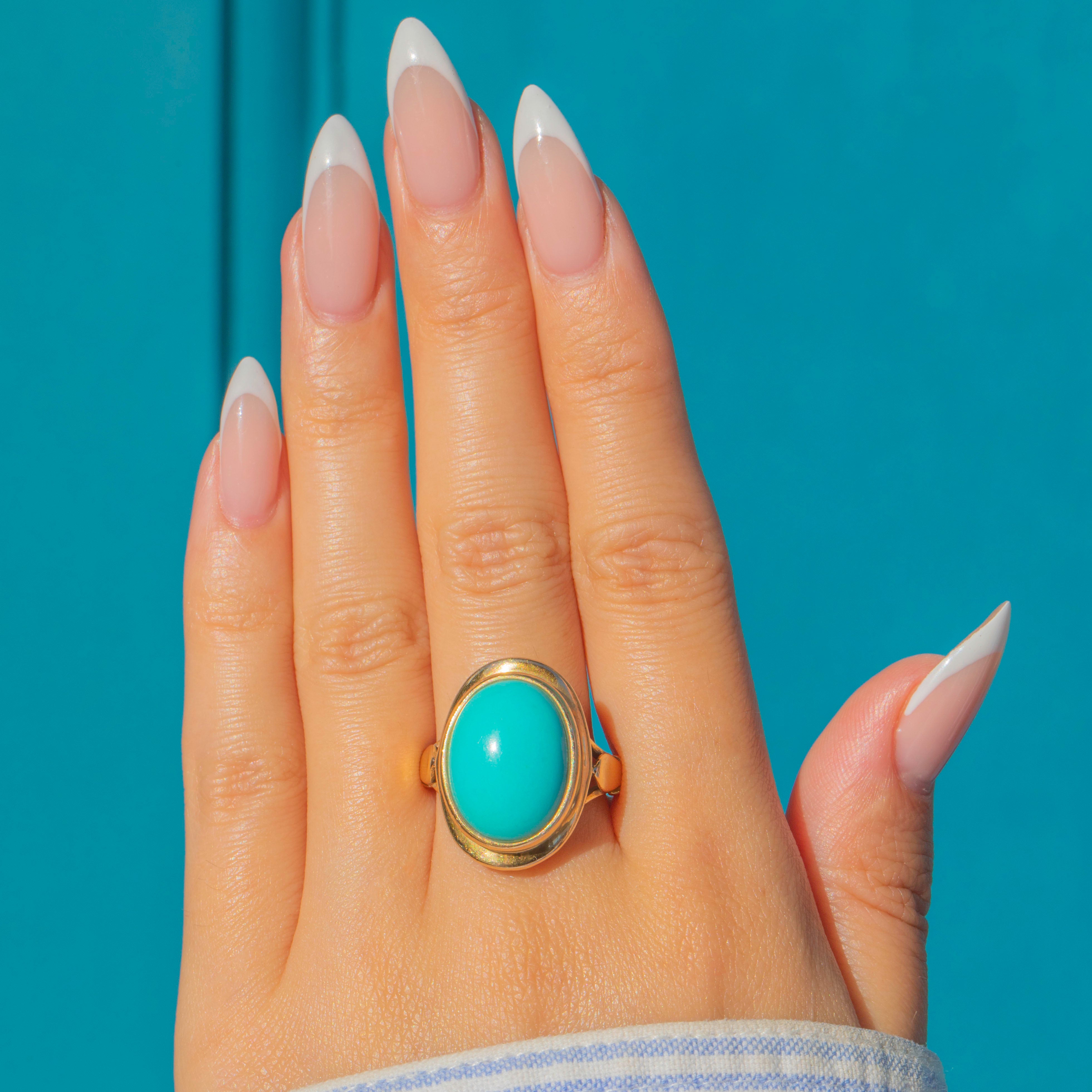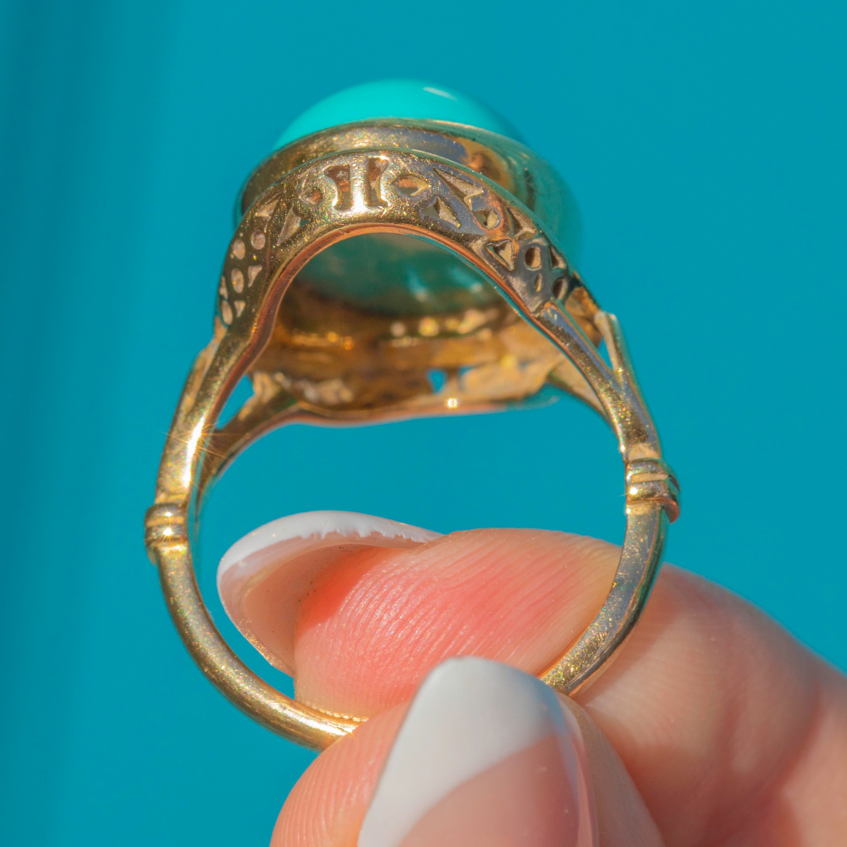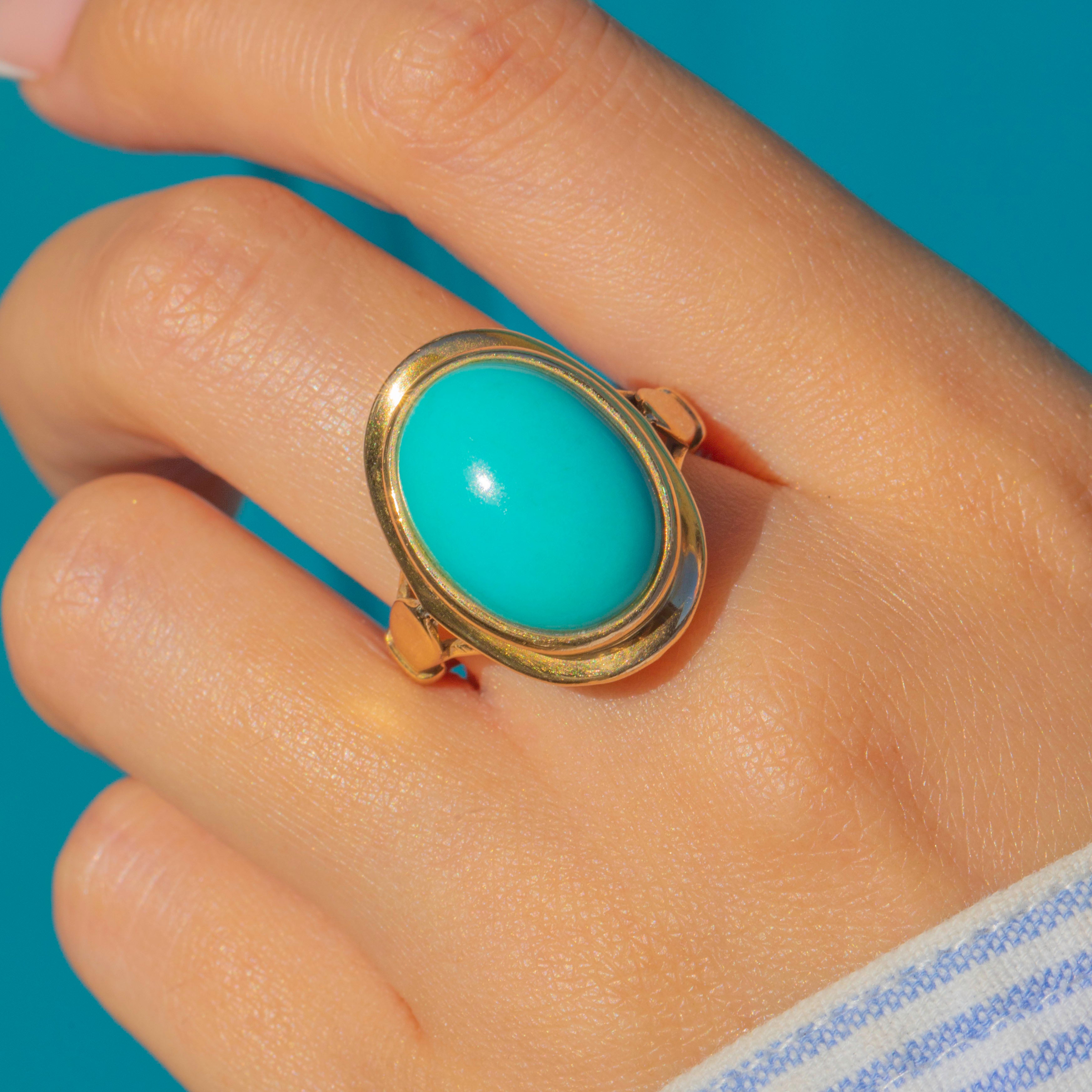 The ring face is framed in warm 18ct Gold, with a beautifully crafted under-gallery adding intricate detail and strength. A statement piece that perfectly balances classic craftsmanship with mid-20th century style, this ring is a wonderful way to wear the timeless allure of Persian Turquoise.
