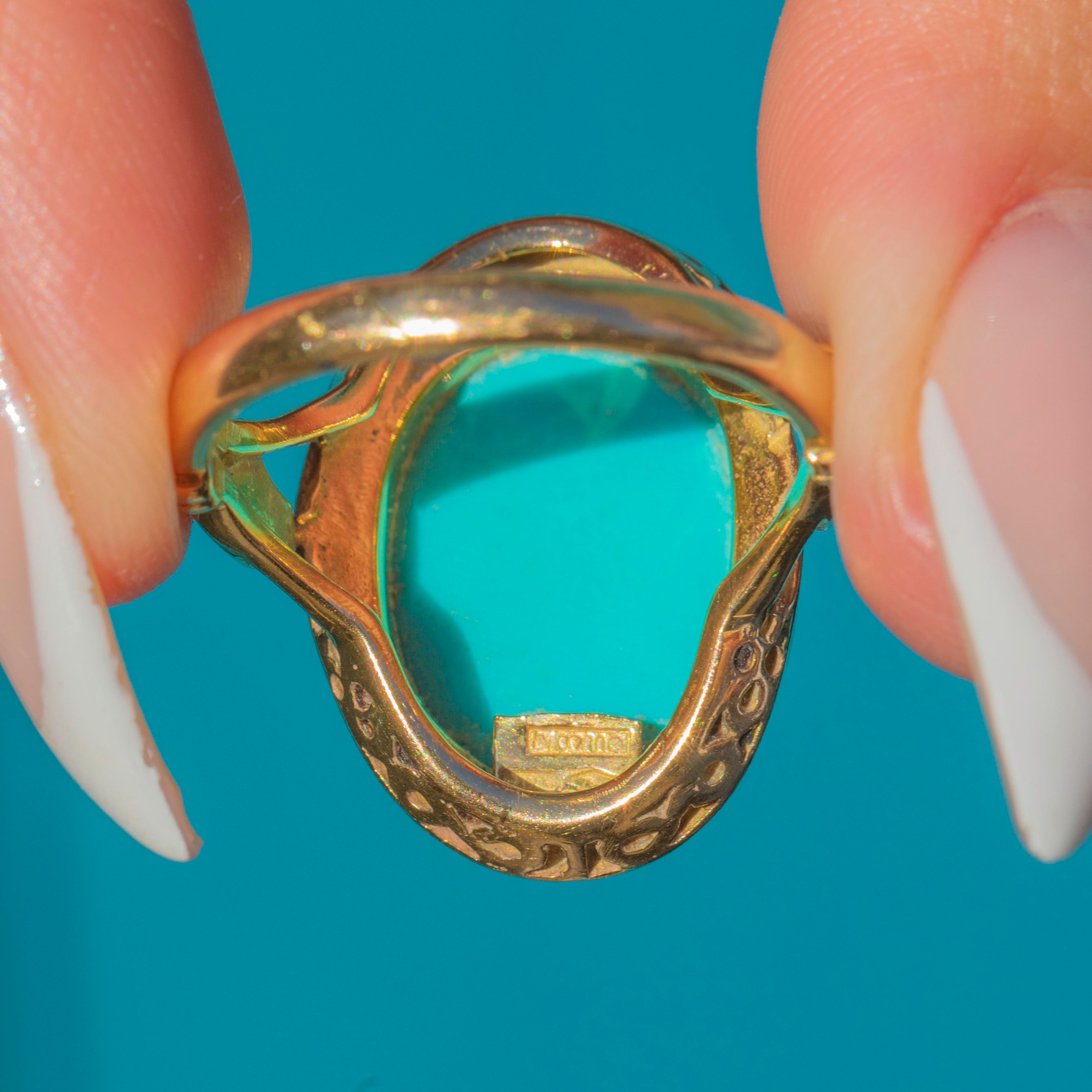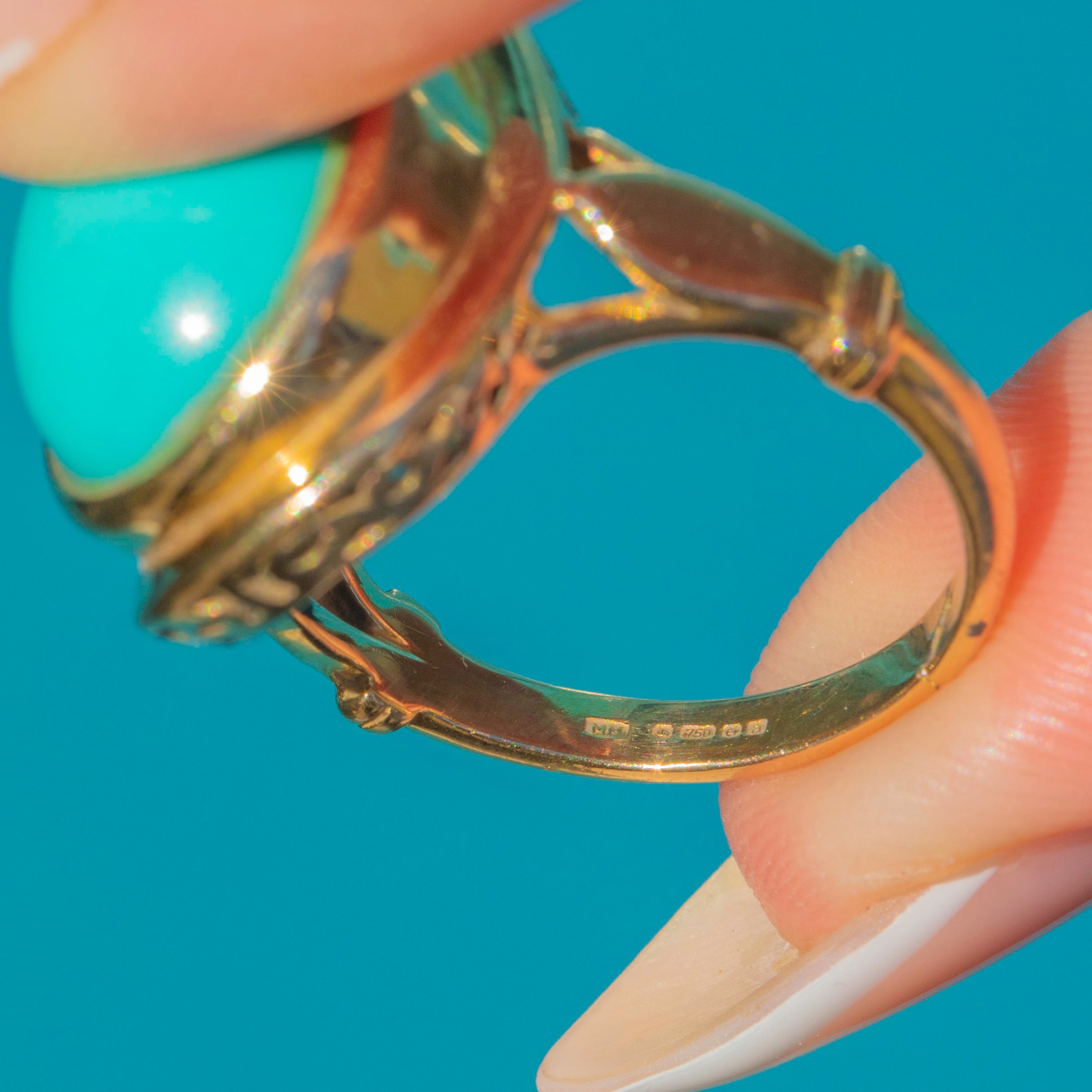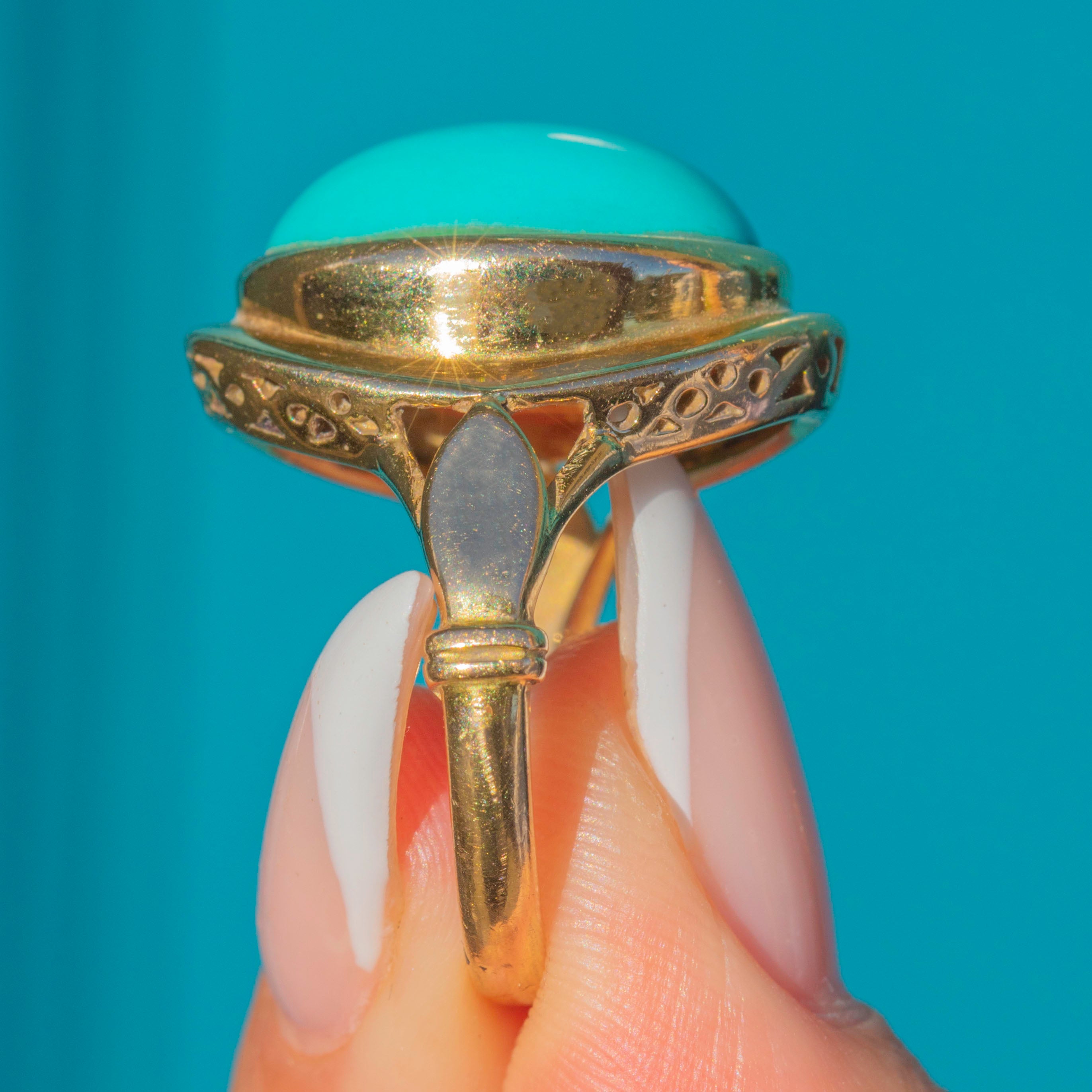 The ring face is framed in warm 18ct Gold, with a beautifully crafted under-gallery adding intricate detail and strength. A statement piece that perfectly balances classic craftsmanship with mid-20th century style, this ring is a wonderful way to wear the timeless allure of Persian Turquoise.