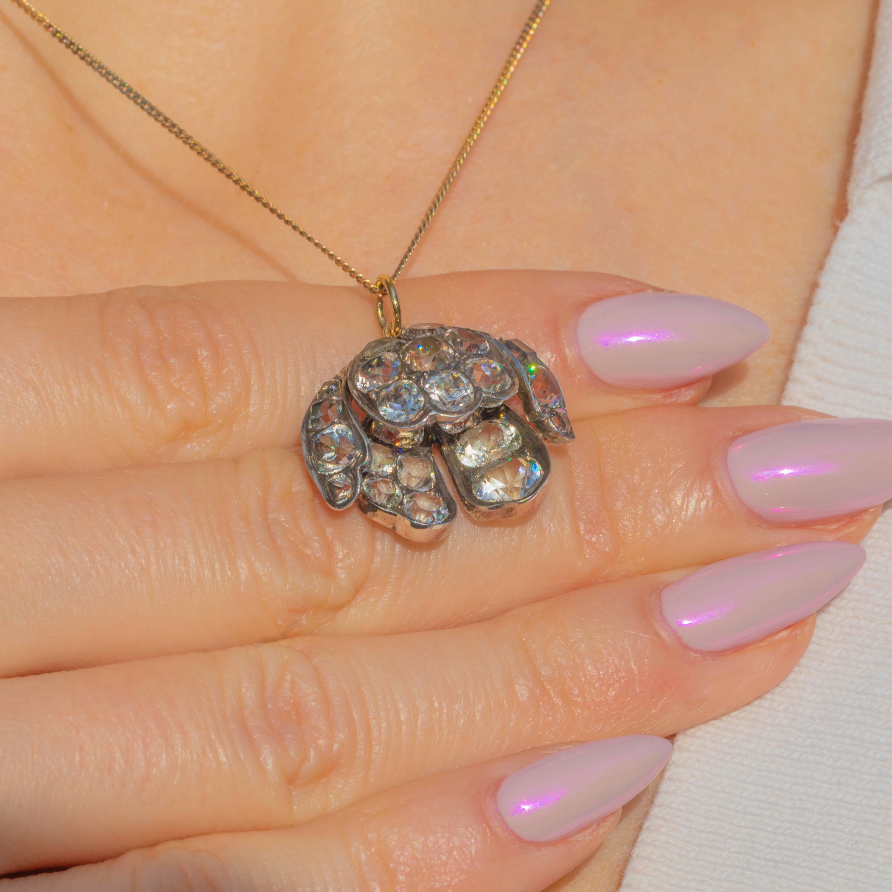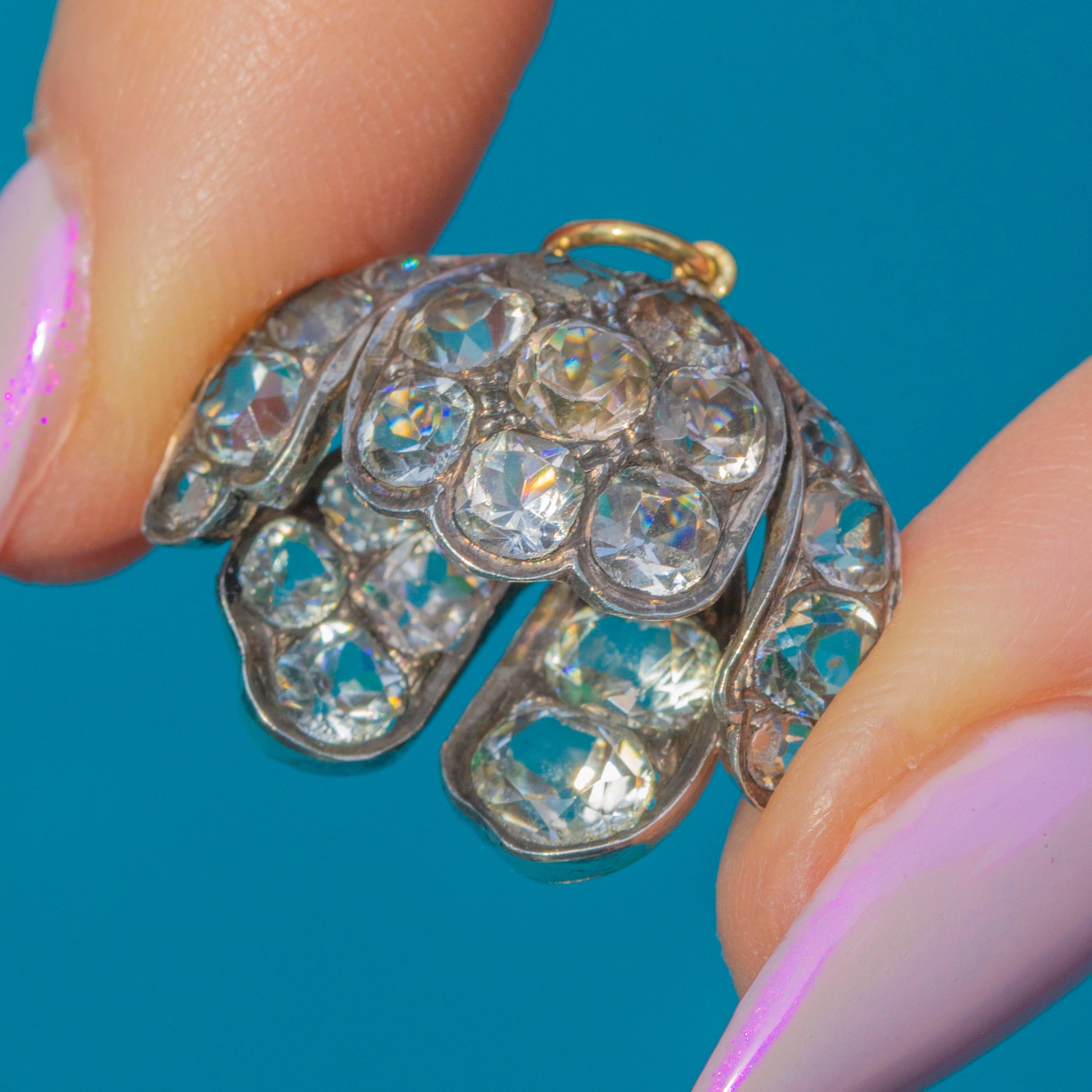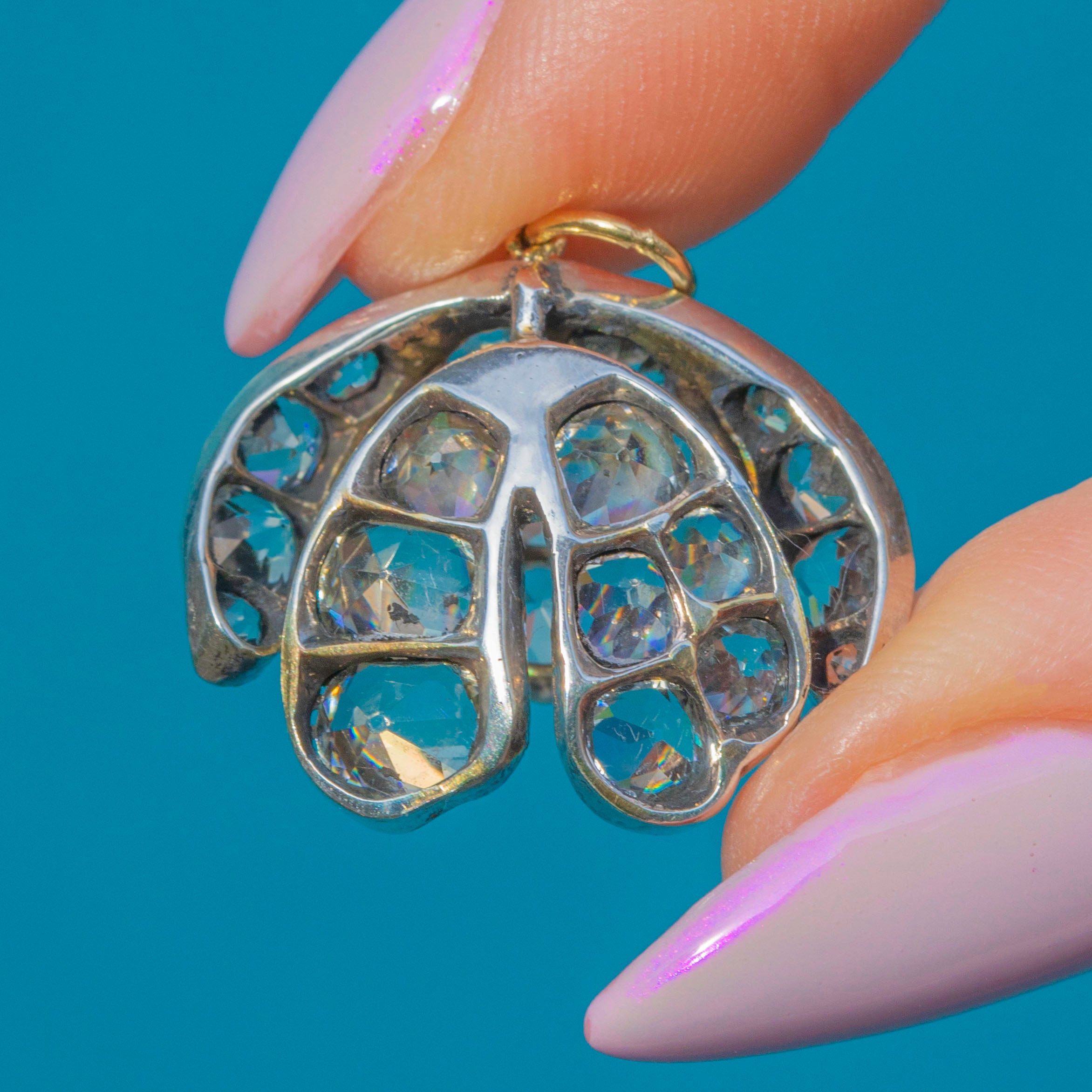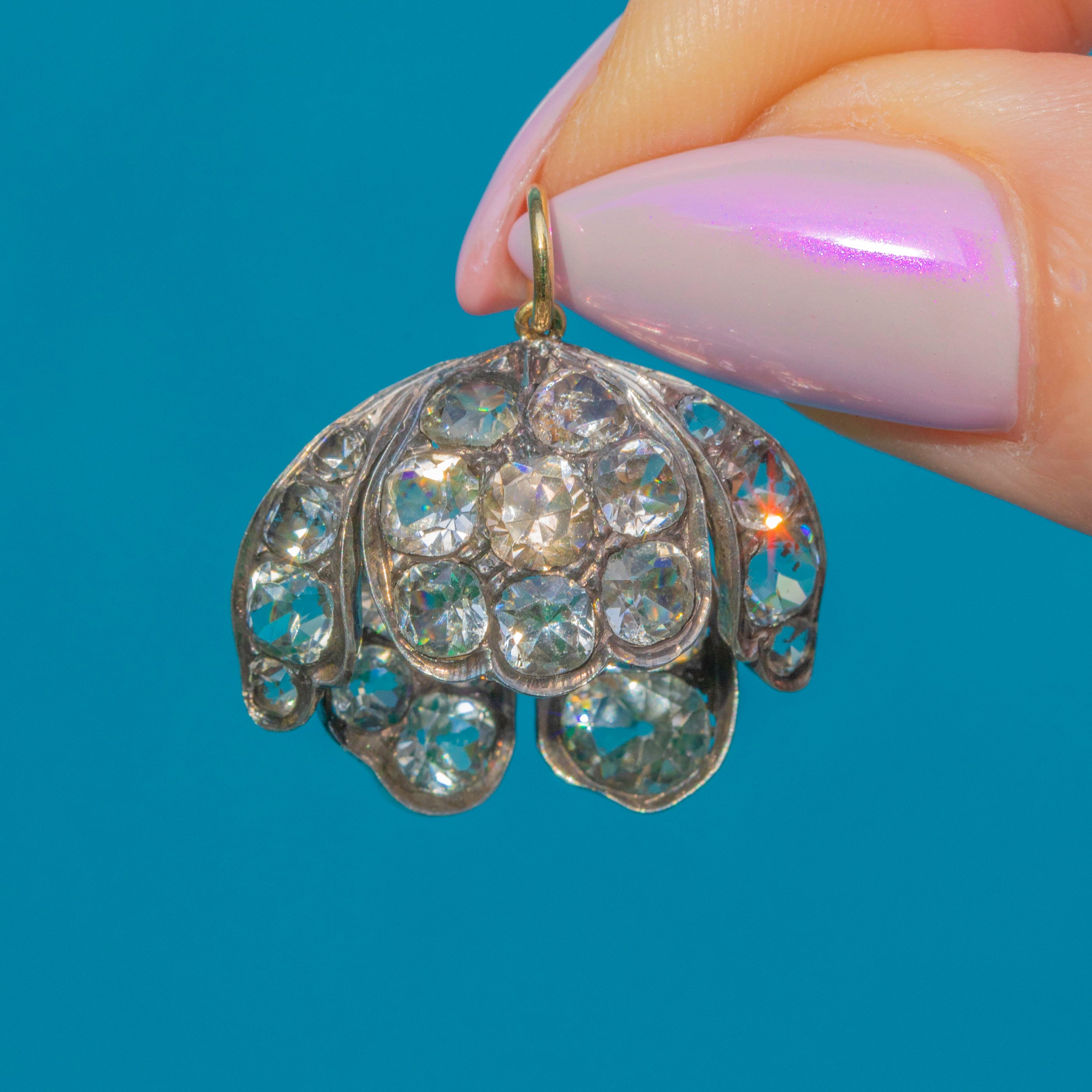 This incredible Victorian flower charm is exquisitely made in a two-tone mix of 18ct Gold and Silver, pavé-set with bright white hand-cut Paste. Formed as a three-dimensional bloom with layered, scalloped petals, it shimmers beautifully from every angle and gives a wonderfully “diamond” look with all the romance of the 19th century.