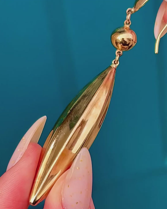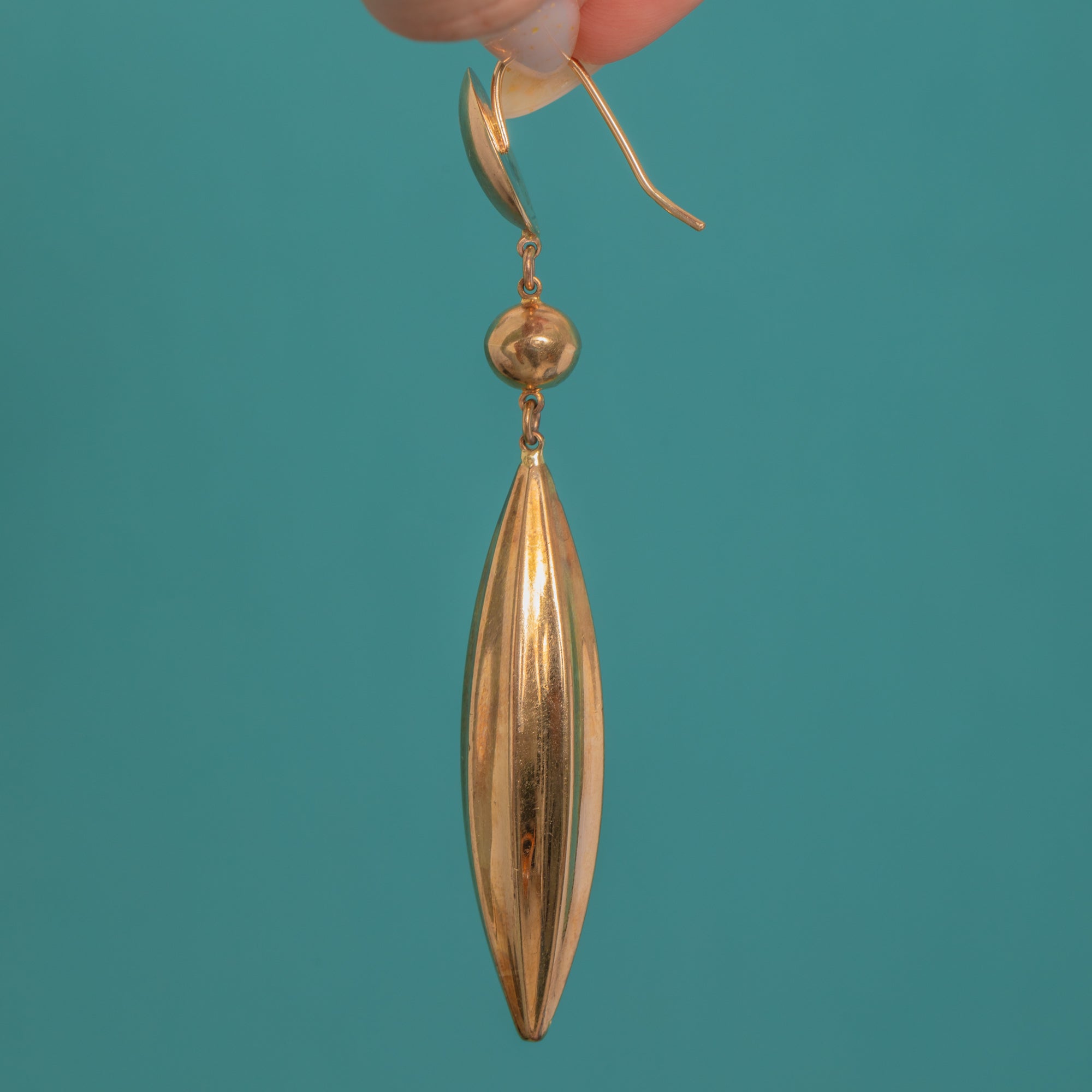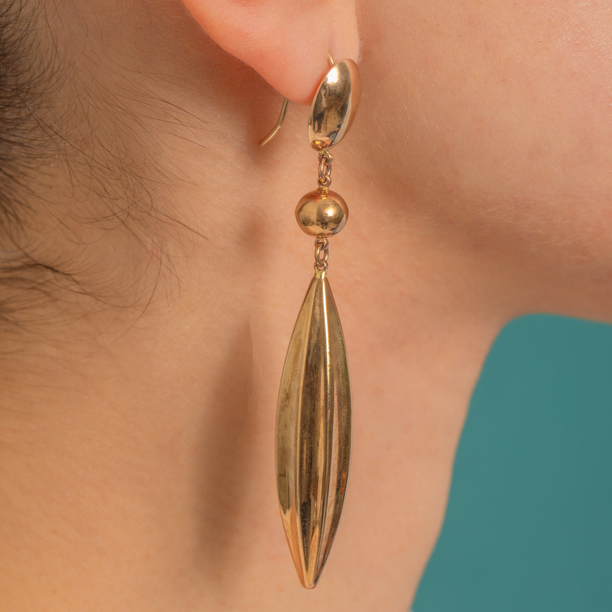 Sleek, elongated, and effortlessly elegant, these Victorian torpedo drop earrings are crafted in glowing 9ct Gold. A domed oval surmount flows to a petite bead connector and culminates in streamlined navette drops with a raised central ridge, all finished in a high, mirror-like polish for a sculptural silhouette.