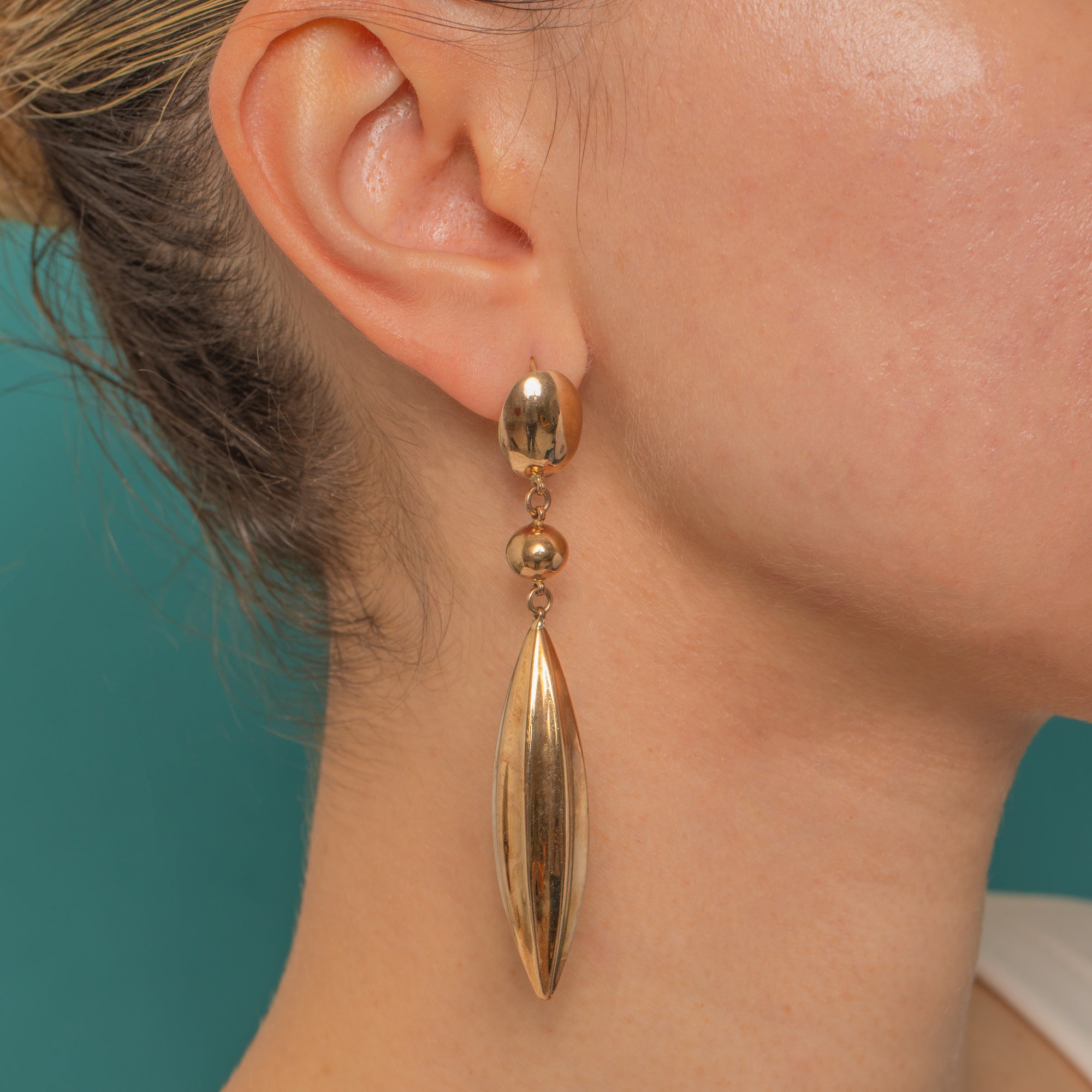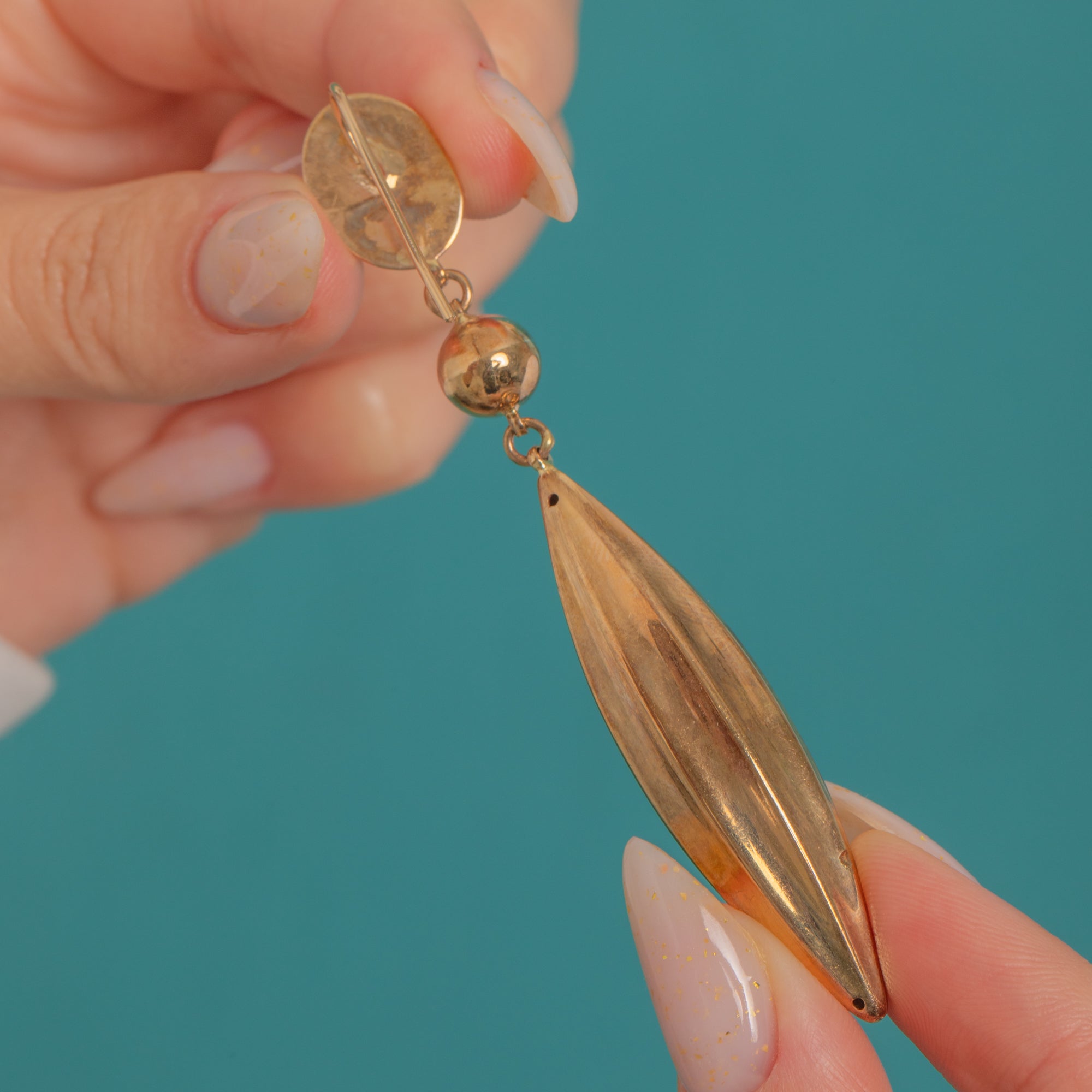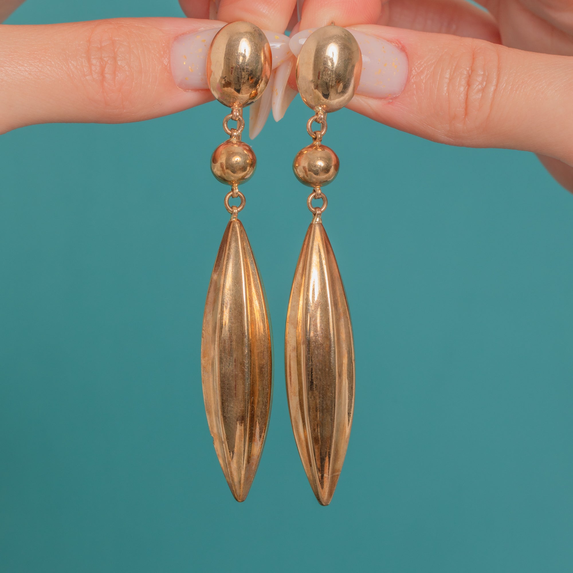 Sleek, elongated, and effortlessly elegant, these Victorian torpedo drop earrings are crafted in glowing 9ct Gold. A domed oval surmount flows to a petite bead connector and culminates in streamlined navette drops with a raised central ridge, all finished in a high, mirror-like polish for a sculptural silhouette.