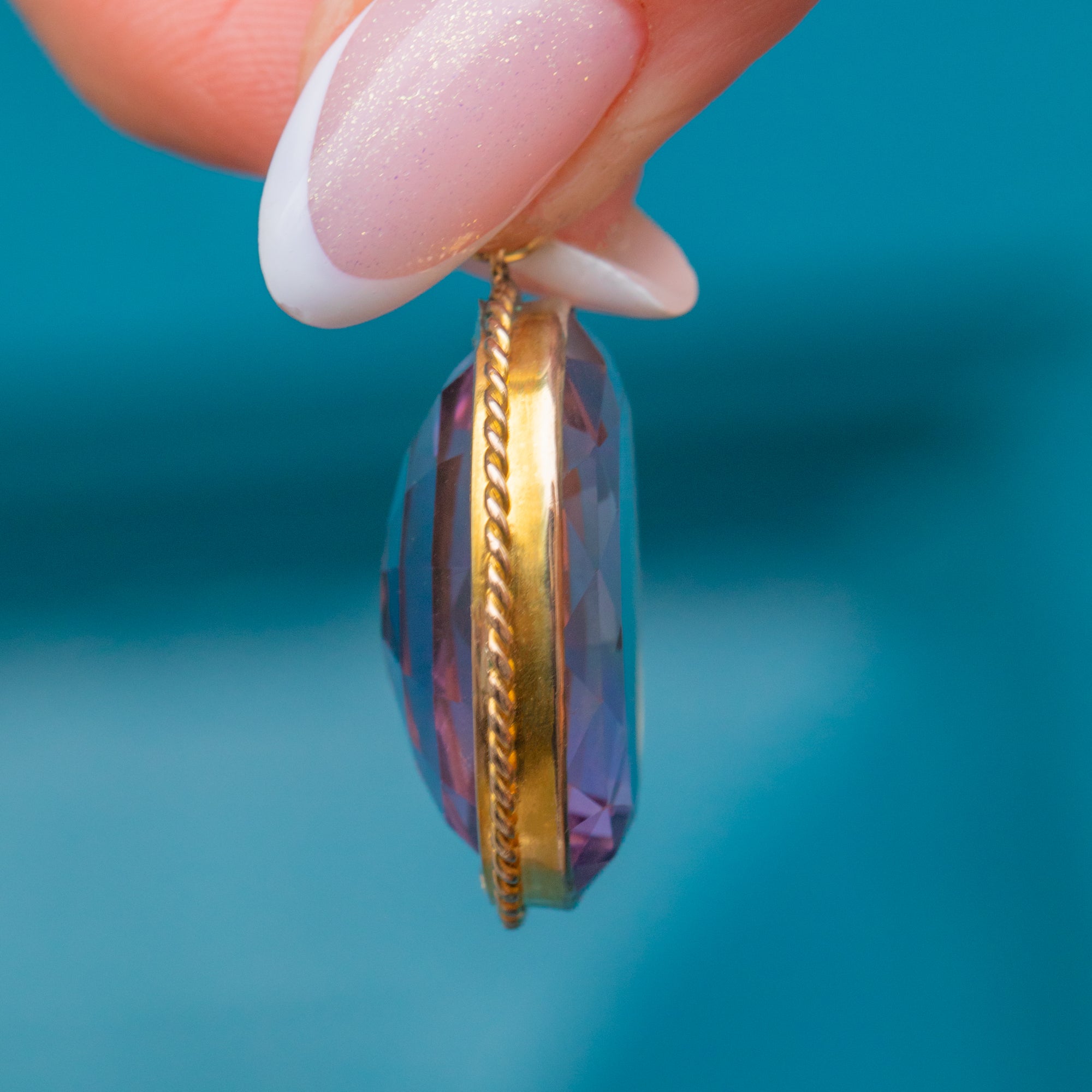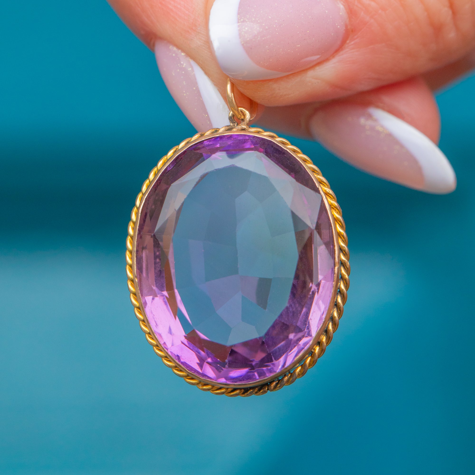 VERY GOOD-EXCELLENT: This large antique 9ct Gold Amethyst oval pendant is in lovely condition. The Amethyst is impressive in size and has a crisp set of hand-cut facets. Upon turning the Amethyst over, you will notice a small fleabite on the back, which is only visible under close inspection and cannot be seen from the front. The Gold is bright and the rope detail has remained defined. With plenty of wearability, don't hesitate to make this Victorian pendant your newest acquisition!