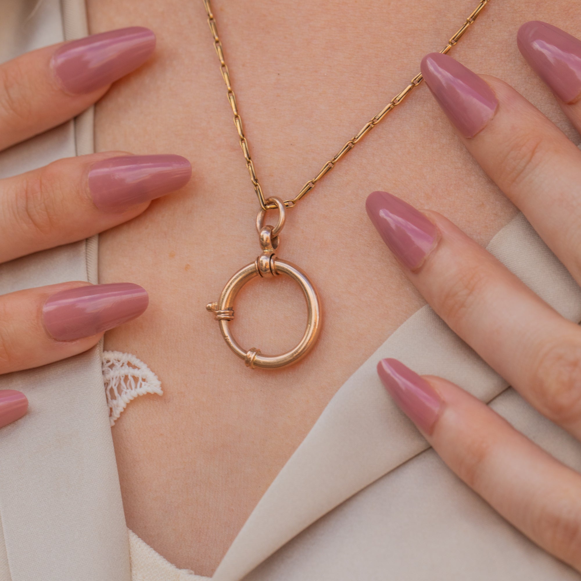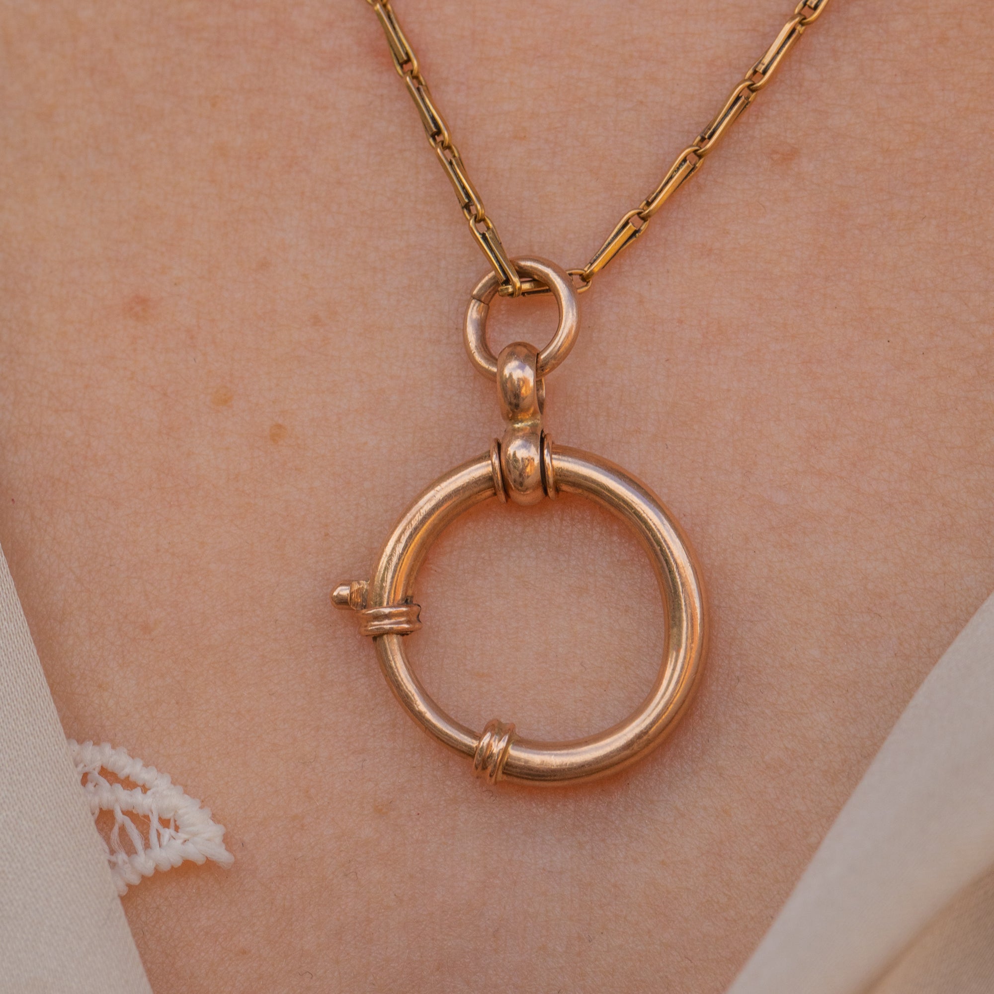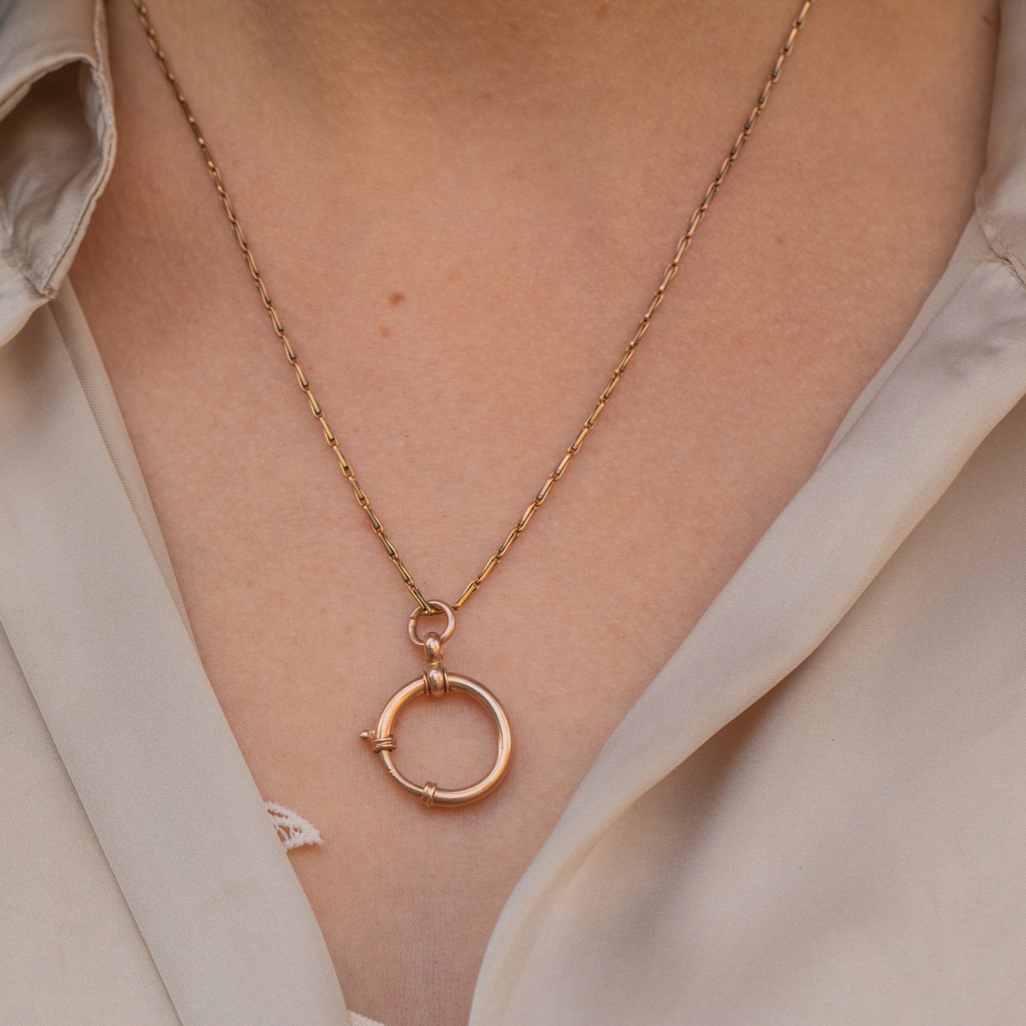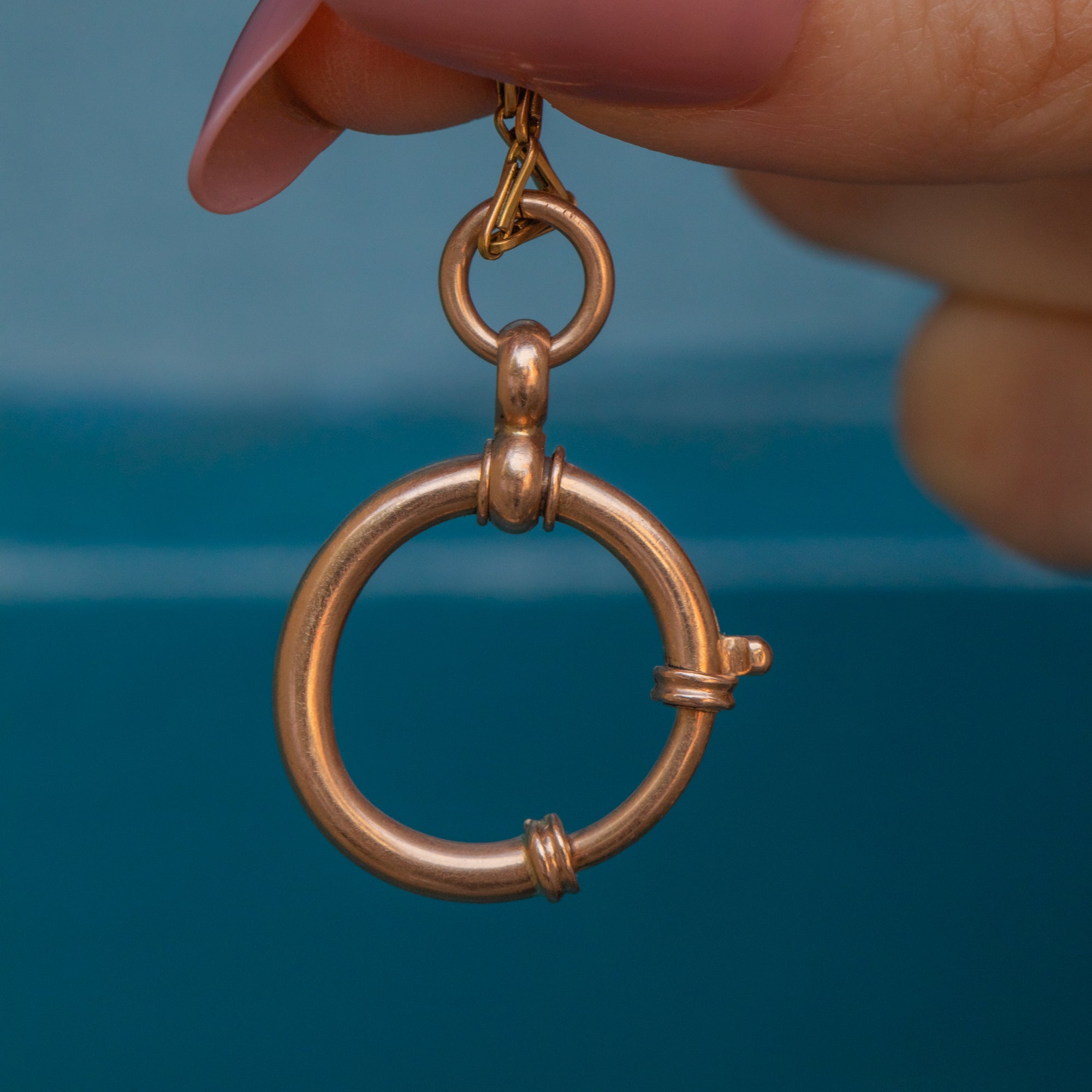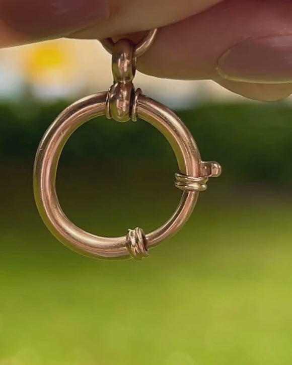 EXCELLENT. This antique bolt-ring is in excellent condition. The bolt-ring has a lovely large size with a wonderful rosy hue. Although there is a little bend in its form, the bolt ring is in perfect working order, and the spring mechanism will allow you to wear charms or pendants confidently.