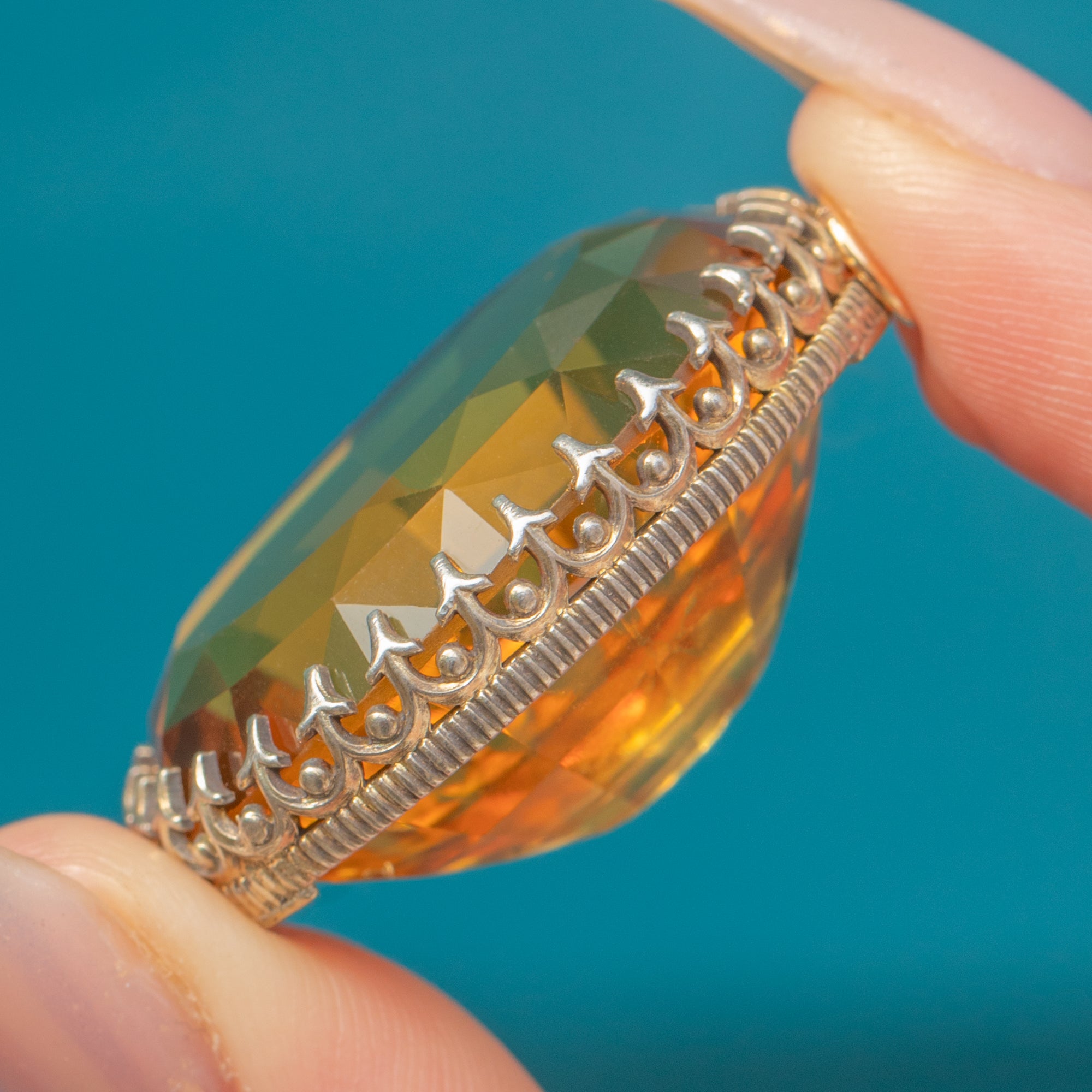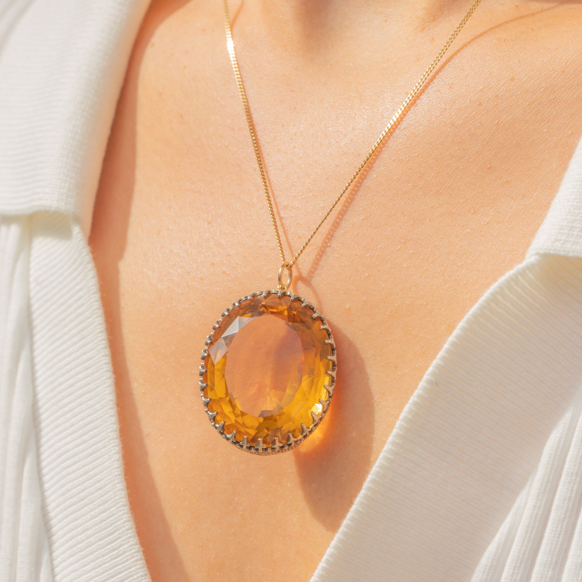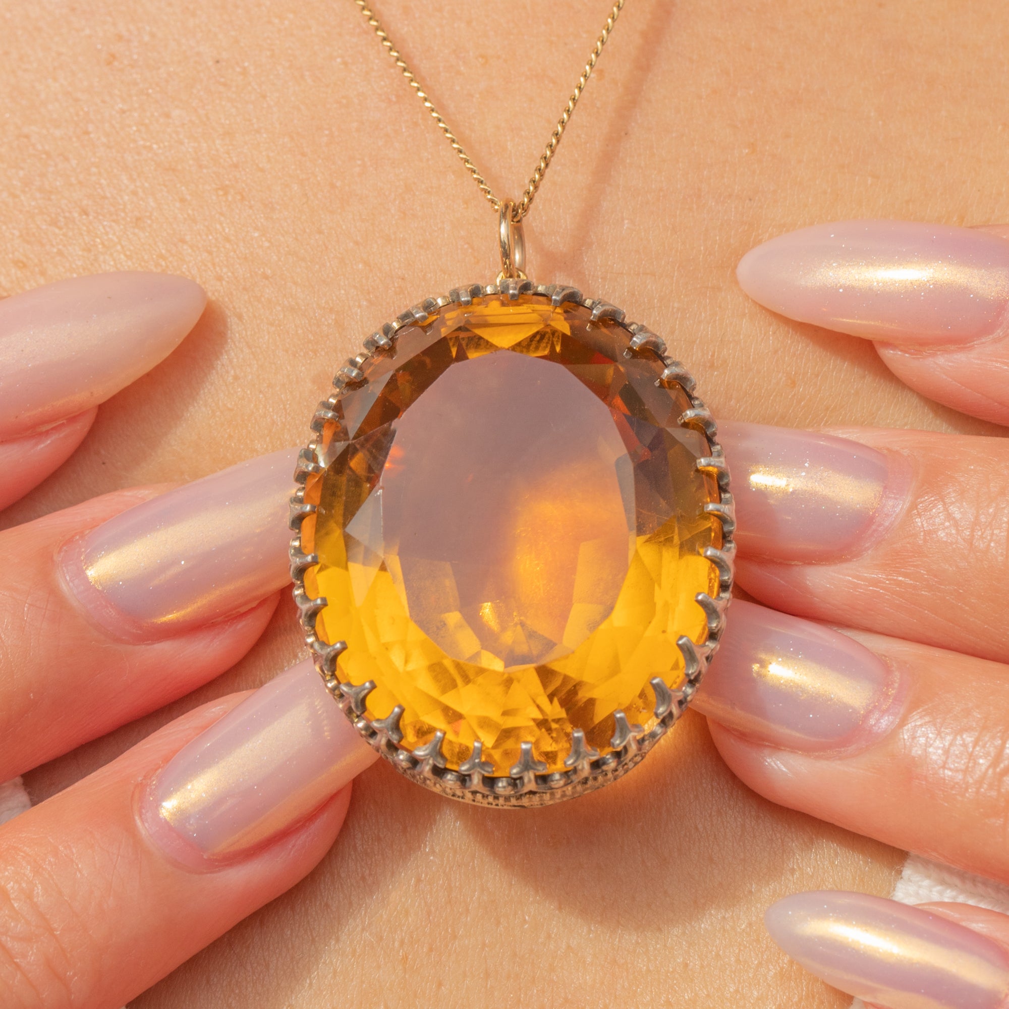 EXCELLENT: The Citrine presents beautifully with crisp facet junctions and only the lightest natural surface wear under magnification. The claw setting is secure and well-formed with no bent or missing claws. Overall the pendant has been carefully preserved, with minimal signs of age-related wear.