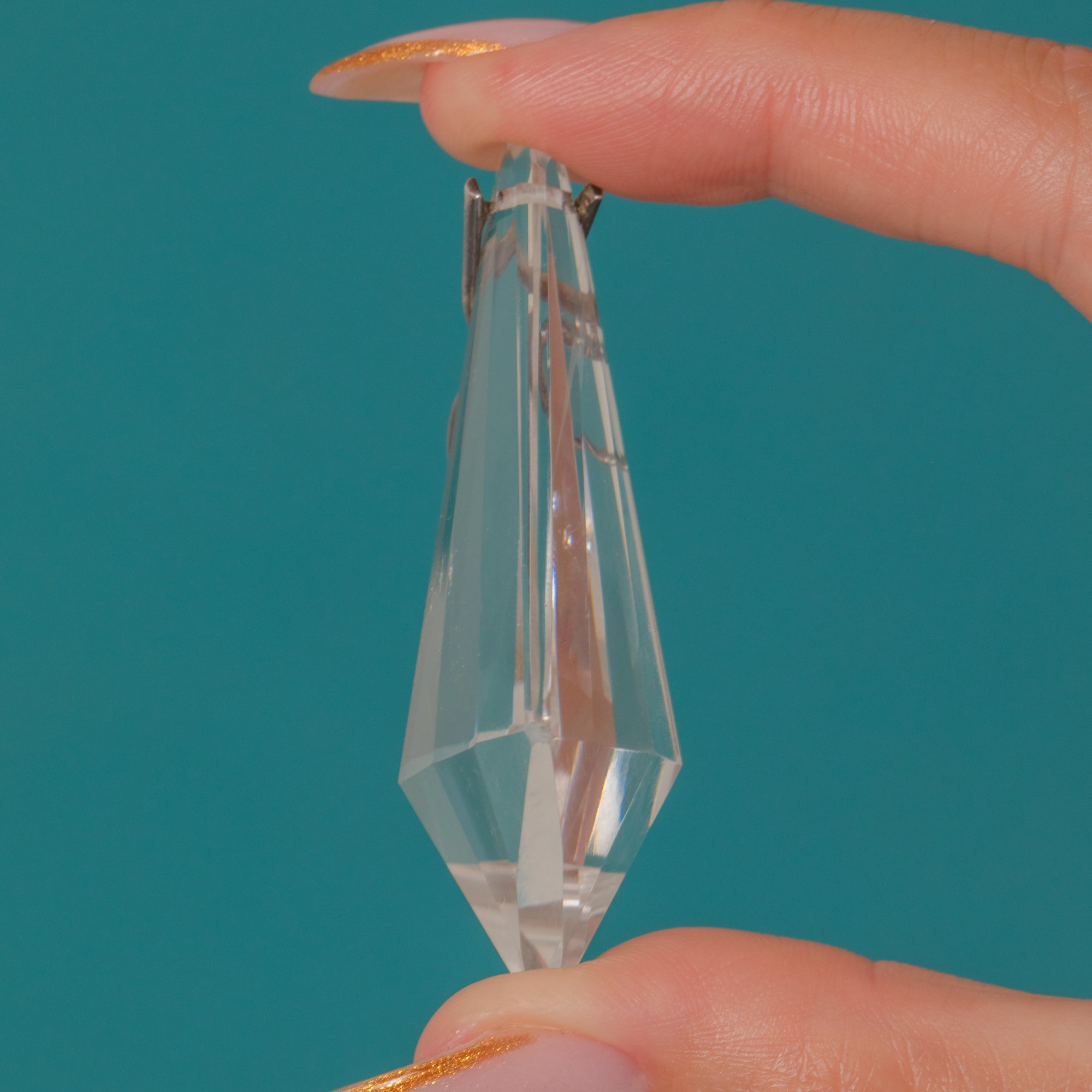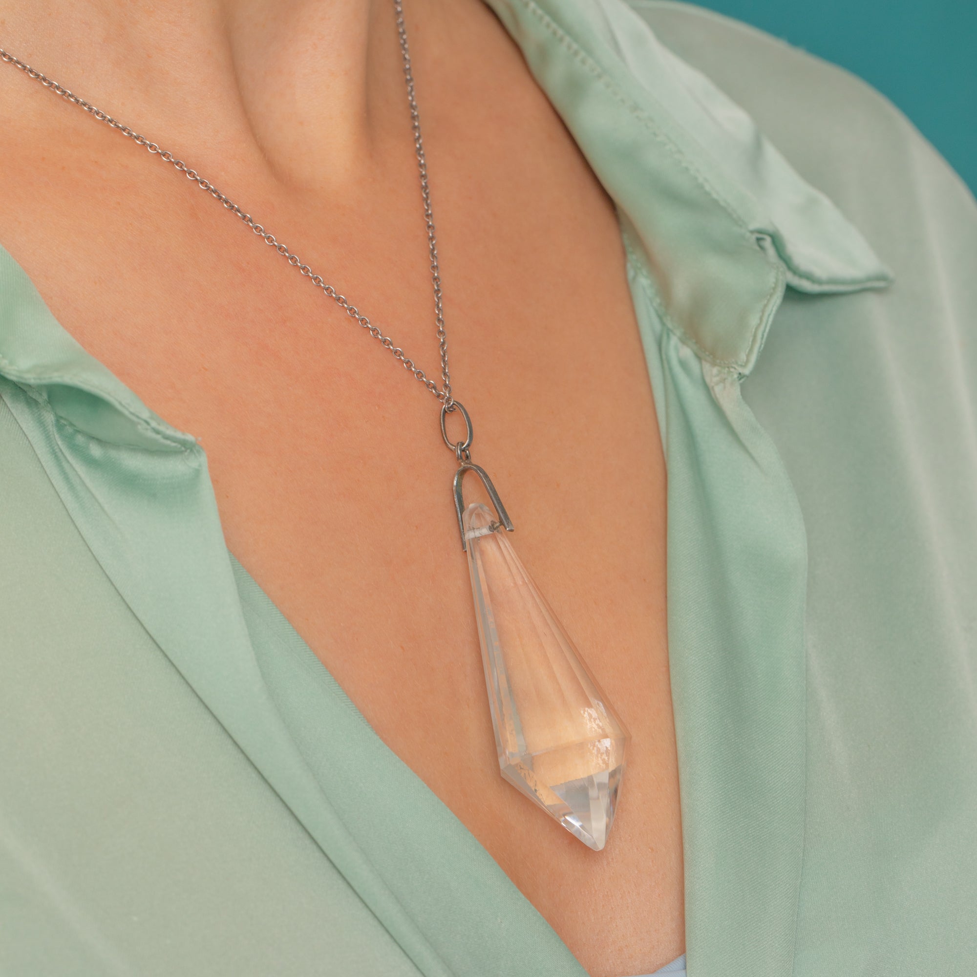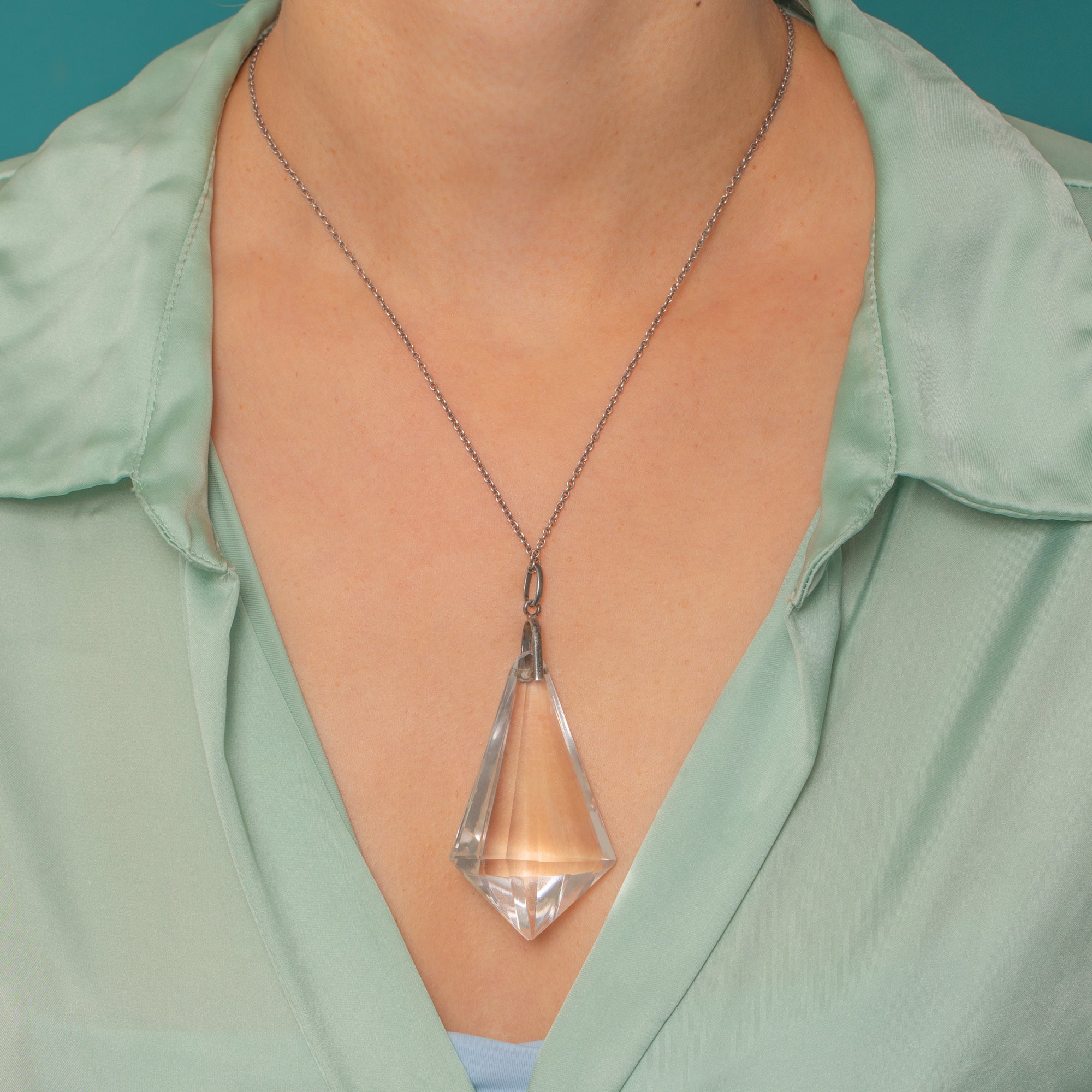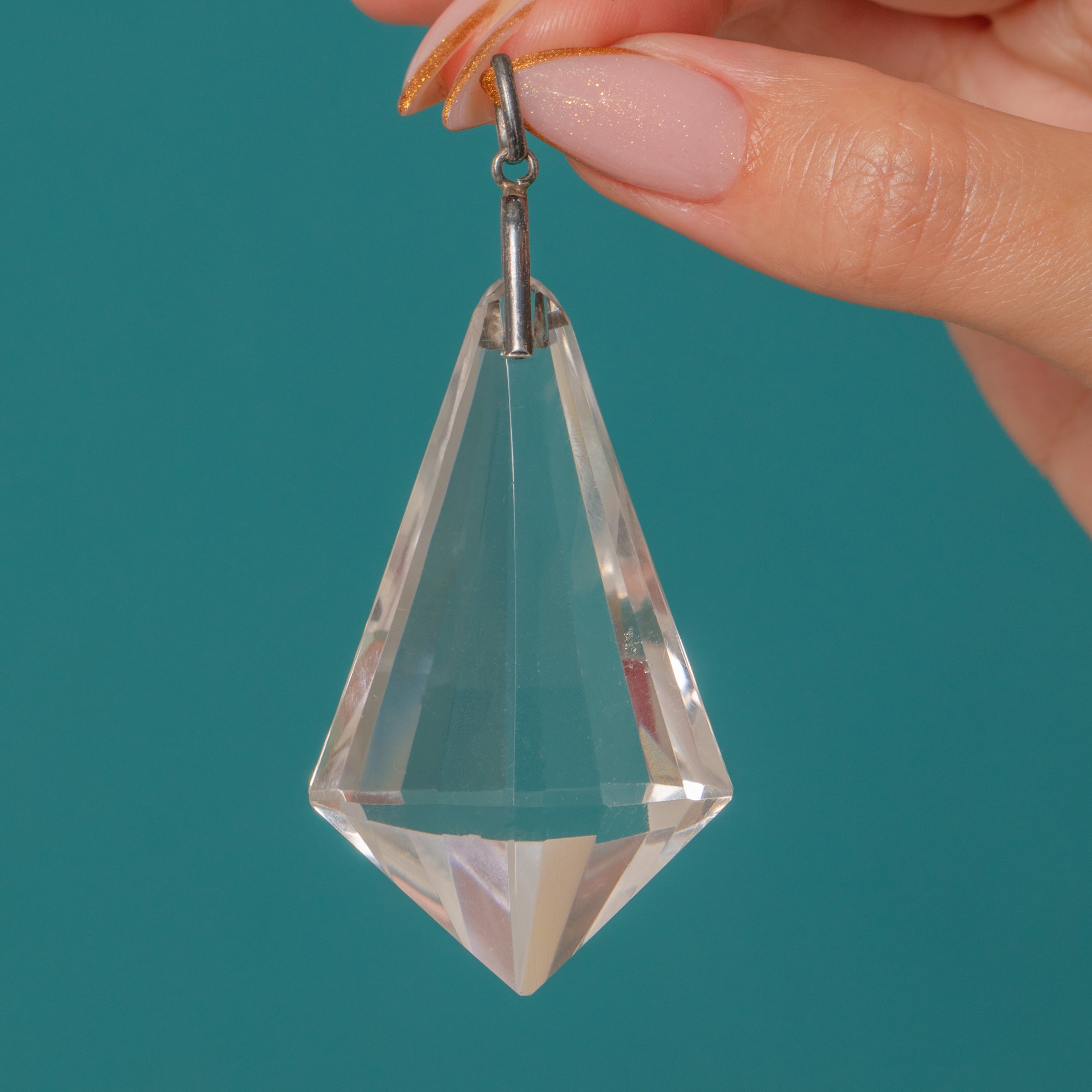 This spectacular Art Deco pendant features a huge 120.00ct Rock Crystal carved into a bold geometric form, enhancing the natural clarity and brilliance of the stone. Substantial and eye-catching, the clean lines and faceted surfaces capture light beautifully, giving the Crystal an almost liquid radiance.