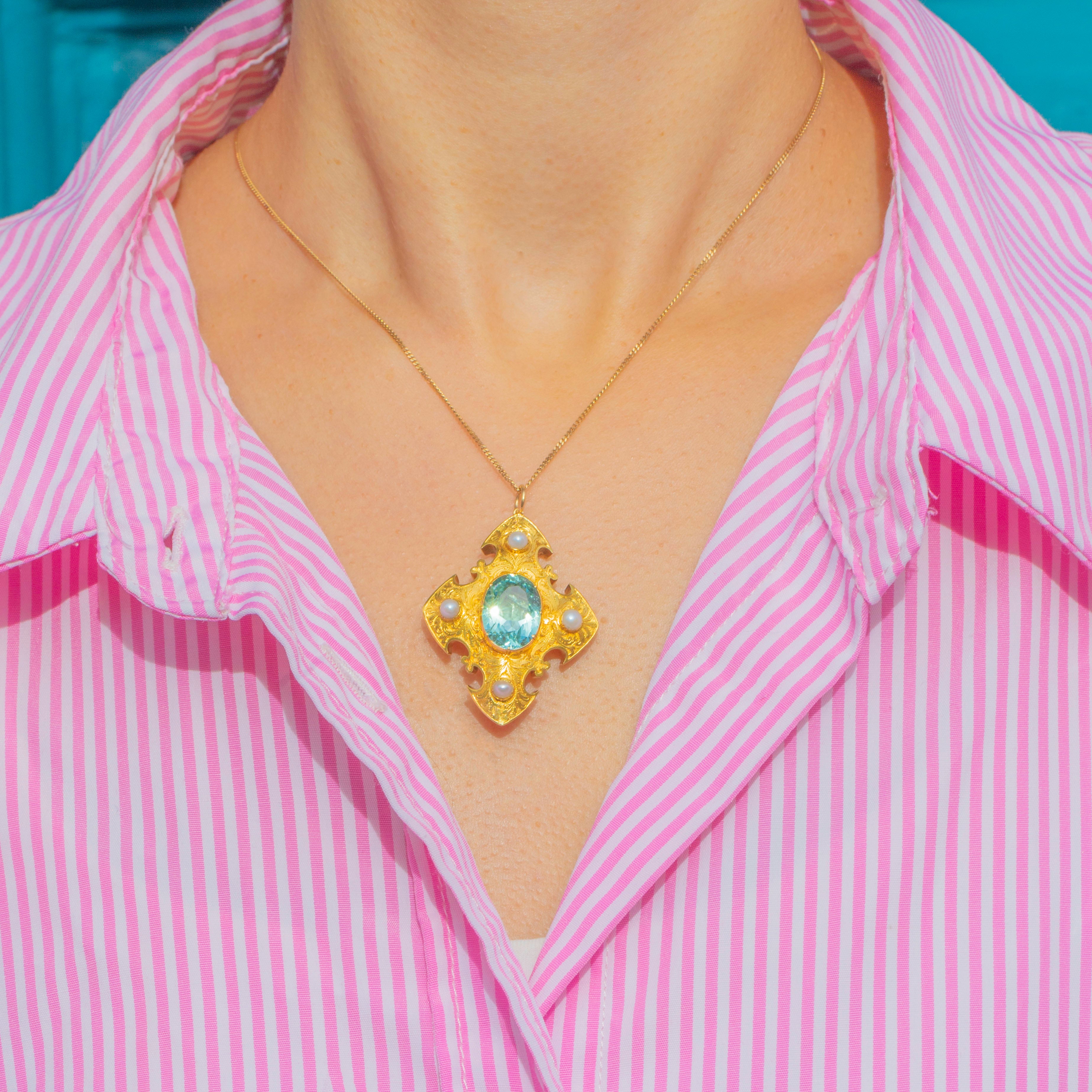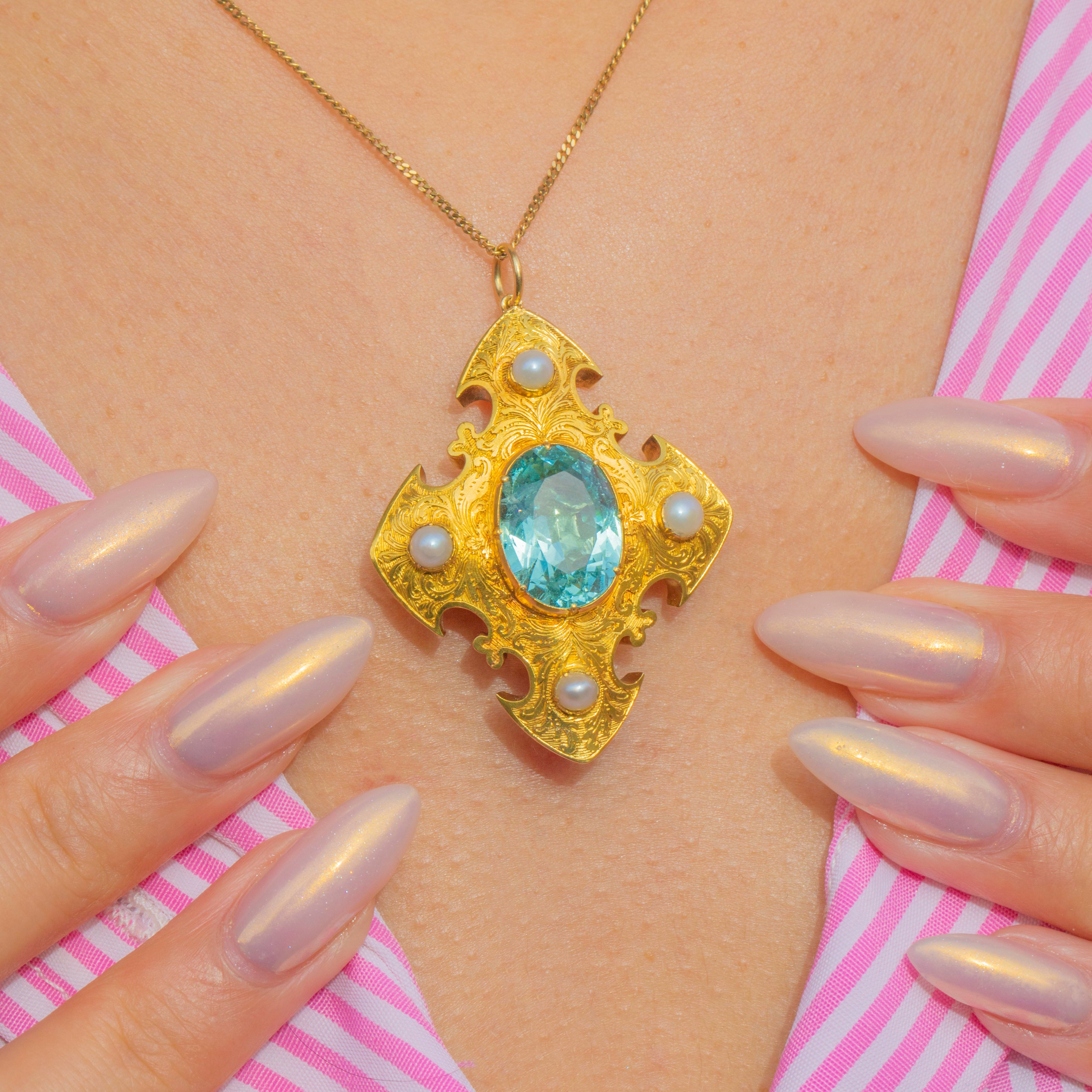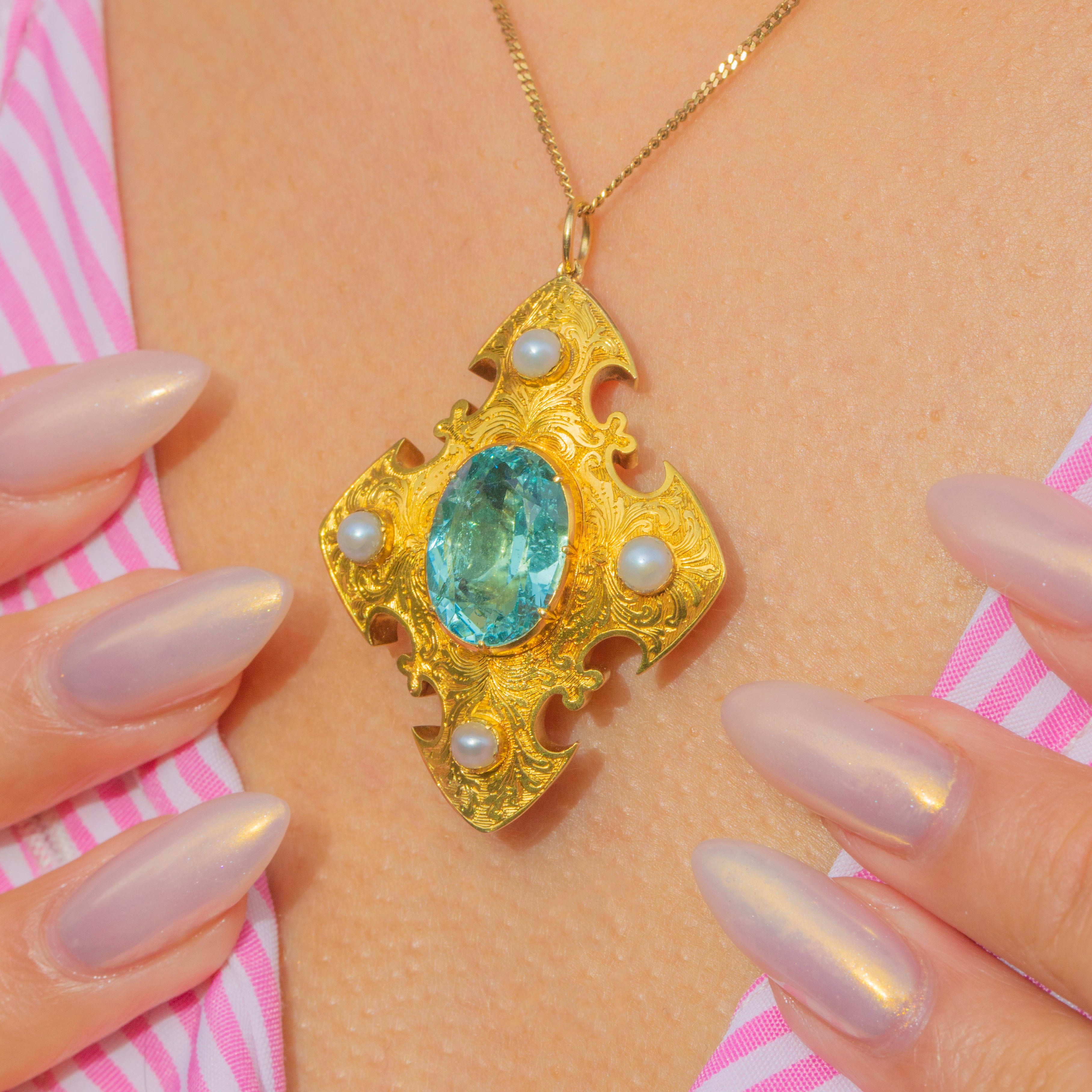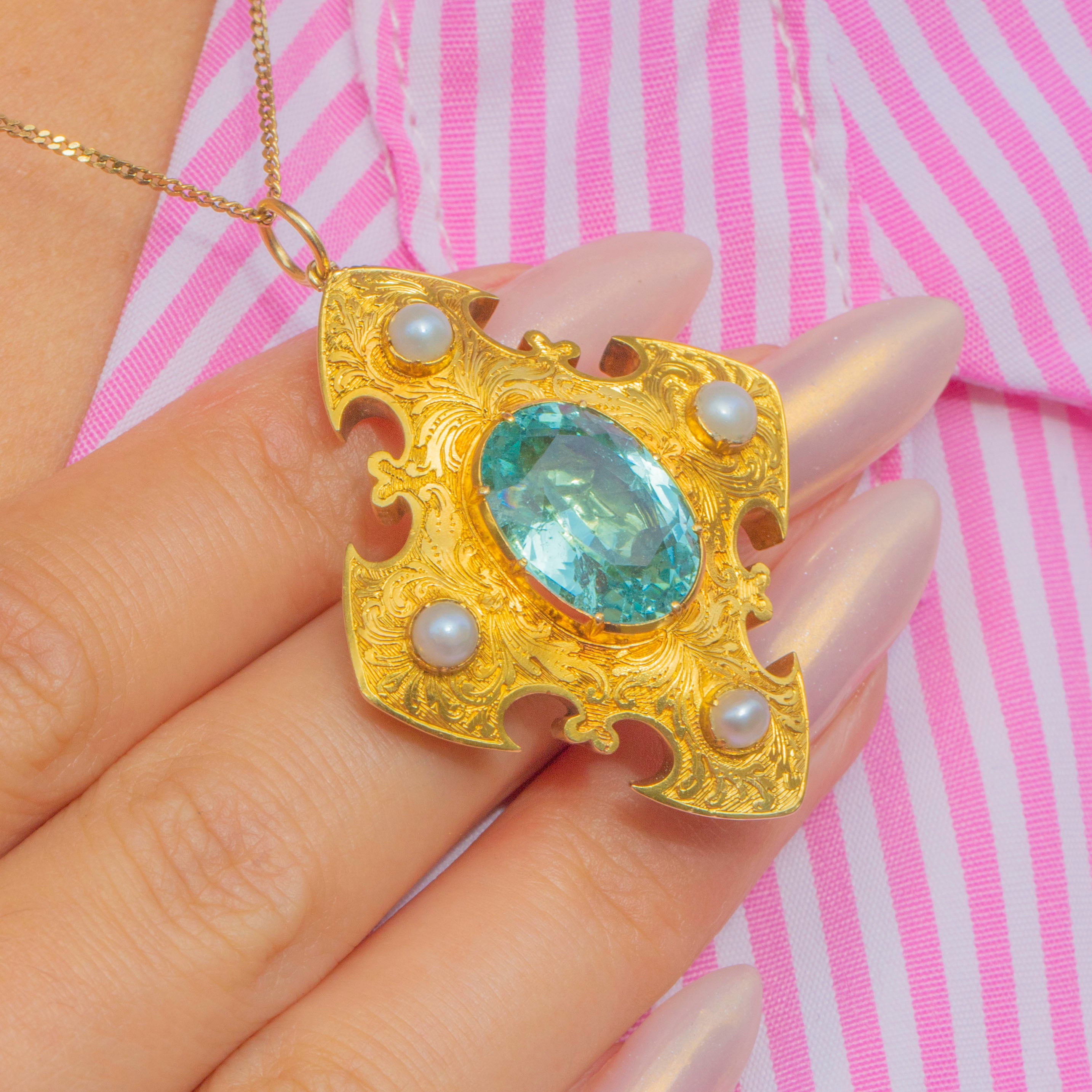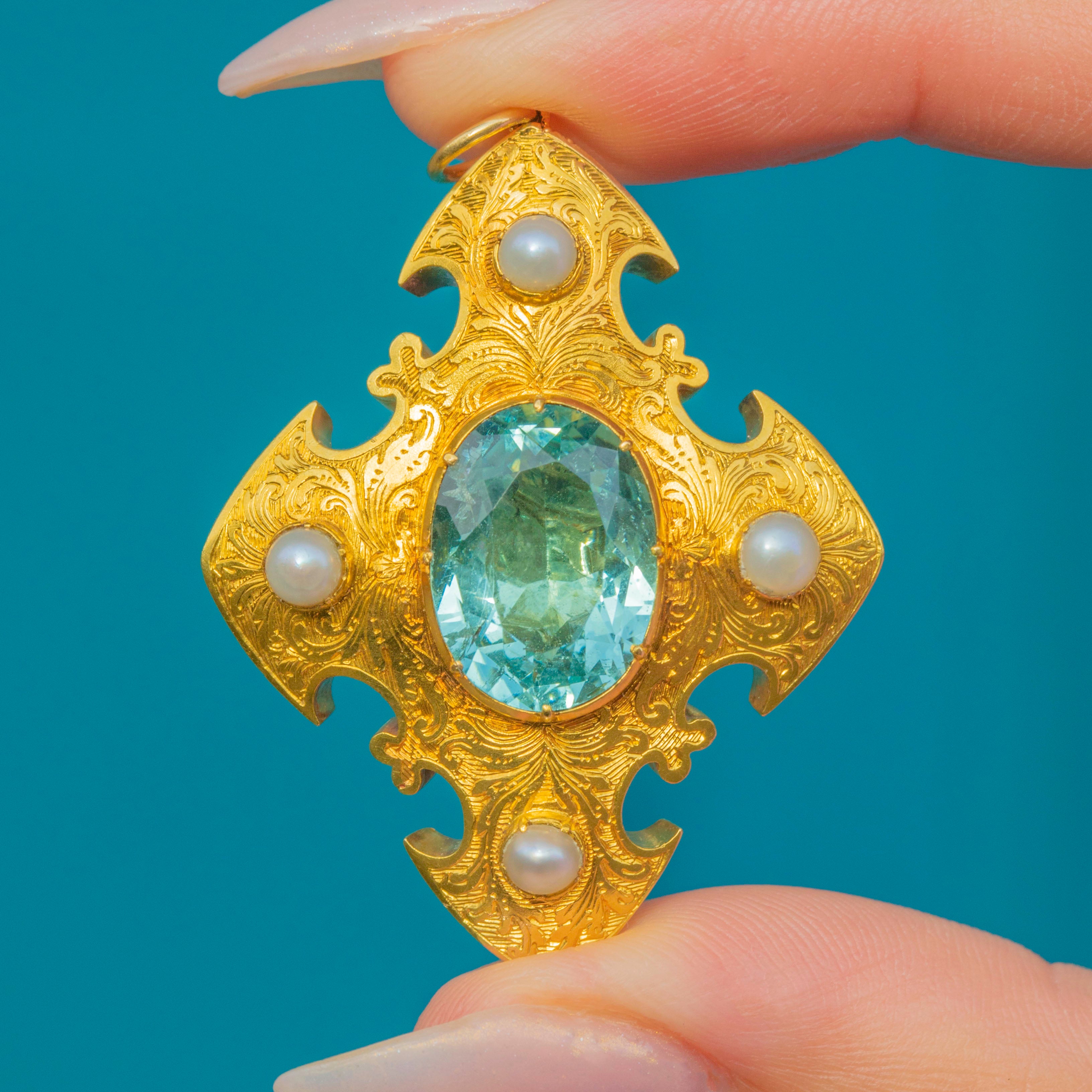 Large Engraved 18ct Gold Foiled Aquamarine Pearl Pendant, c.1850