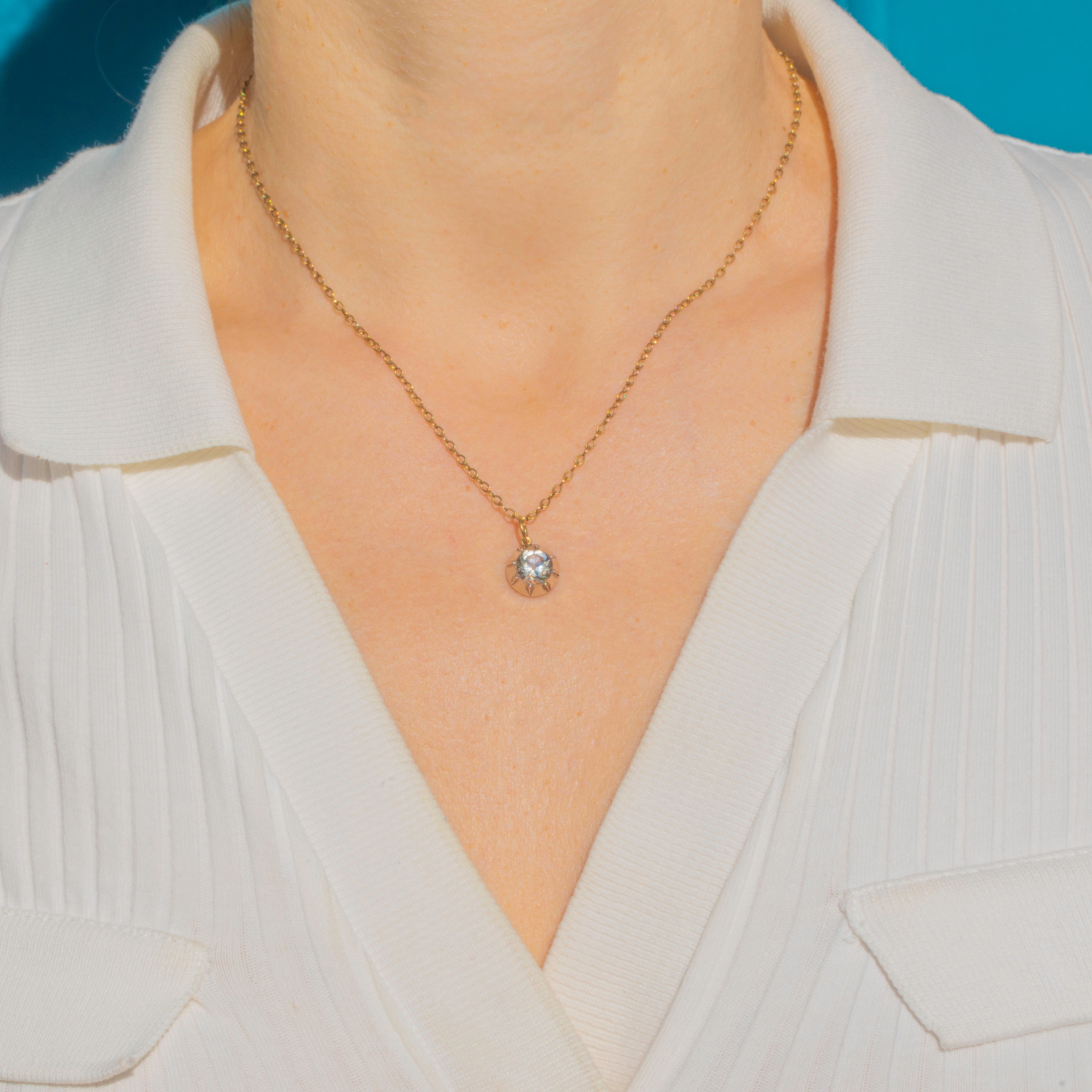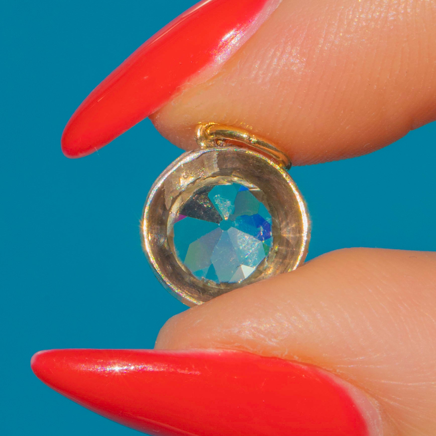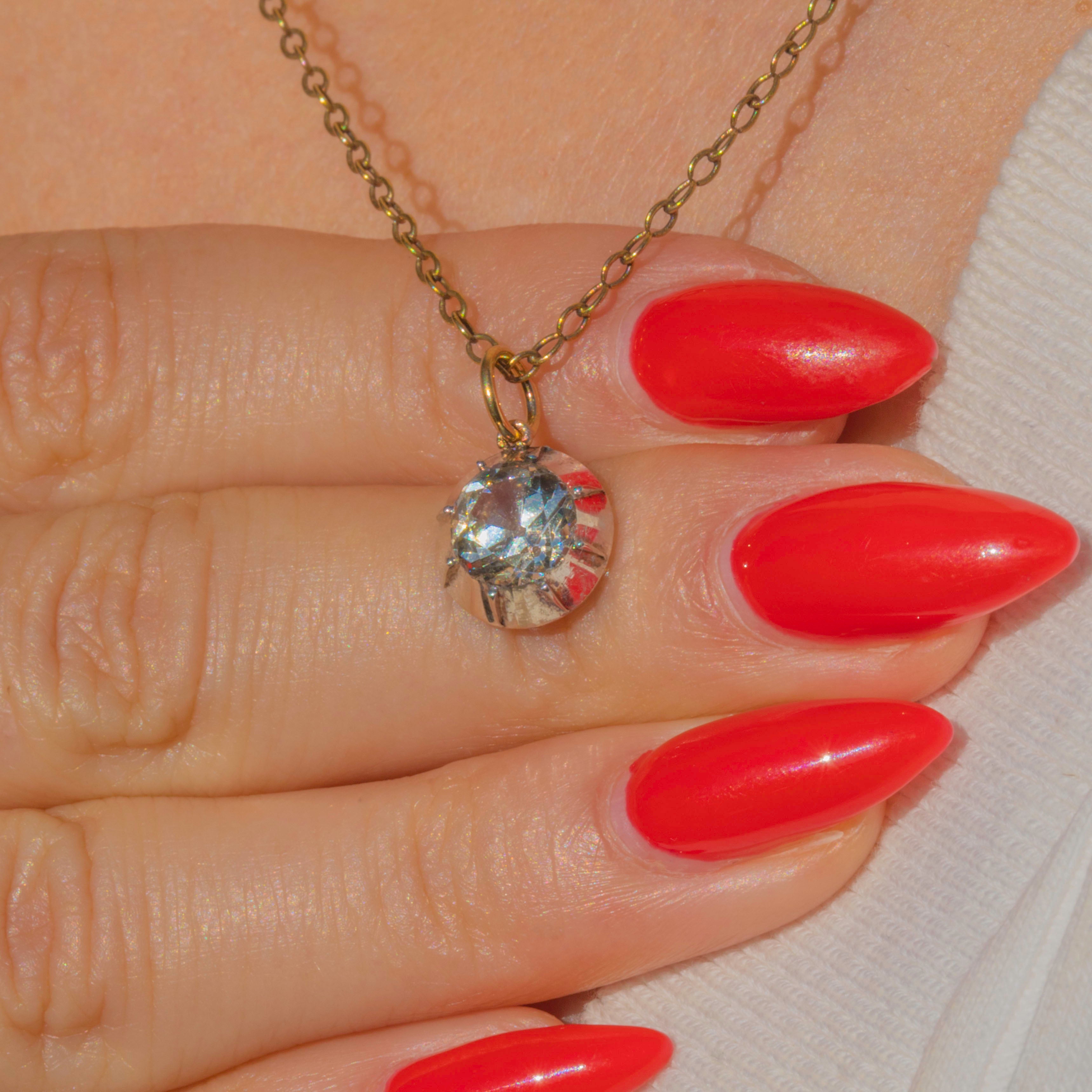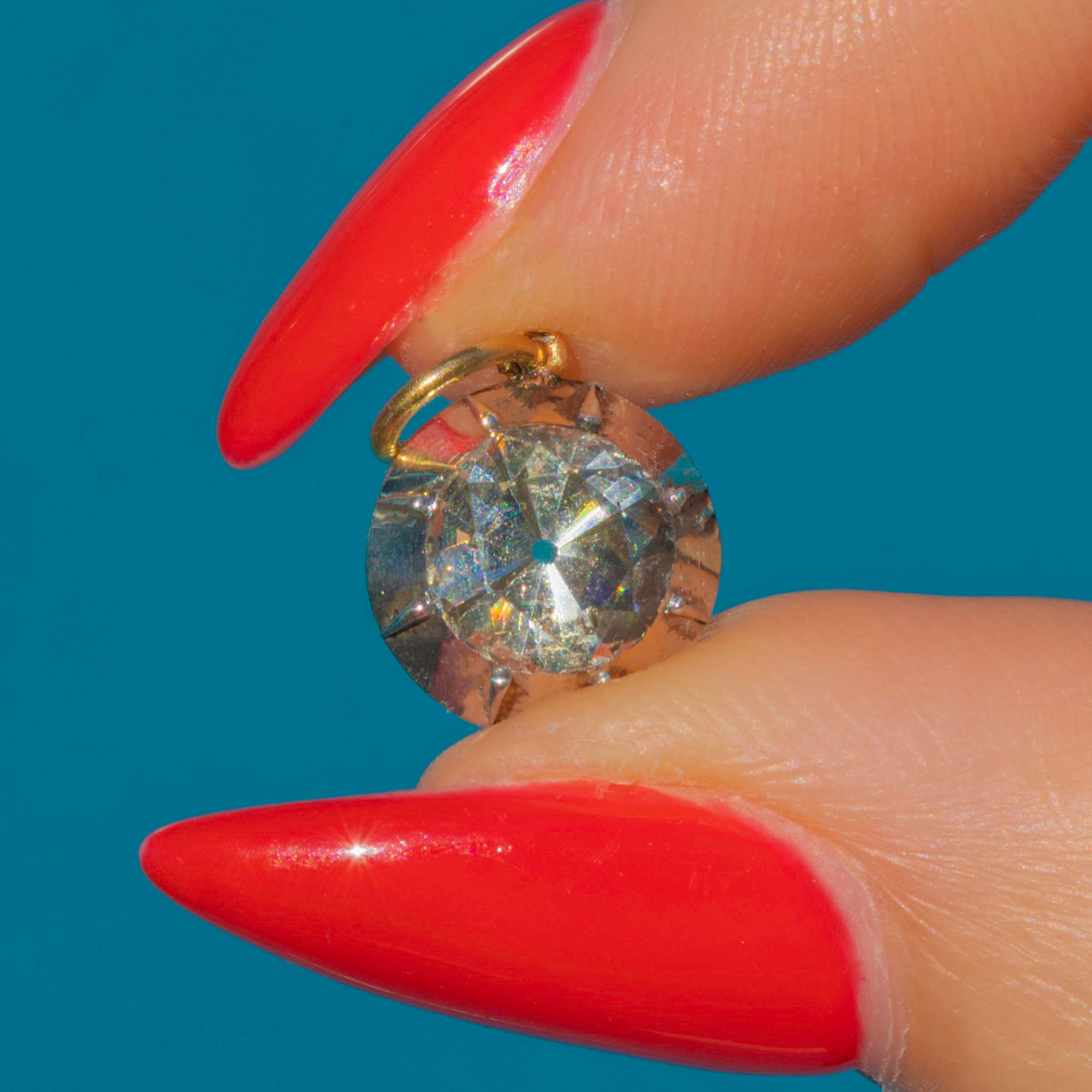 This impressive Georgian charm is crafted in Silver with an 18ct Gold jump ring, set with a sparkling white Paste stone. Measuring 6.6mm in diameter, the Paste is equivalent in size to a 1.10ct Diamond, offering a bold, glittering look at a fraction of the price of a natural gemstone.