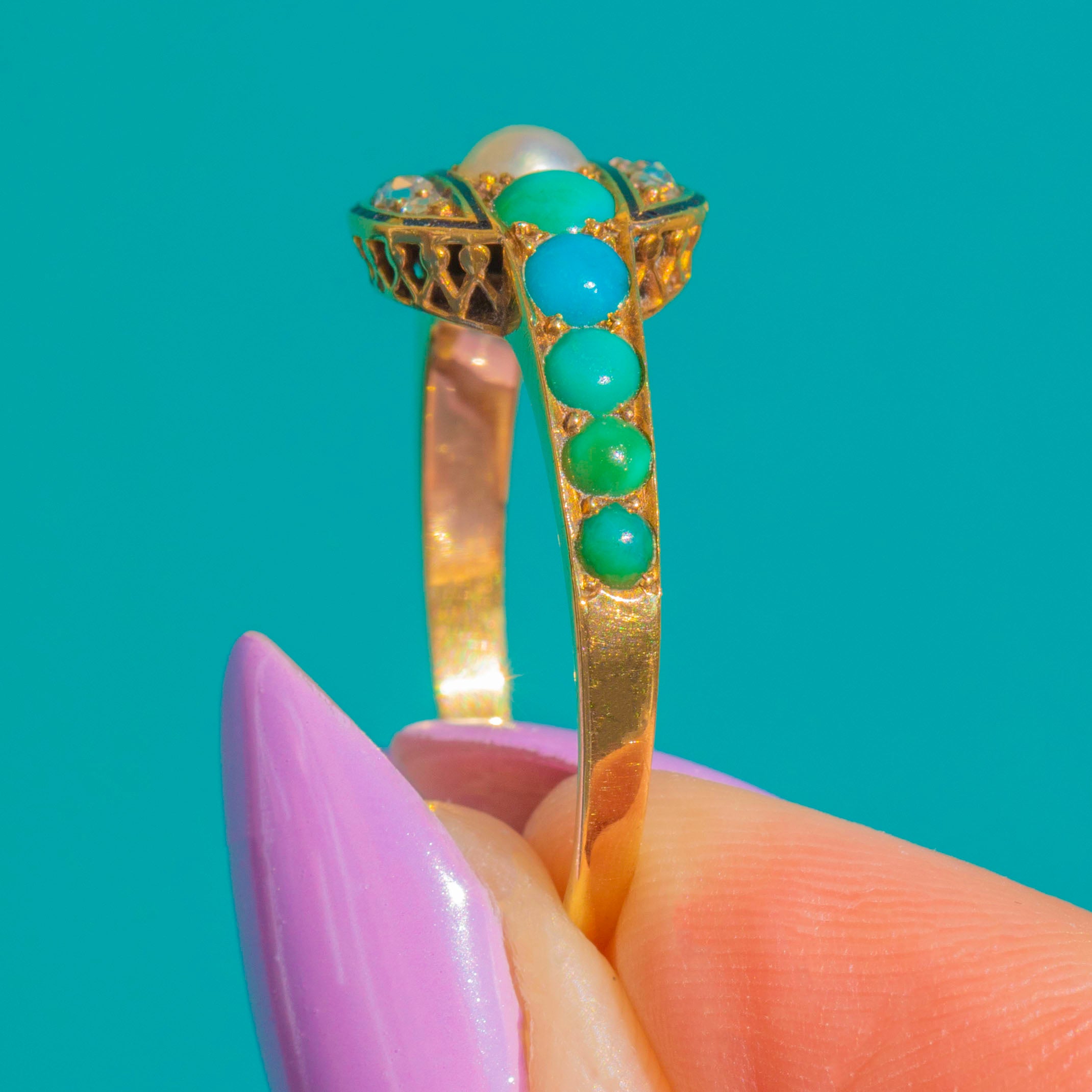 豊かな18金ゴールドで仕立てられた、後期Victorian期の美しいリング。低く丸みを帯びたヘッドの中心には、艶やかなナチュラルパールが輝き、その周囲を繊細なブラックエナメルの三日月が囲み、ローズカットダイヤモンドがきらめきを添えています。ショルダーにはグラデーションのトルコ石カボションが優雅なラインを描き、ダックエッグブルーから穏やかなグリーンブルーへと移ろう色彩が、柔らかくロマンティックな雰囲気を演出します。