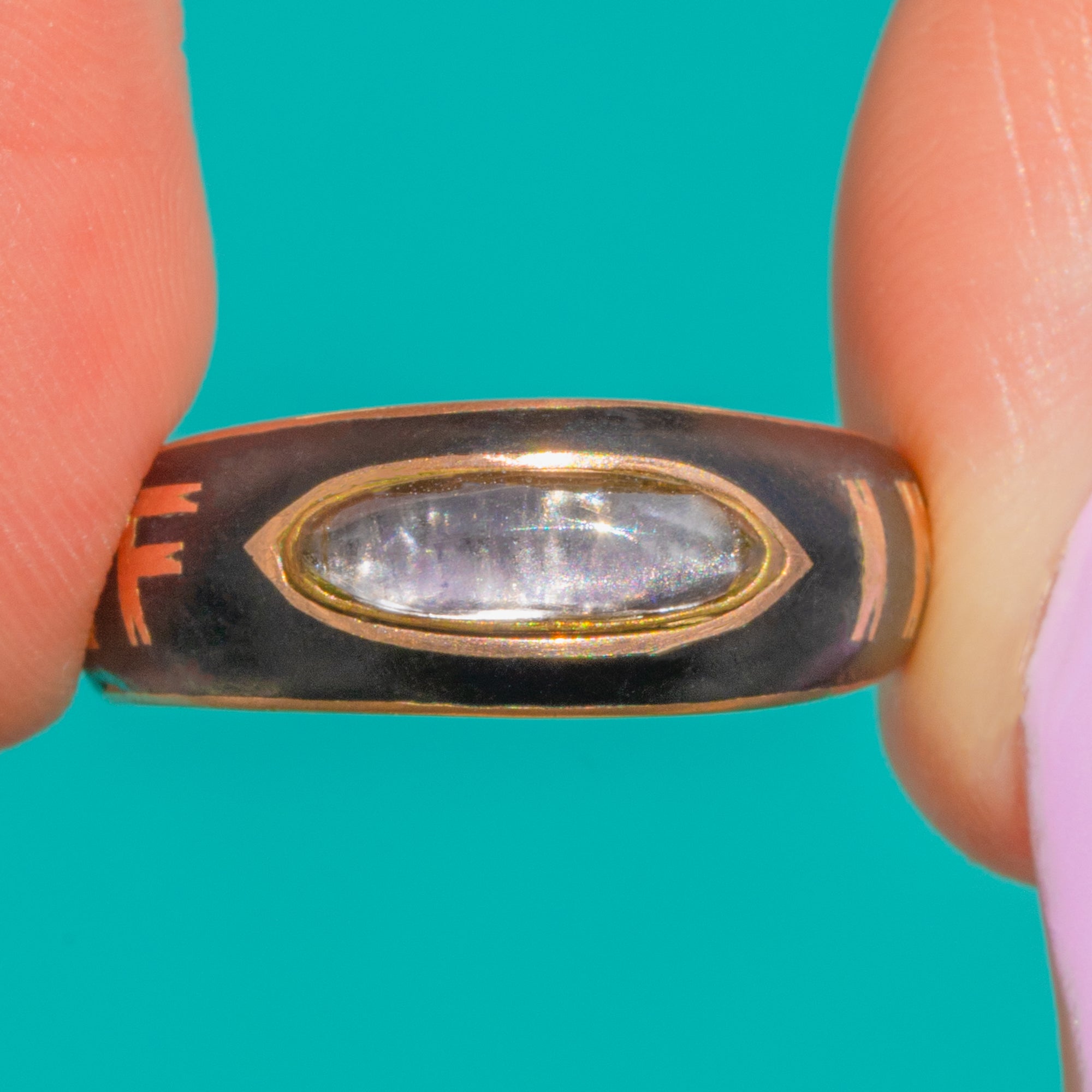 美しく保存された後期Georgian期の“In Memory Of”リング。9カラットゴールドに漆黒のブラックエナメル、そして輝くフォイルドアメシストがあしらわれています。細身で縦長のアメシストは、クローズドフォイルドセッティングによって奥行きのある輝きを放ち、艶やかなブラックエナメルとテーパードゴールドバンドが洗練された静謐なエレガンスを添えています。