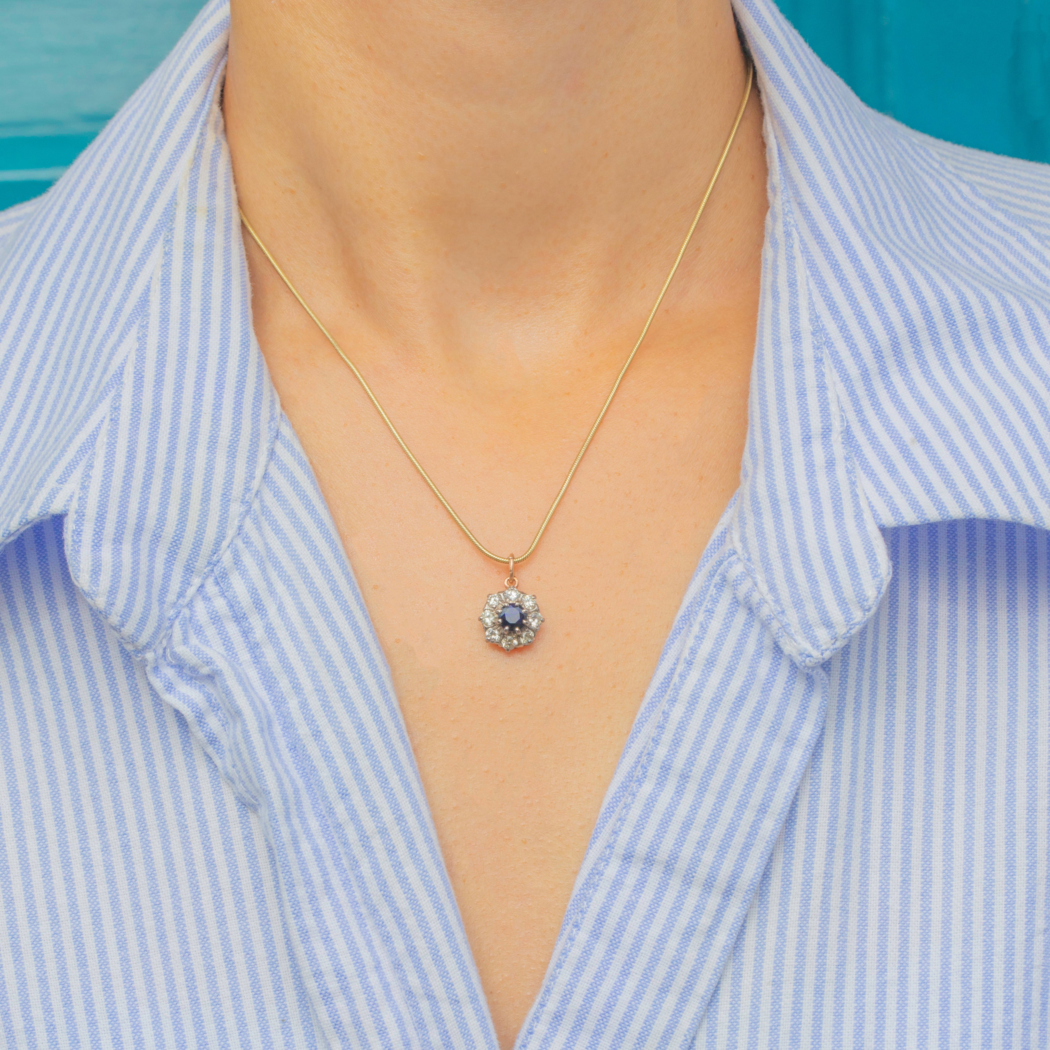 This elegant mid-century Vintage charm is crafted in 9ct Gold and features a vibrant 0.66ct Sapphire encircled by a halo of sparkling Diamonds totalling approximately 0.50cts. The deep blue of the Sapphire contrasts beautifully with the bright brilliance of the Diamonds, creating a timeless and eye-catching design.