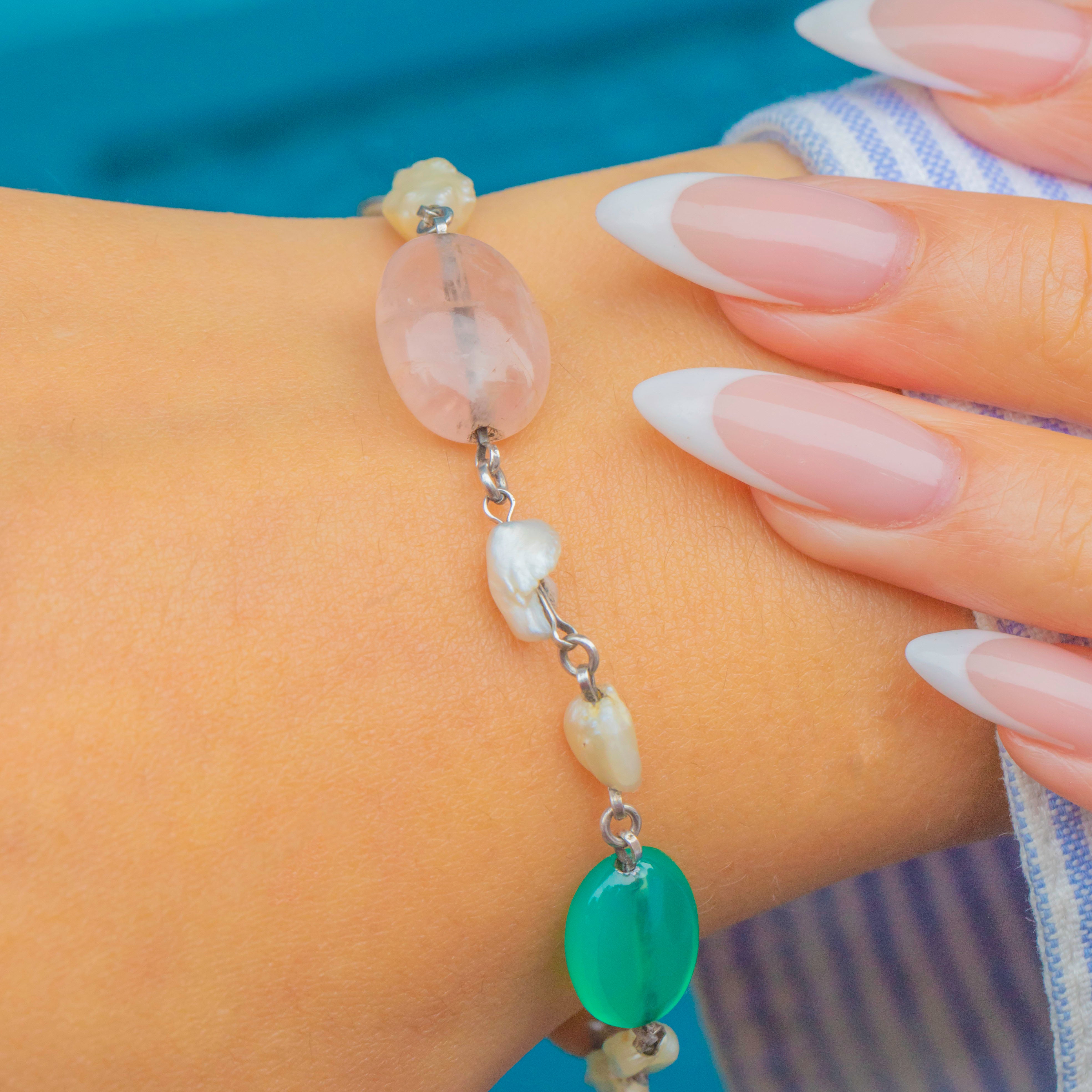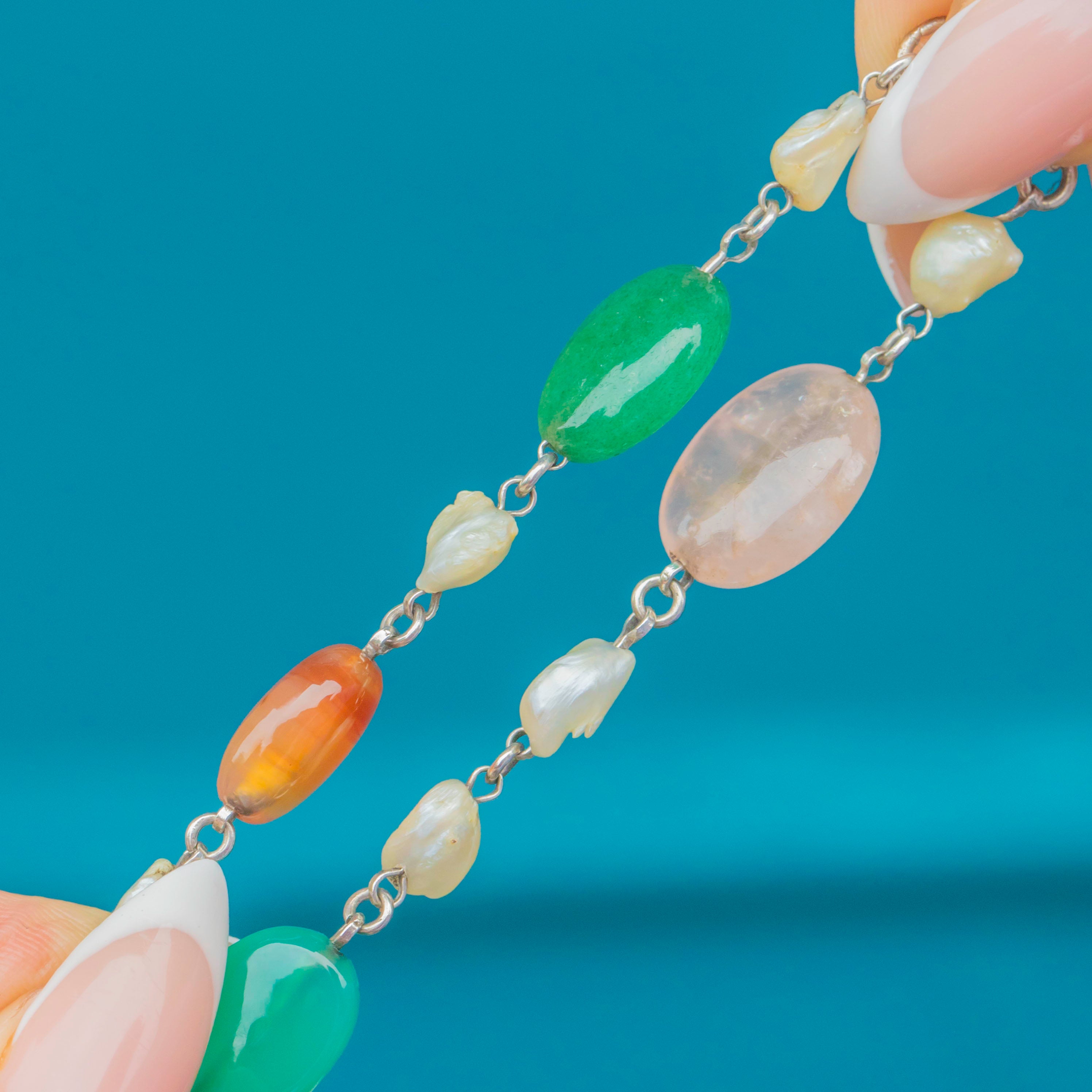 Alternating links of Rose Quartz, Chrysoprase, Sardonyx, Aventurine and Baroque Pearls create a harmonious yet playful composition. Each stone has been hand-selected for its unique beauty, from the translucent glow of the Rose Quartz to the rich green Chrysoprase and the warm orange tones of Sardonyx. The irregularly shaped Baroque Pearls add texture and contrast, softening the boldness of the cabochons with their organic lustre.