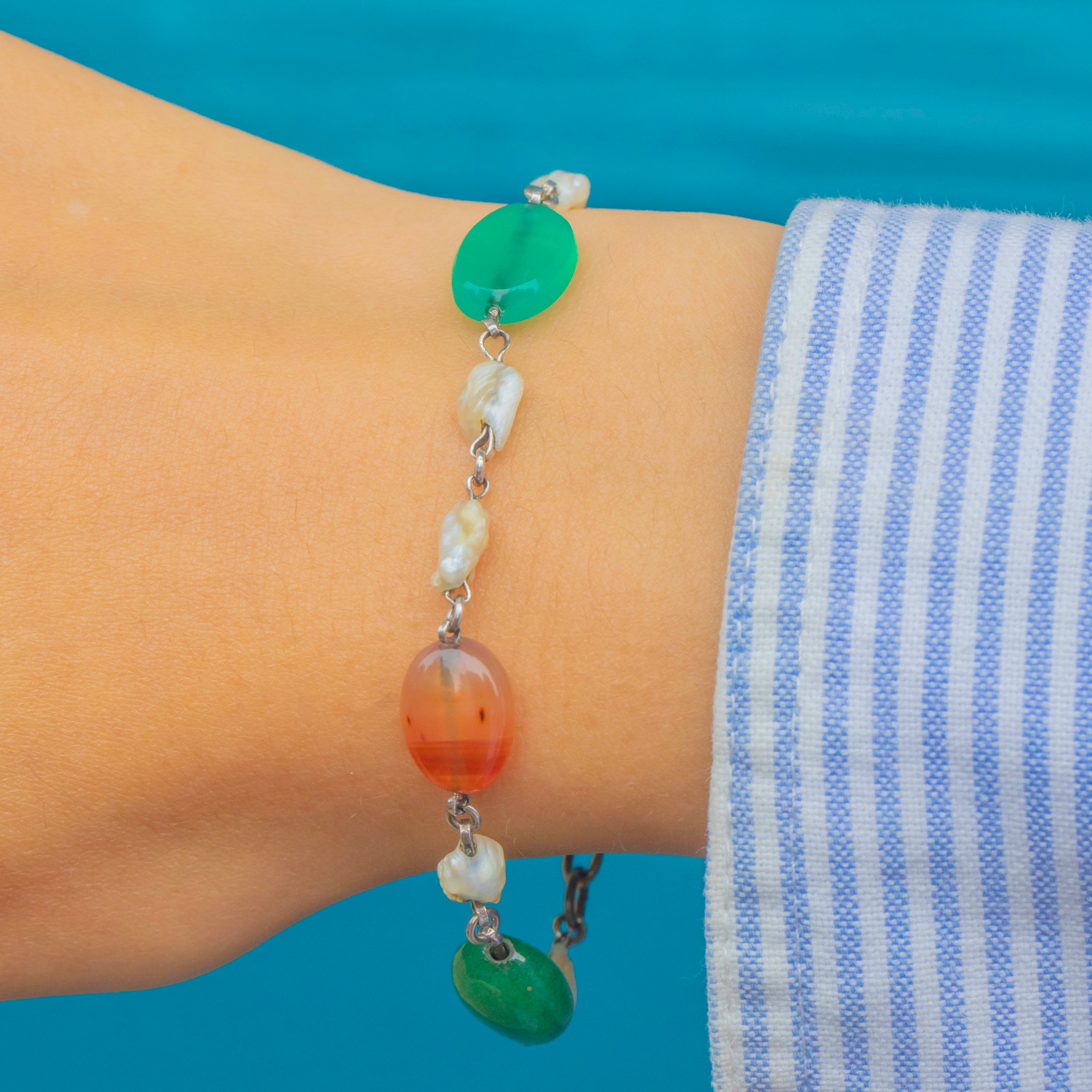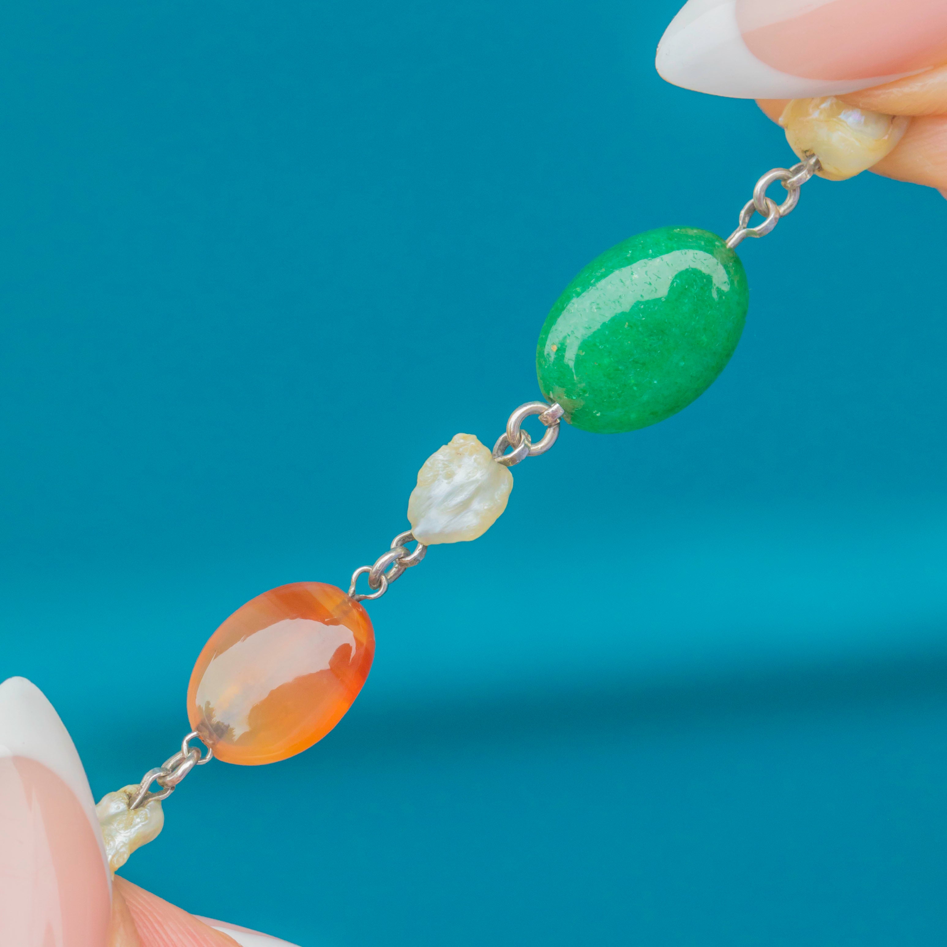 This joyful antique bracelet brings together a kaleidoscope of colourful natural gems, strung on a delicate Silver chain. With its vibrant hues of green, pink, orange and soft ivory, it is a piece that radiates bohemian charm and individuality.