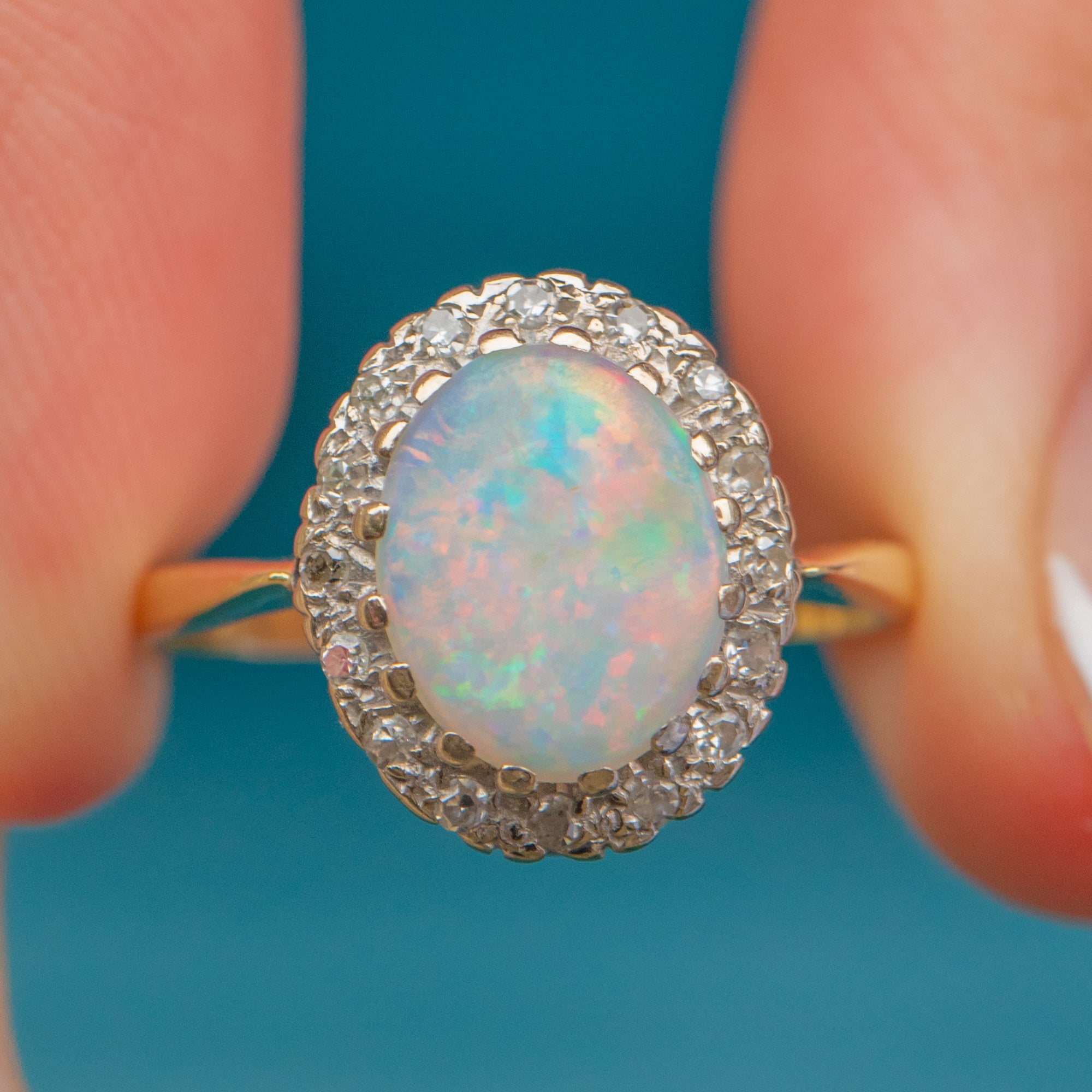 This Mid-Century Vintage ring is crafted in 18ct Gold and showcases a mesmerising cabochon Opal, glowing with flashes of pastel pink, green and blue. Surrounding the Opal is a delicate halo of twinkling Diamonds, lending both brightness and elegance to the design. A timeless cluster style that will look striking adorning your hand.