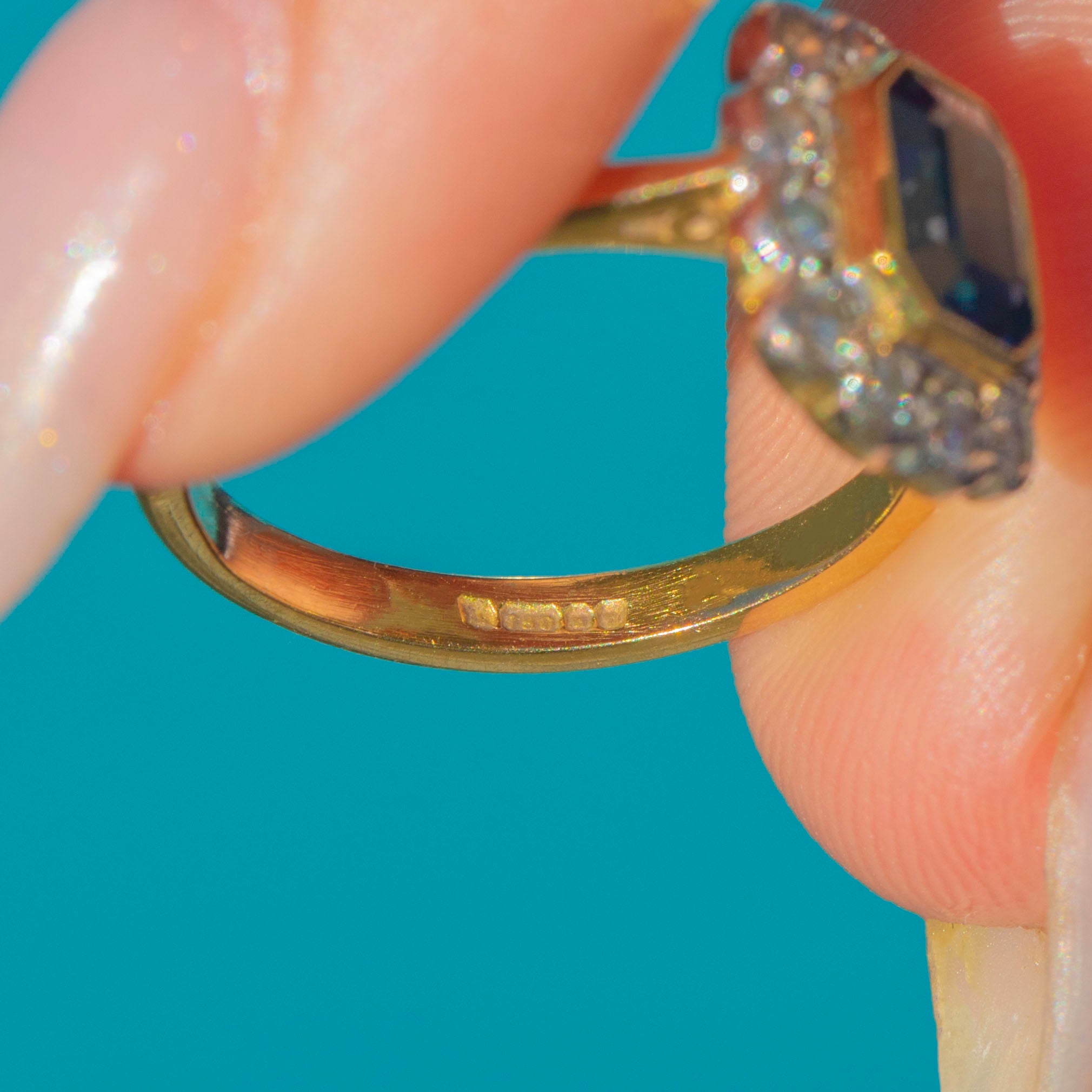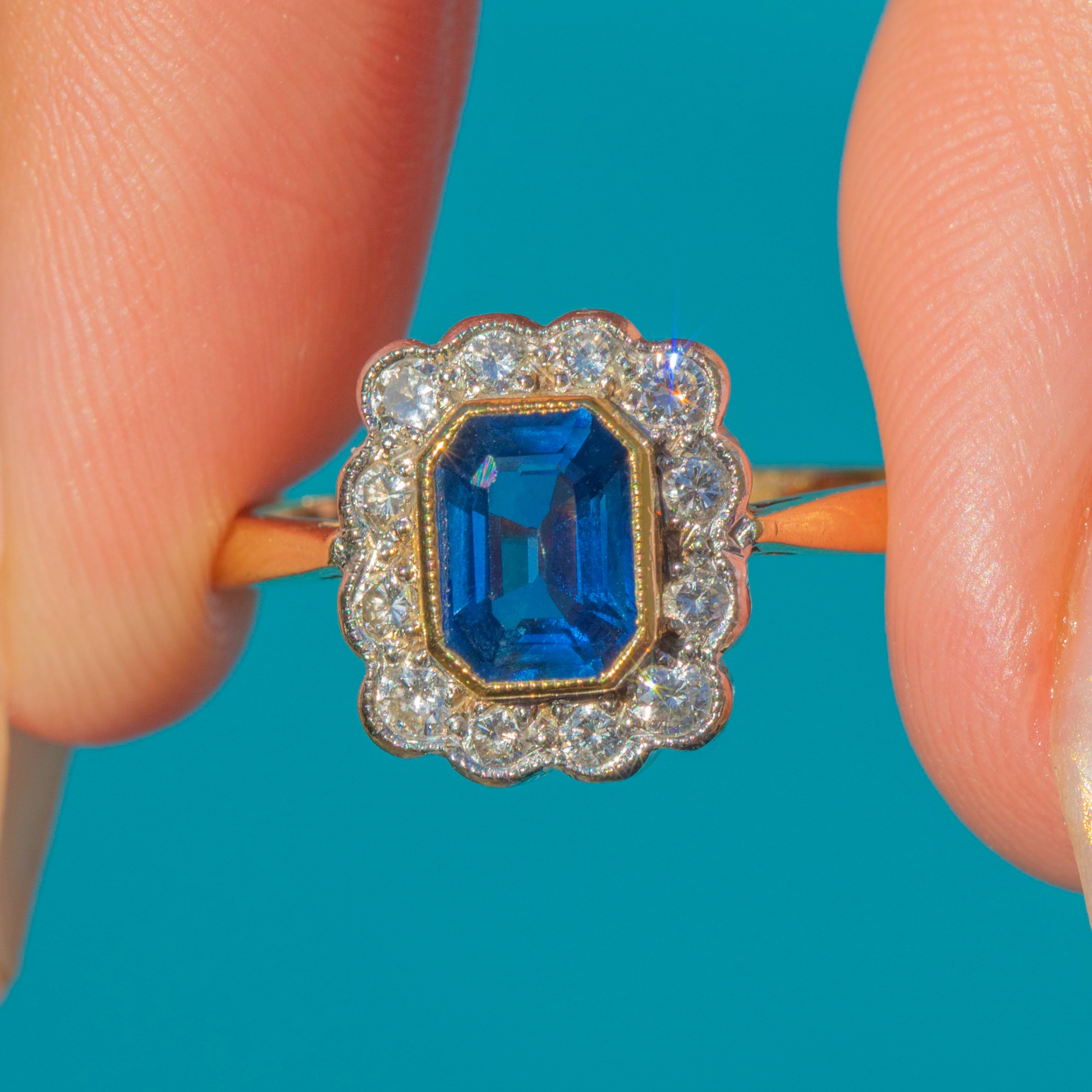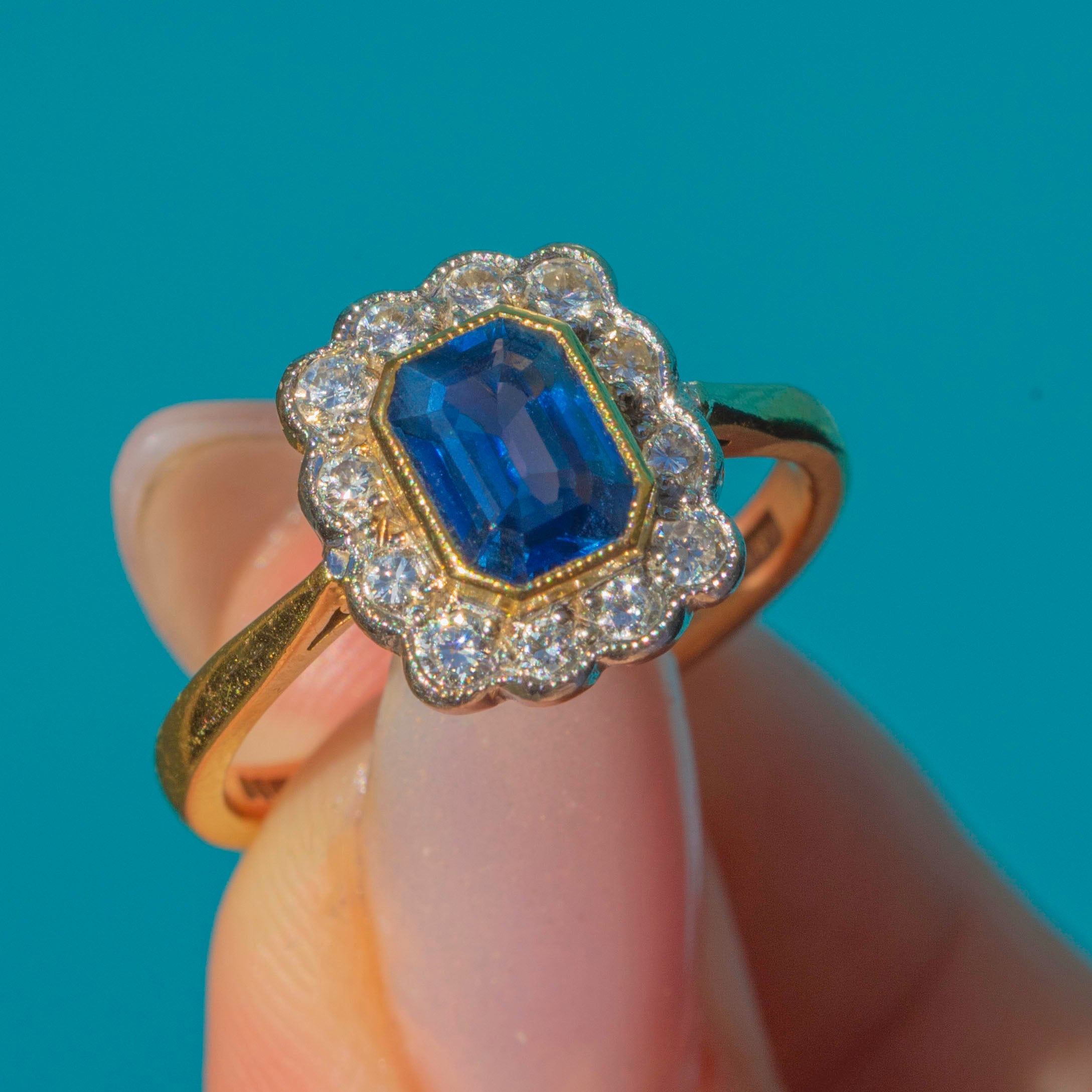 This vintage Sapphire and Diamond cluster ring is crafted in solid 18ct Gold, hallmarked in London for 1968. At its centre sits a vibrant step-cut Sapphire weighing approx. 0.75ct, framed by a sparkling halo of 12 brilliant Diamonds.