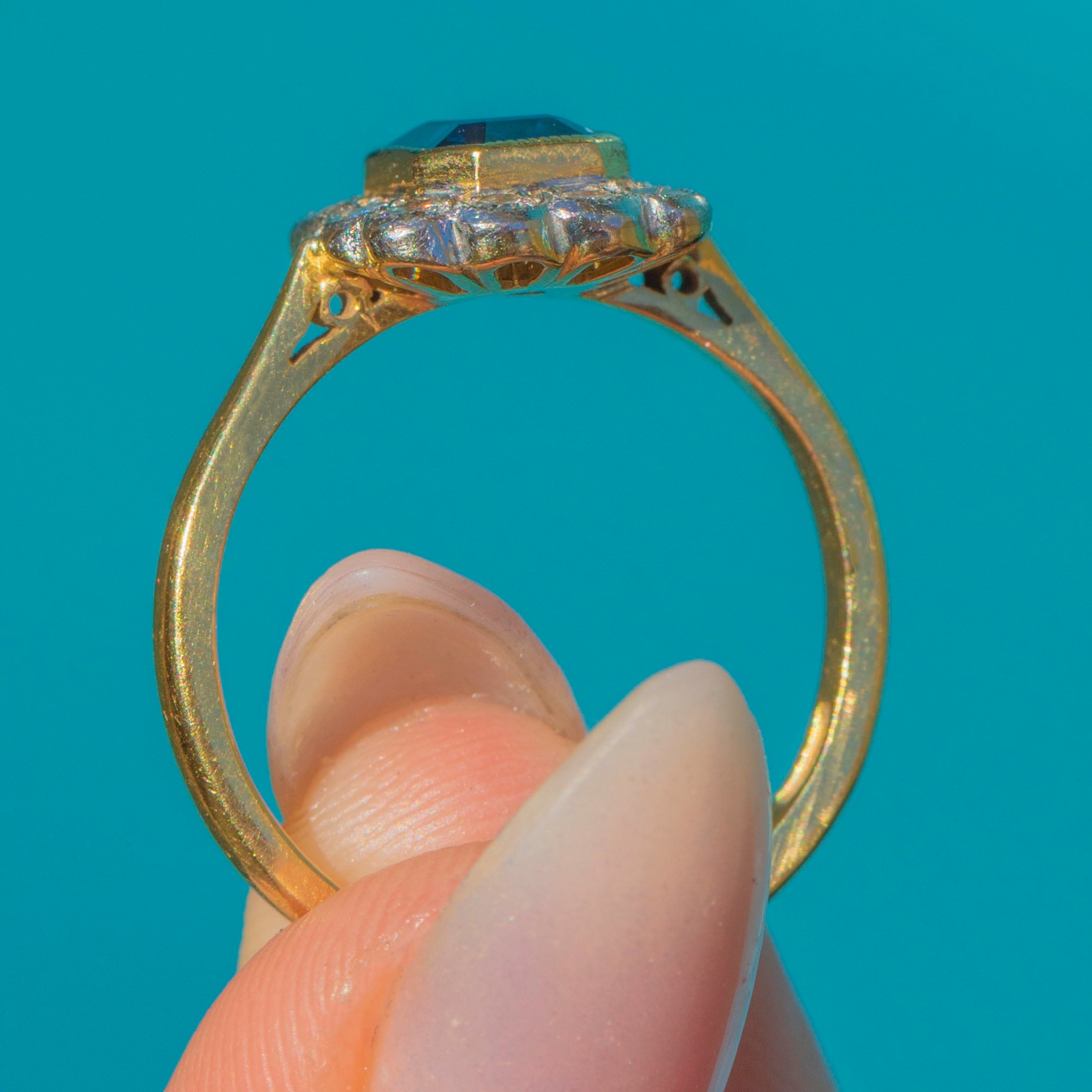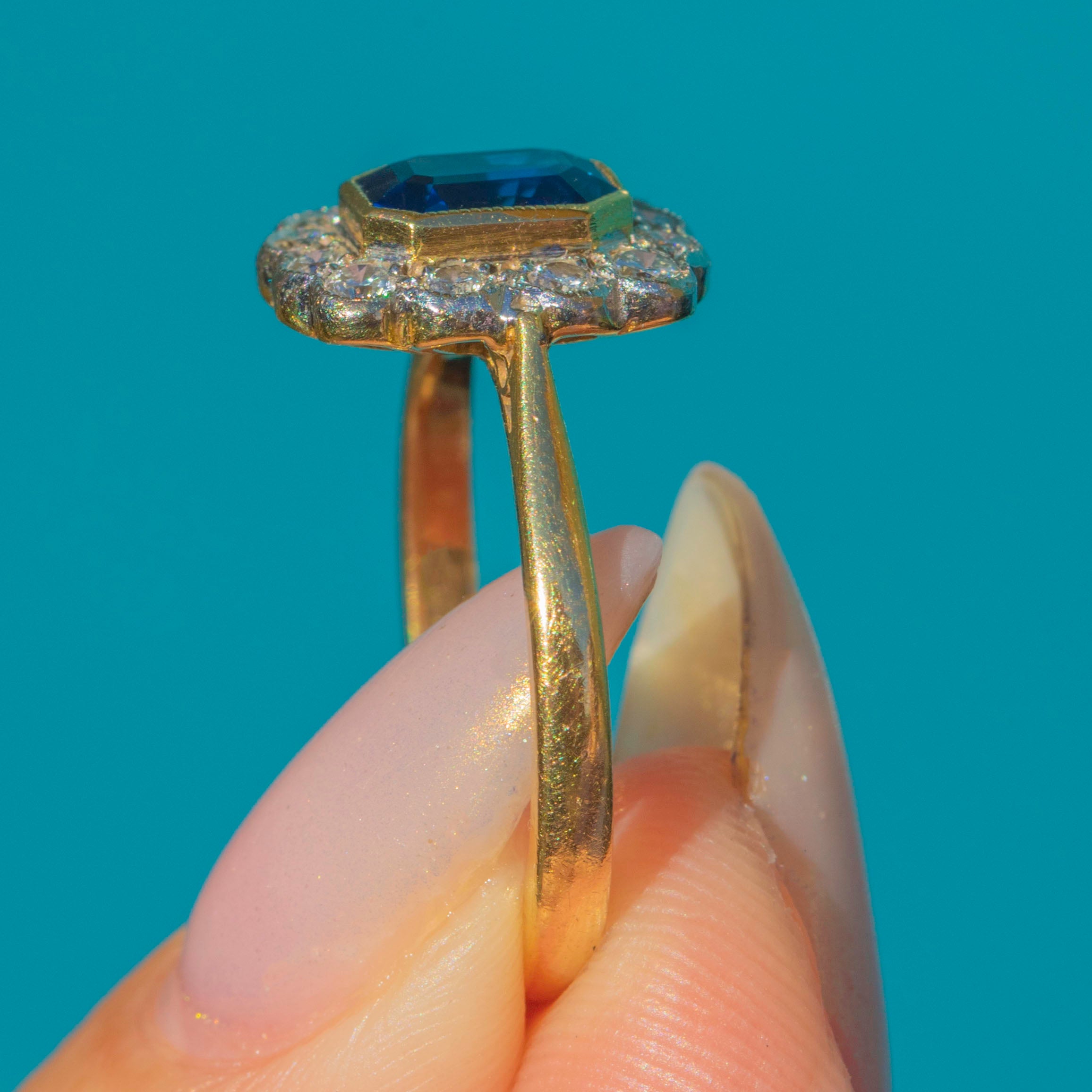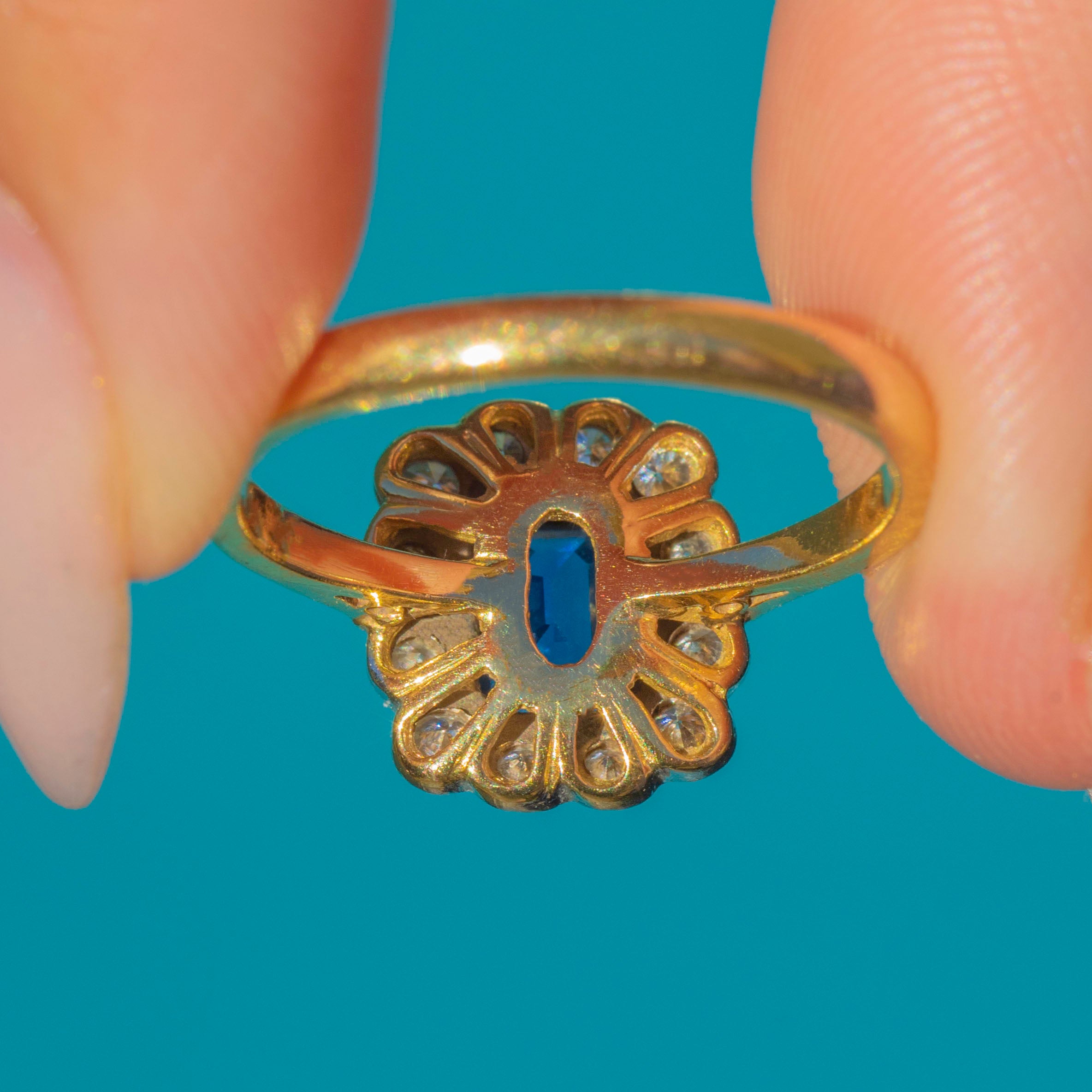 EXCELLENT: The Sapphire is vibrant- a true Royal blue colour of even tone and intense saturation, with no chips or scratches. The Diamonds are bright and securely set, adding sparkle to the cluster. The band is strong and well-shaped, with clear and legible hallmarks.