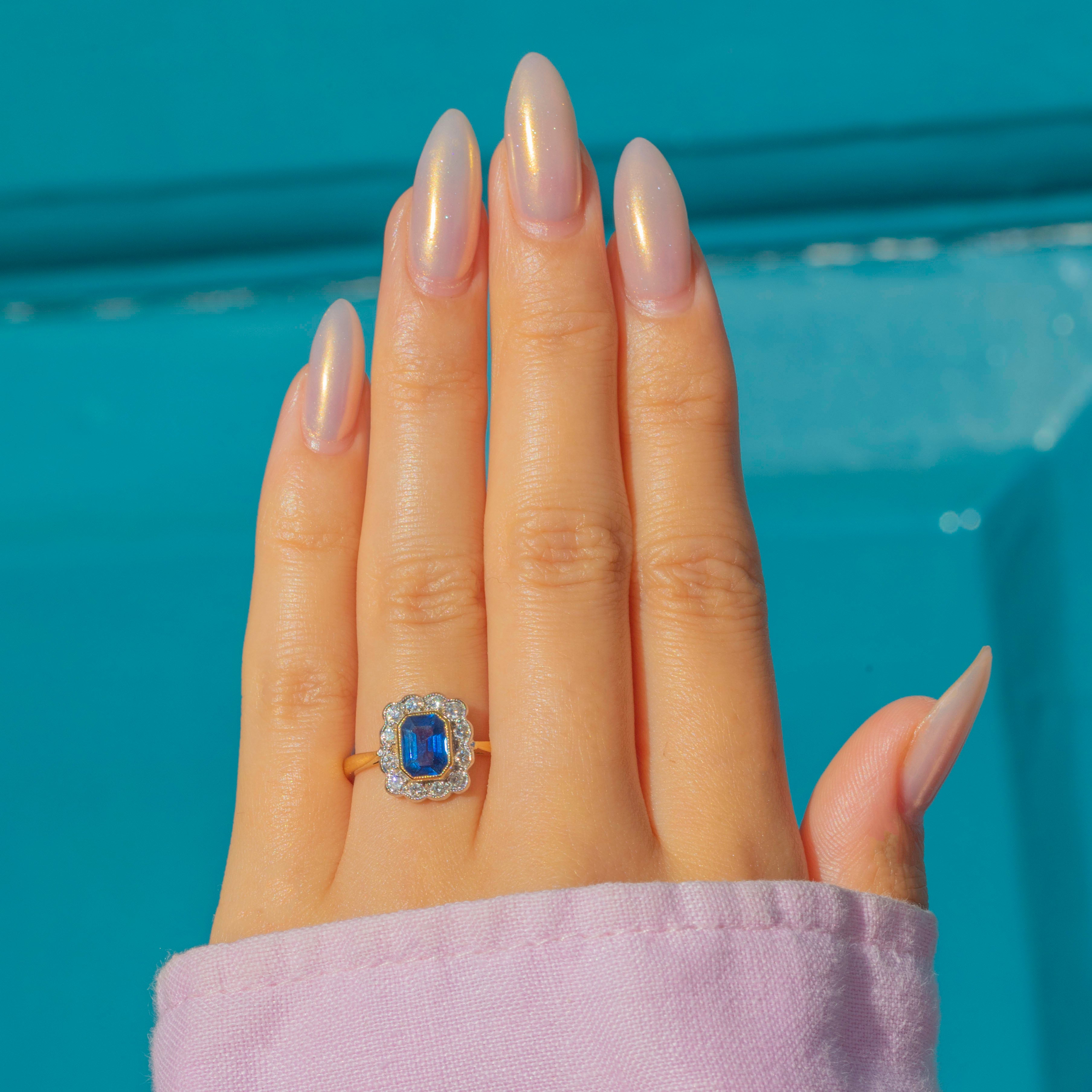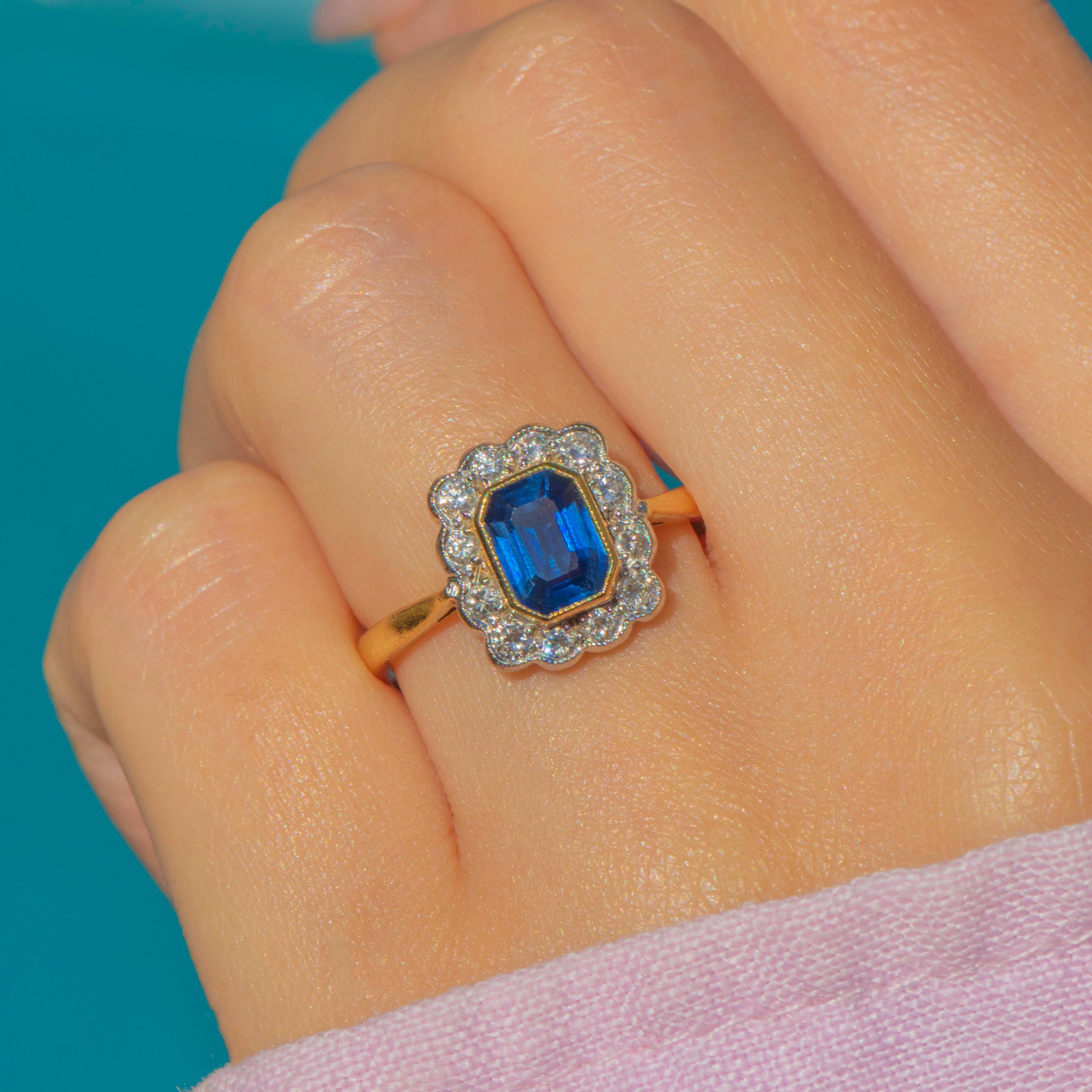 The clean lines of the rectangular Sapphire contrast beautifully with the scalloped outline of the Diamond cluster, giving the design a refined mid-century appeal.