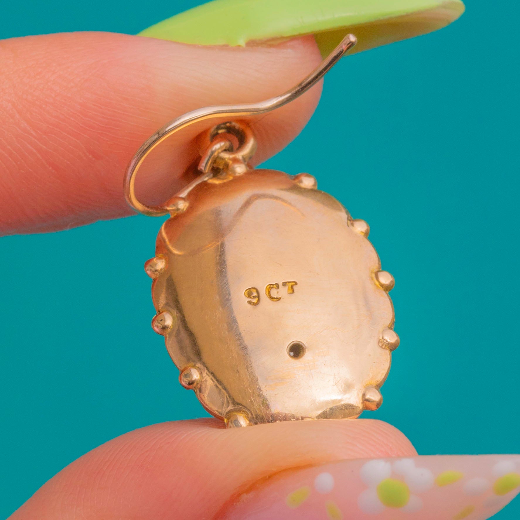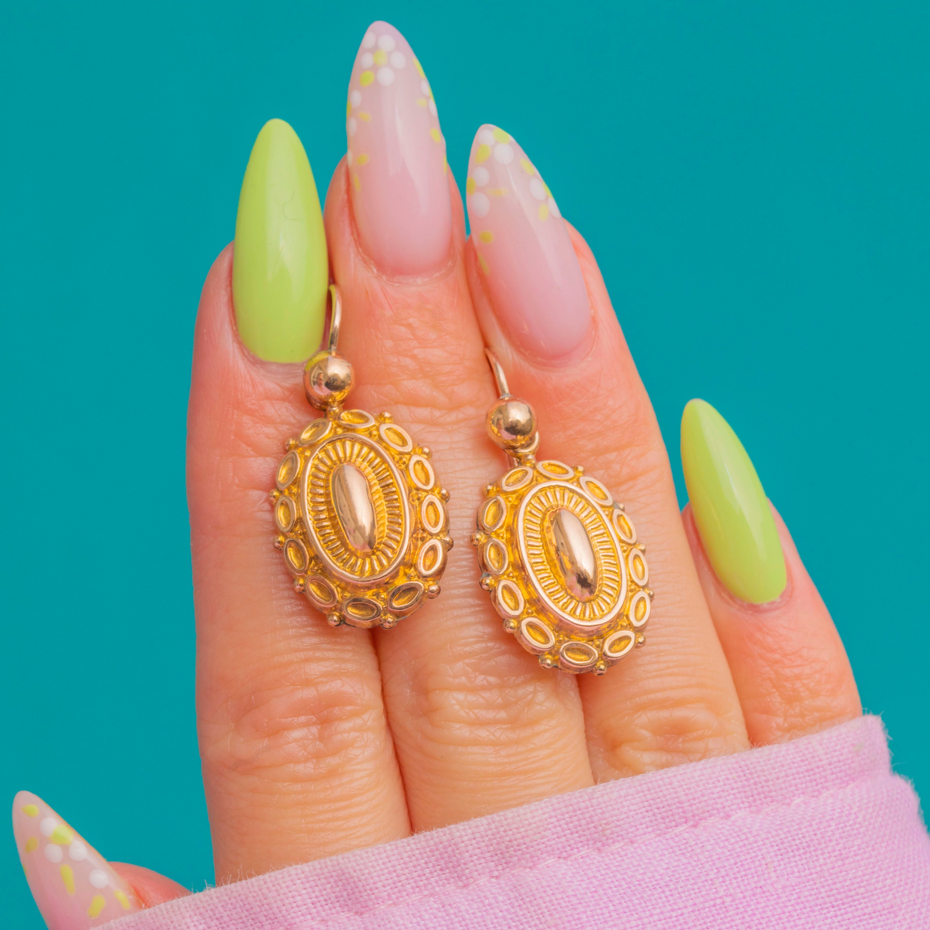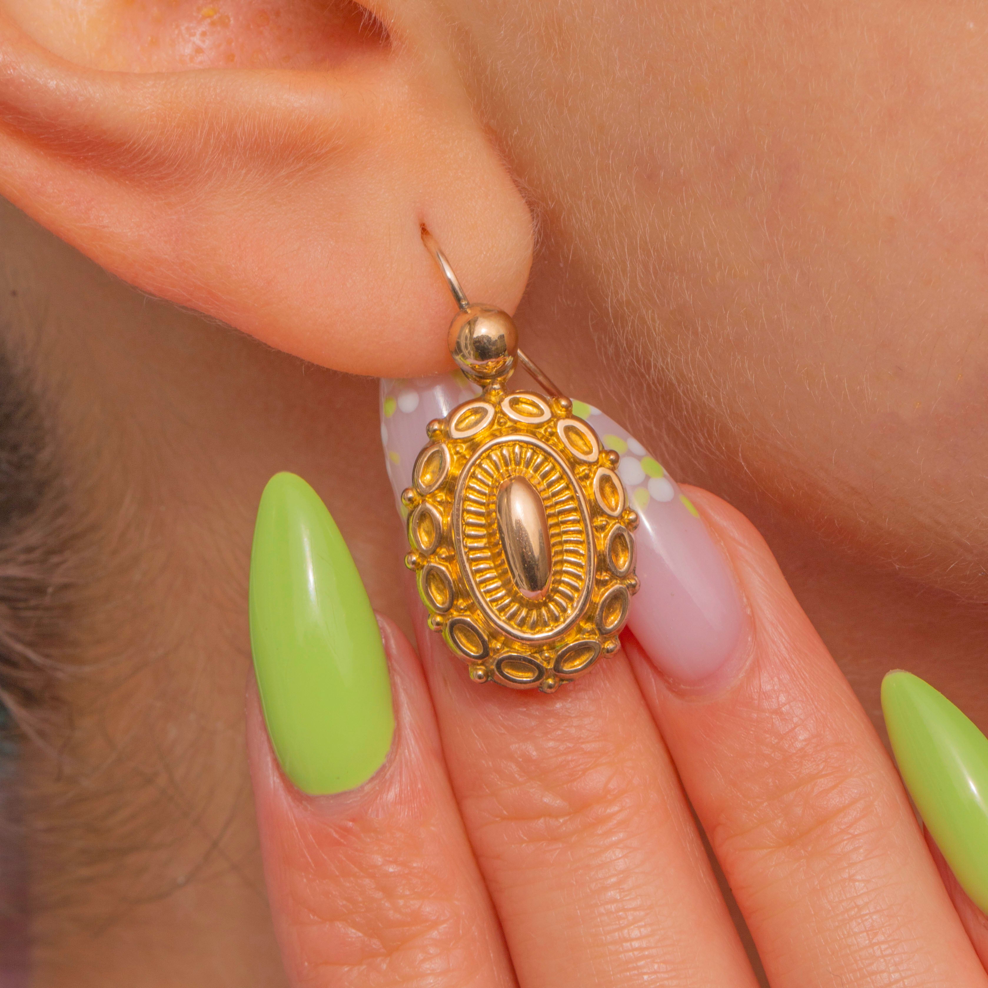 華やかでありながら日常使いにも適した、アンティーク9ctゴールド ドロップピアス。Victorian時代のロマンティックな美意識を映し出しています。各メダリオンには、ドーム状の中央オーバル、放射状に広がるサンバーストのリブ、そして繊細なビーズ装飾の縁取りが施され、柔らかな曲面に美しい光の陰影を生み出します。