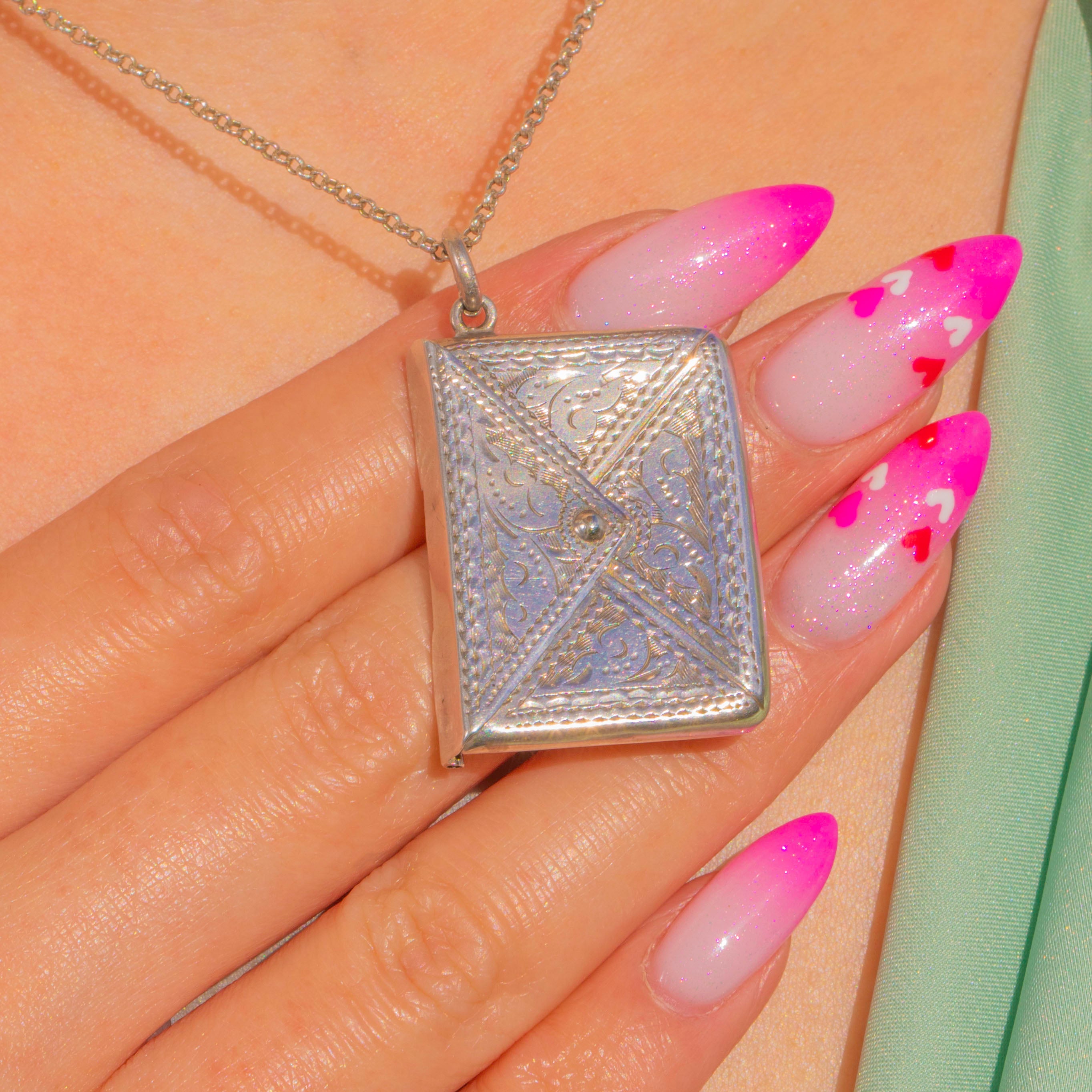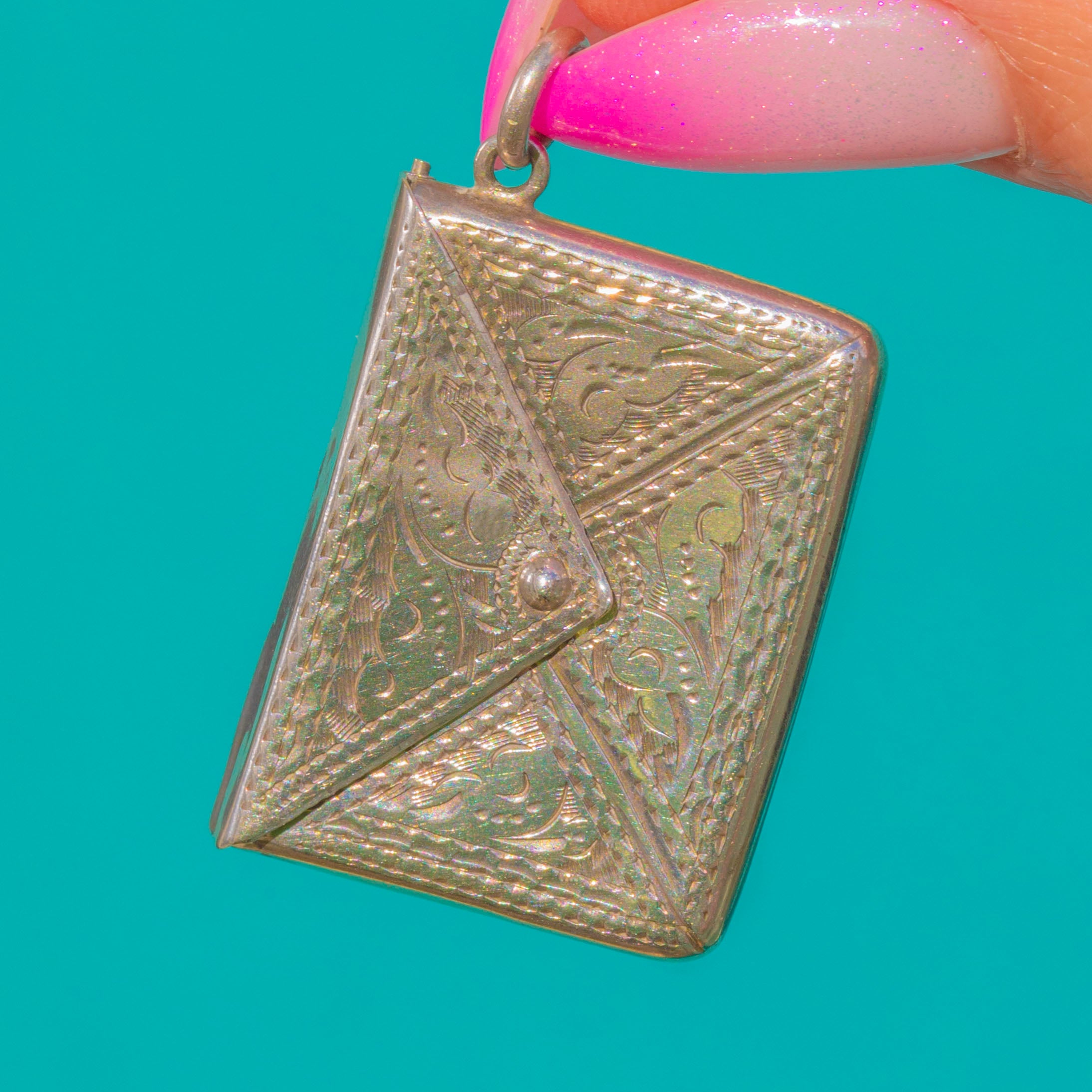 A charming Edwardian Sterling Silver stamp-holder pendant modelled as a dainty envelope, richly engraved with flowing foliate scrolls and finished with a neat beaded border. Its raised “flap” motif and central stud lend lovely dimension, while the gentle patina in the recesses beautifully accentuates the design.