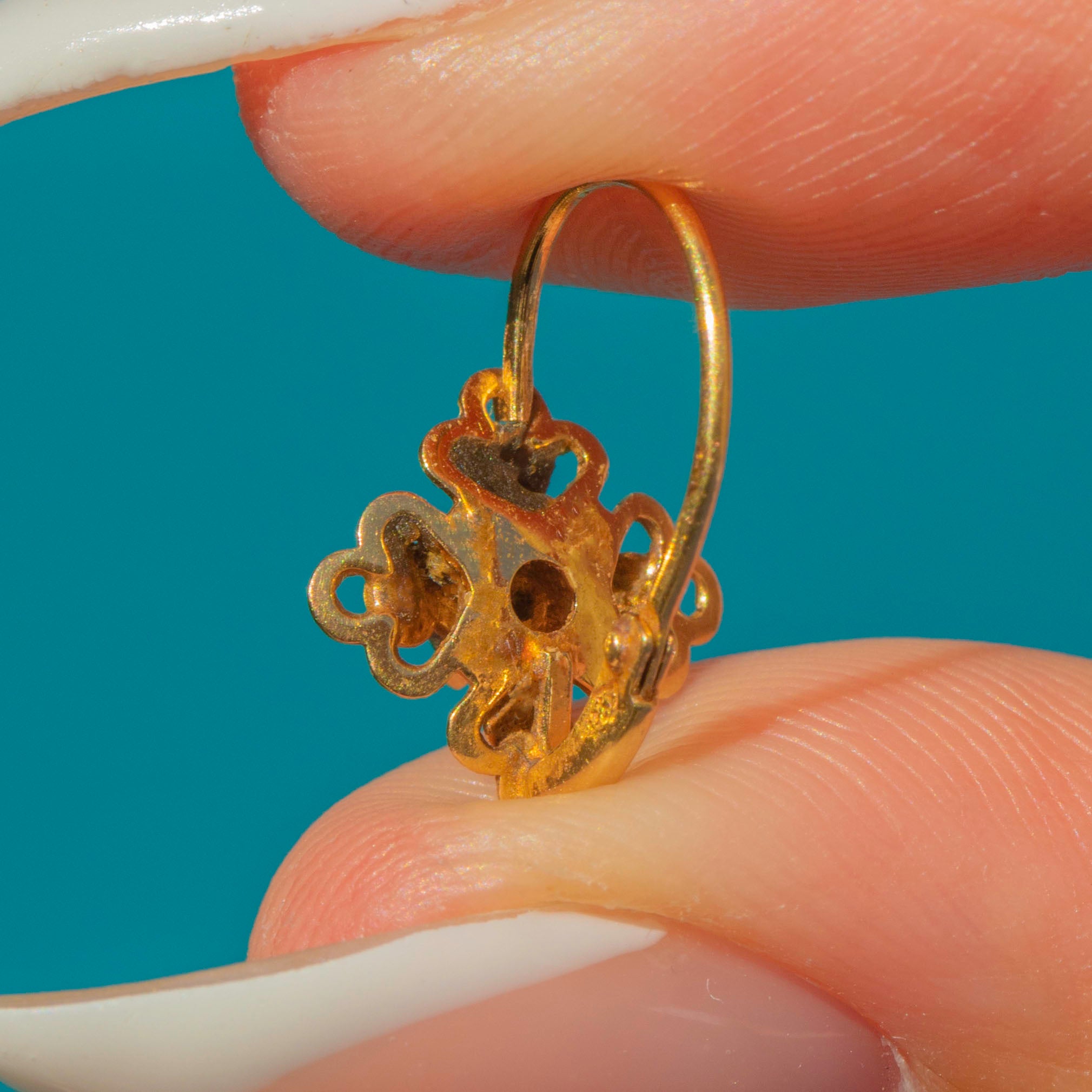 Charming French lever-back earrings in rich 18ct Gold, each formed as a tiny quatrefoil flower with a bright blue Sapphire at the centre. Dainty, effortless and easy to wear every day.