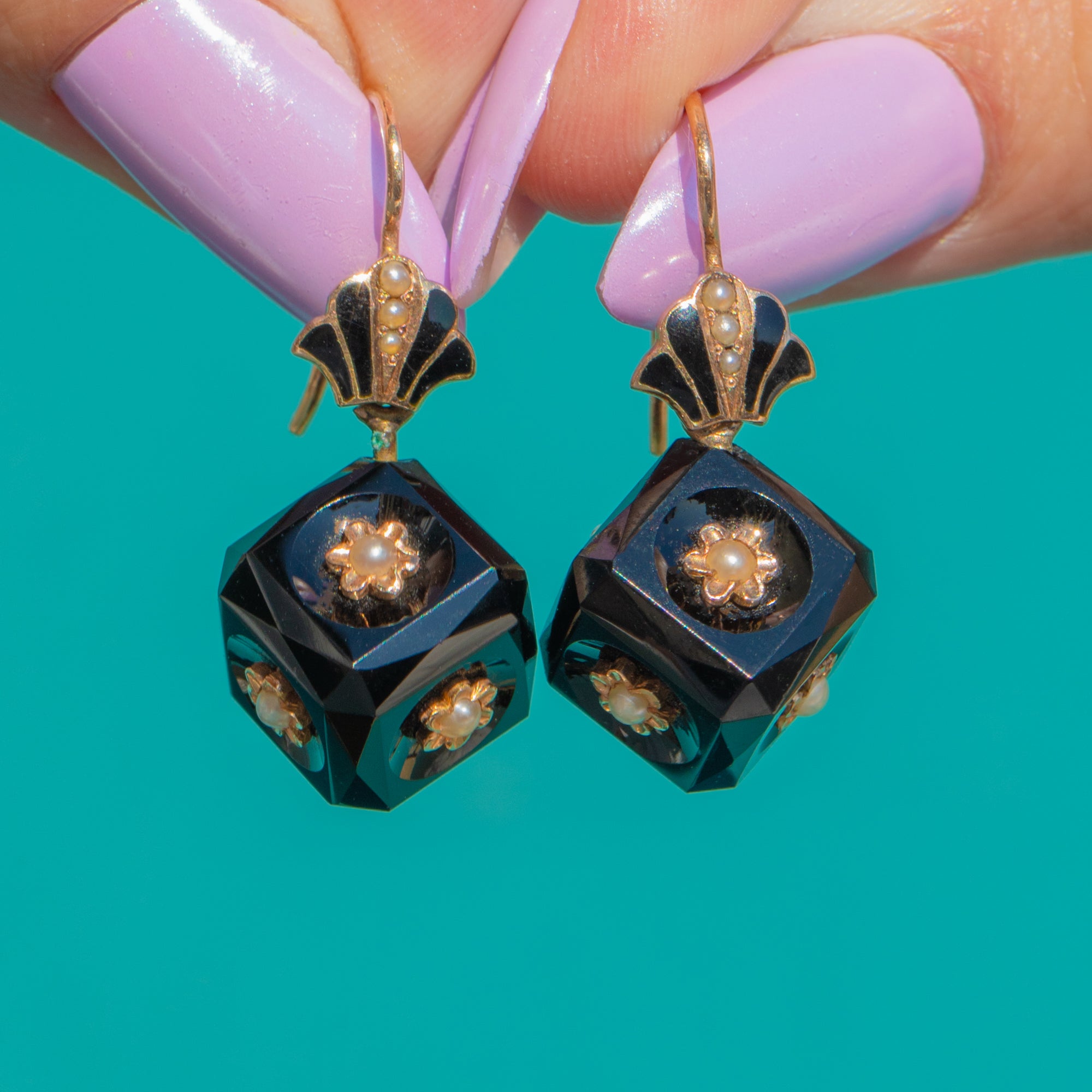 希少 15ct ゴールド オニキス「キューブ」ドロップピアス、ブラックエナメル&パール クラムシェルトップ