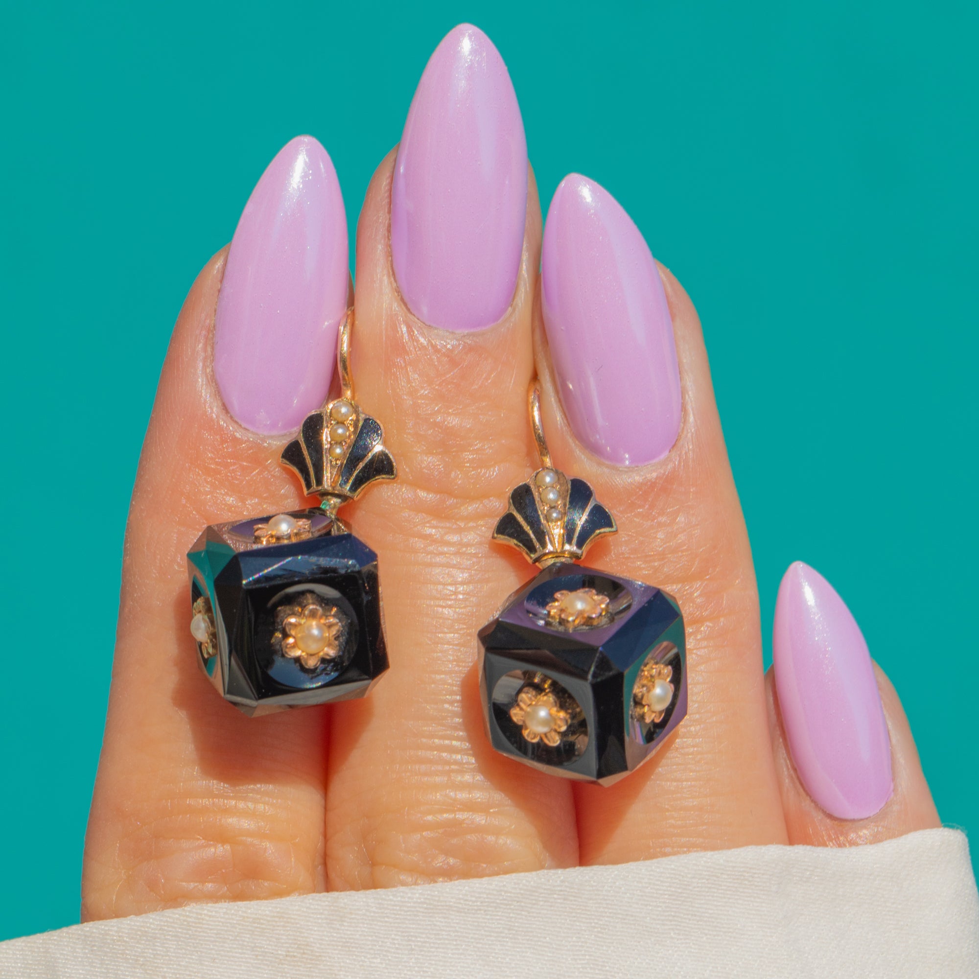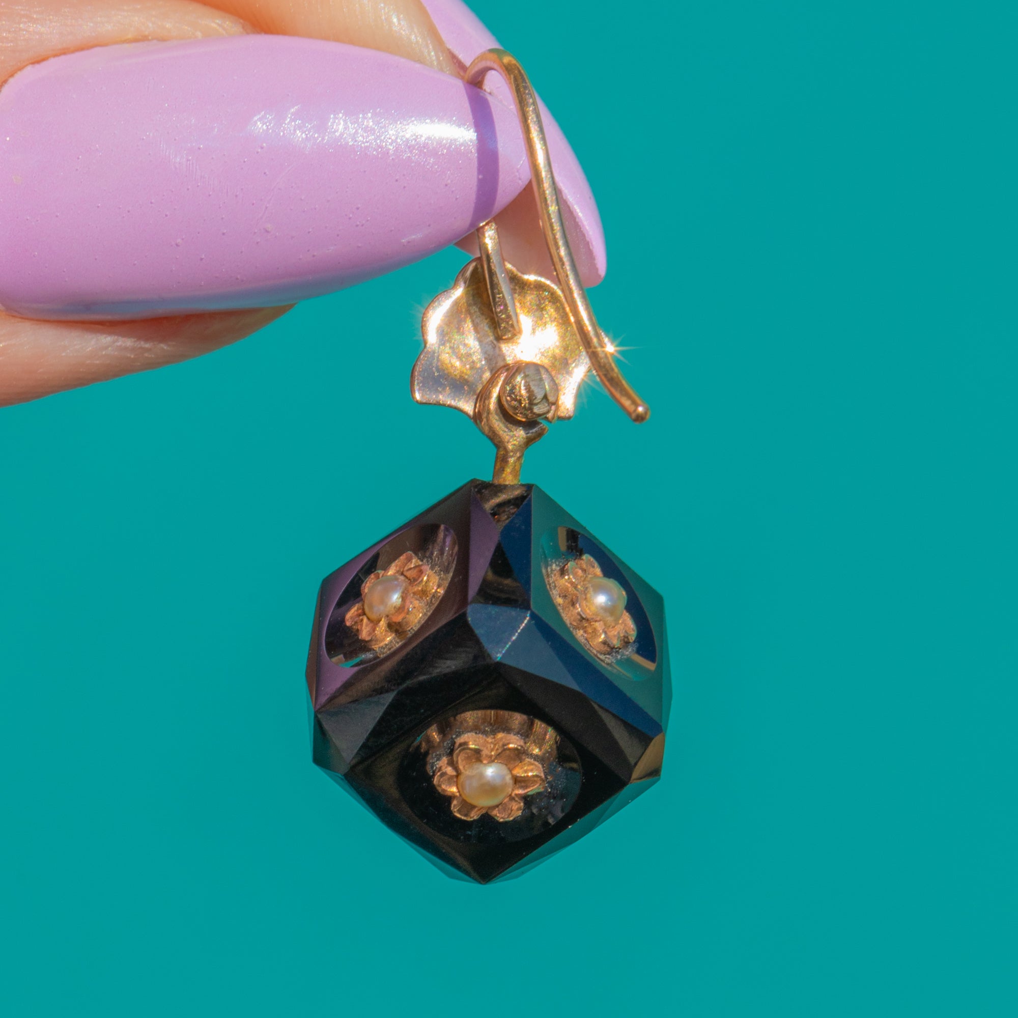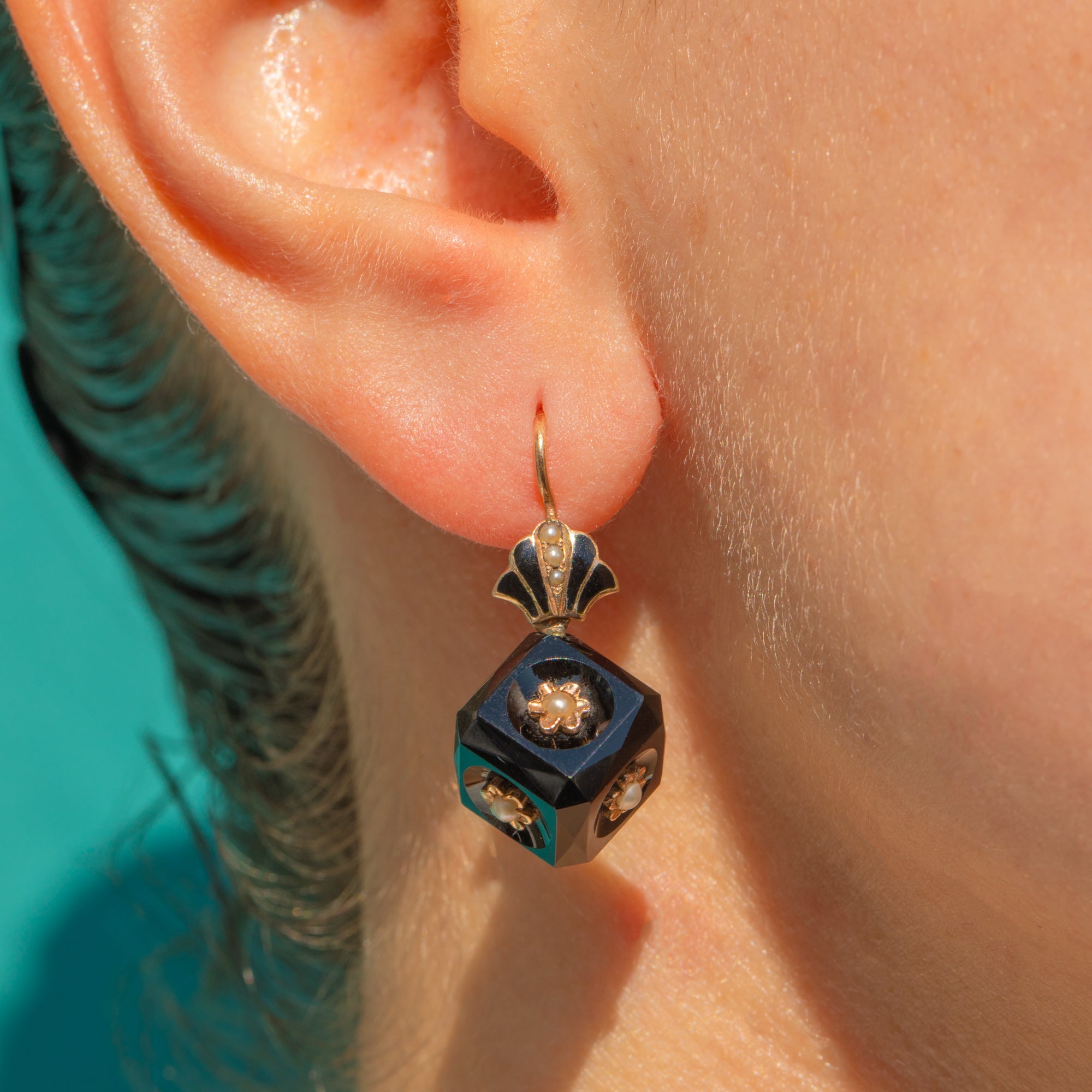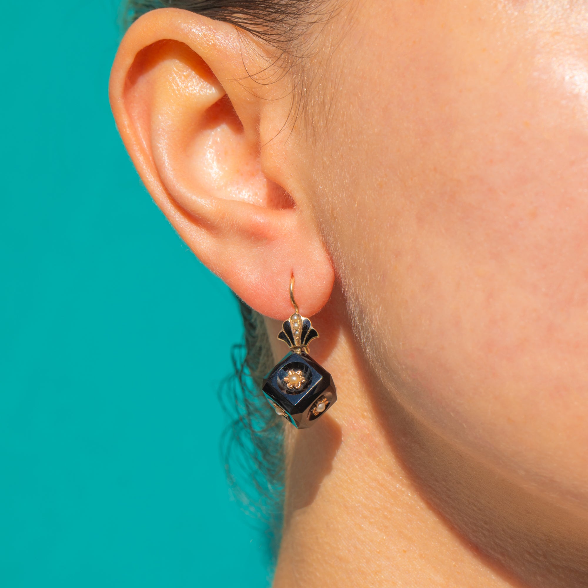 この彫刻的なVictorianドロップイヤリングは、グラフィカルな幾何学と繊細な装飾美を融合させています。艶やかなファセットカットのオニキスキューブには、複数の面に隆起した15ctゴールドのロゼットがあしらわれ、それぞれの中心には小さなパールが配され、漆黒の中にほのかな輝きを添えています。上部には扇形のクラムシェルターミナルがブラックエナメルで彩られ、洗練されたアクセントとしてドロップ部分を美しく引き立てます。