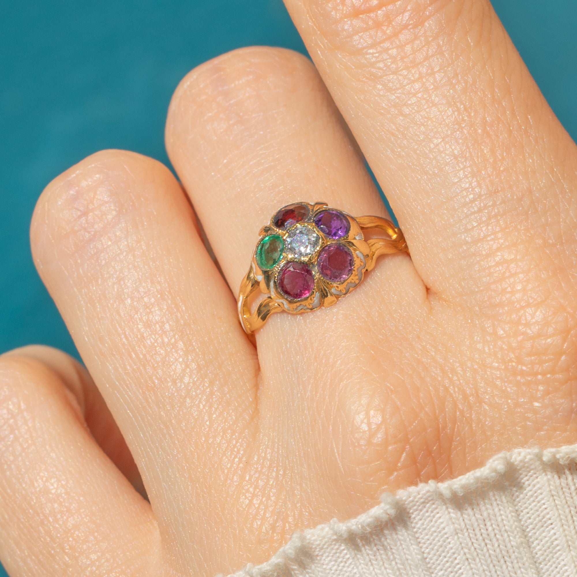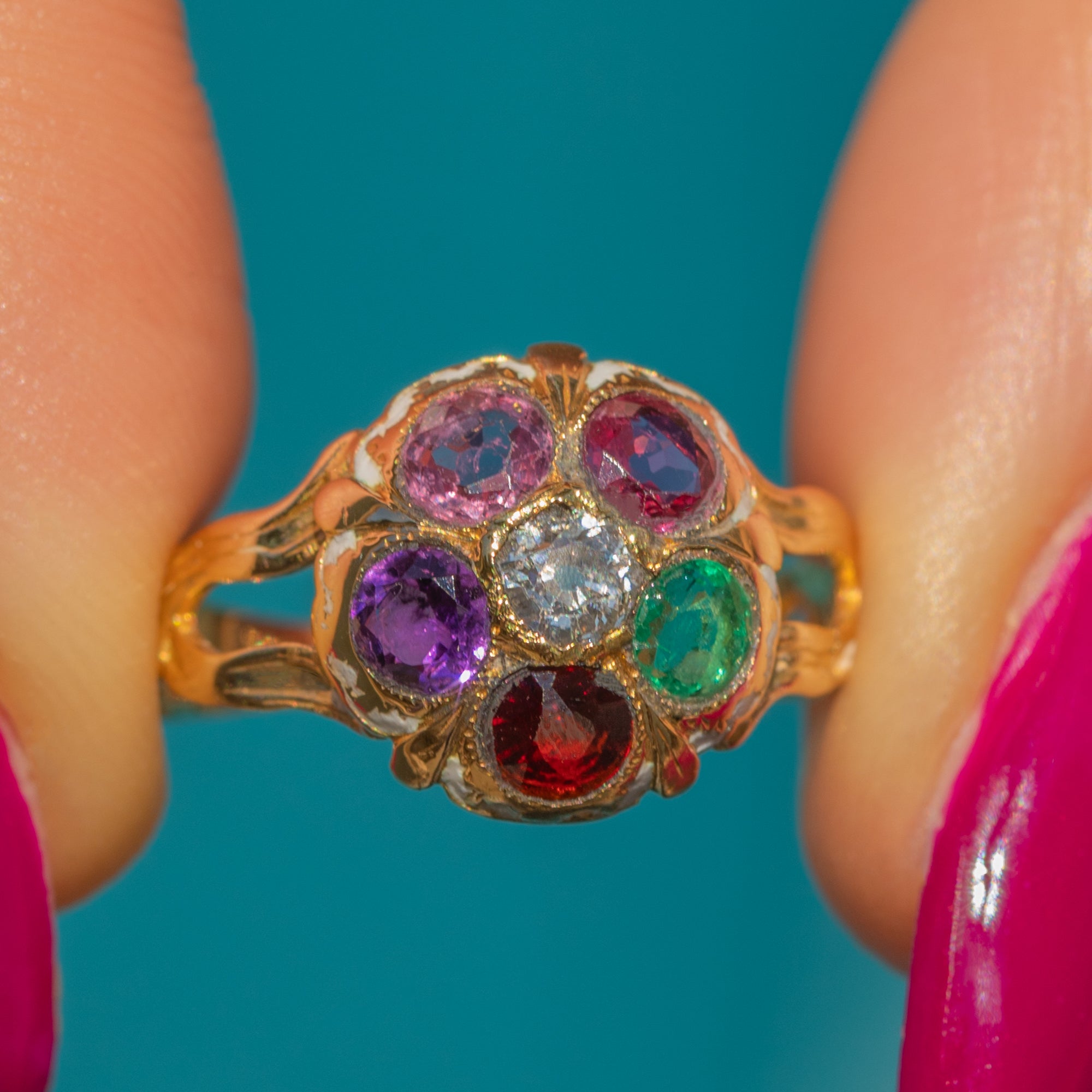 This rare Victorian multi-gemstone REGARD flower ring features a delicate White Enamel border, surrounding a splendid assortment of gemstones; she looks as though she's been plucked from an English flower garden!