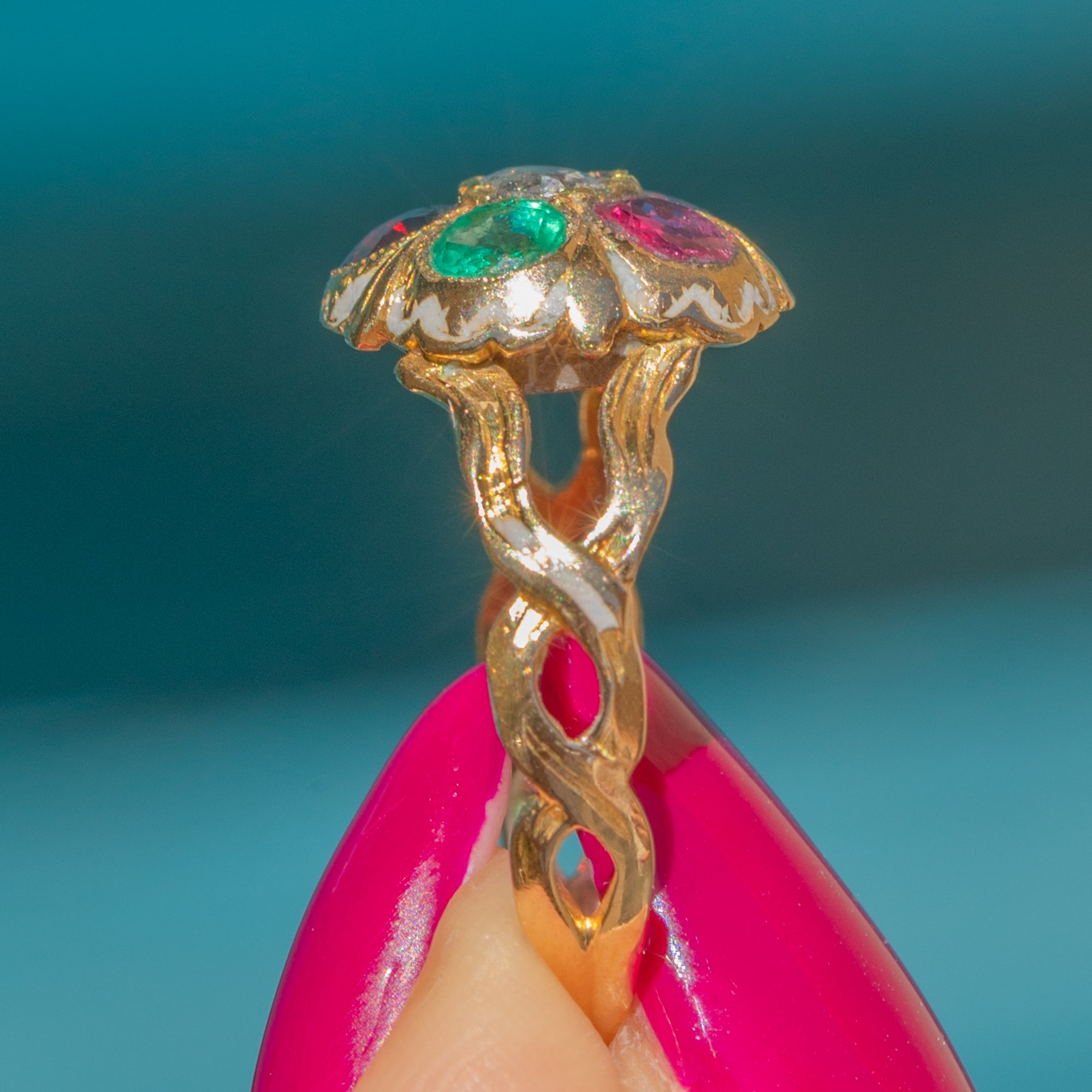 GOOD: The ring is in good condition, with some loss to the white Enamel visible upon close inspection. The 15ct Gold band remains sturdy, and although the ring band shows slight warping consistent with its age, it remains a beautiful and wearable piece. The Emerald, Garnet, Amethyst, Rubies, and Diamond are all securely set, though the stones show some surface wear consistent with age and gentle use. Despite this, they are still bright and beautiful, she will be enjoyed for generations to come!