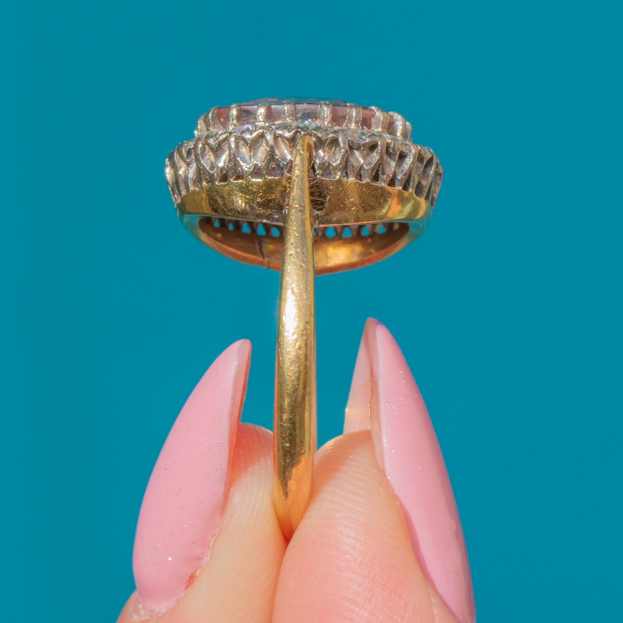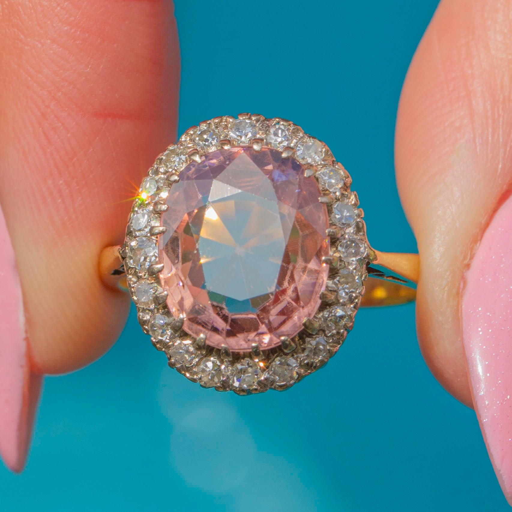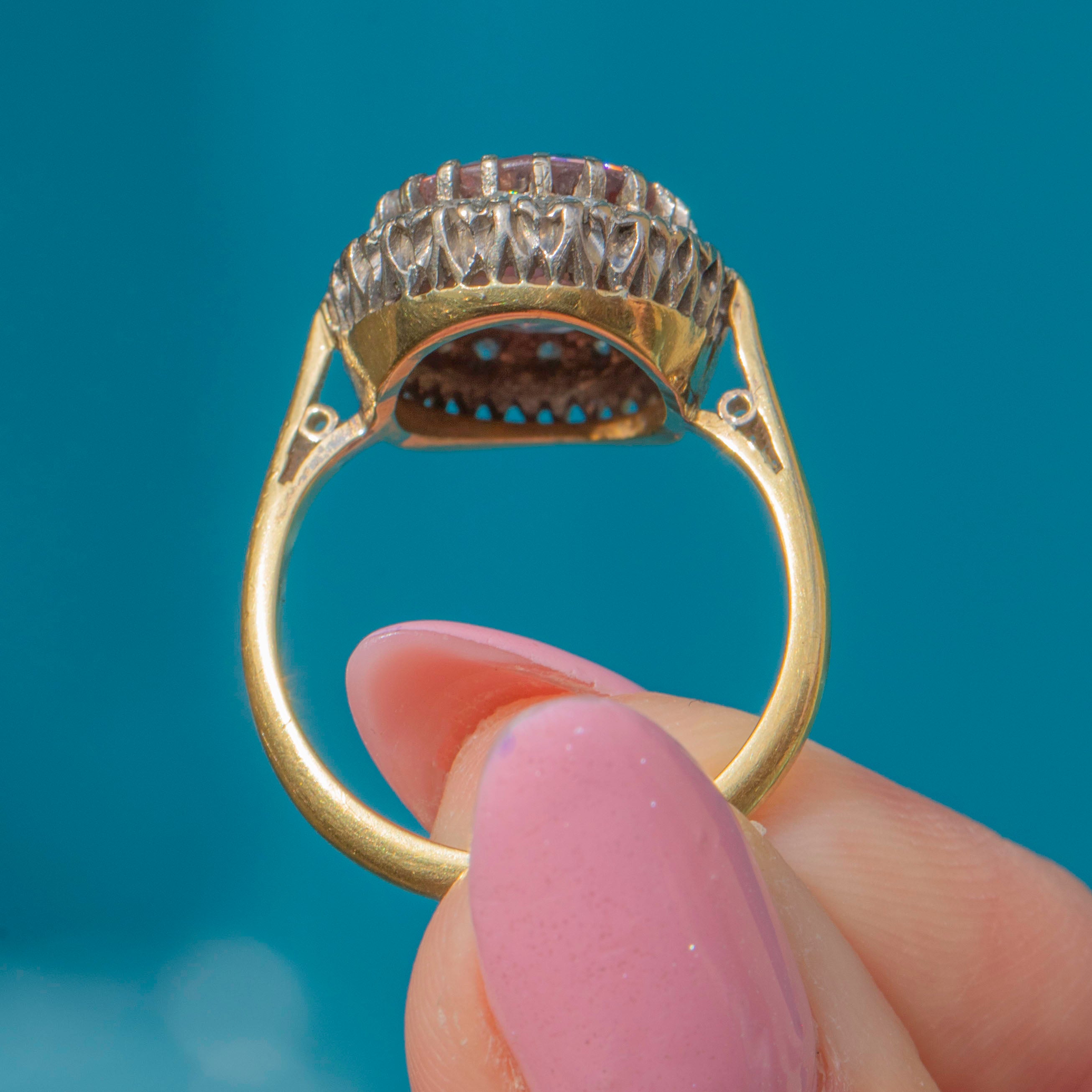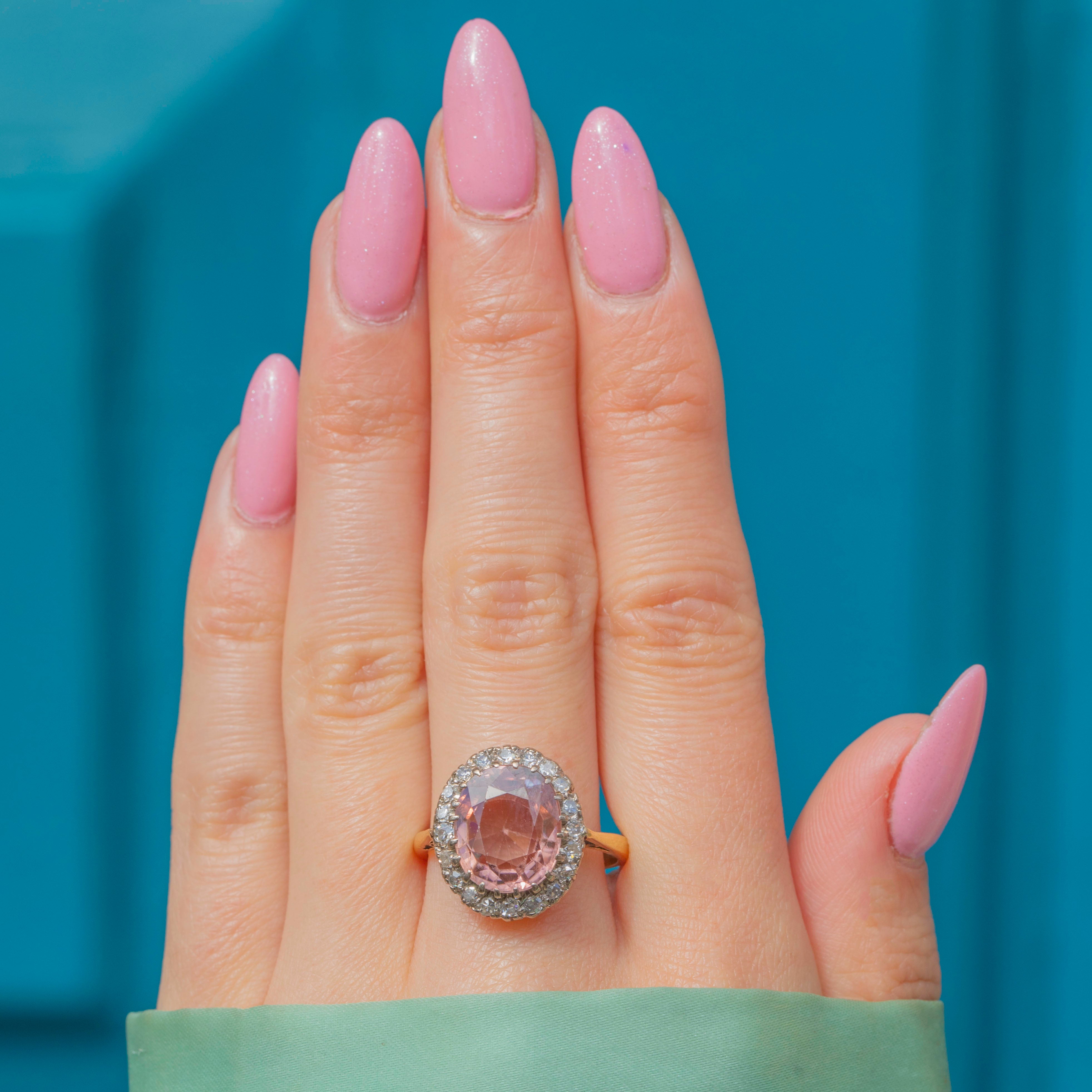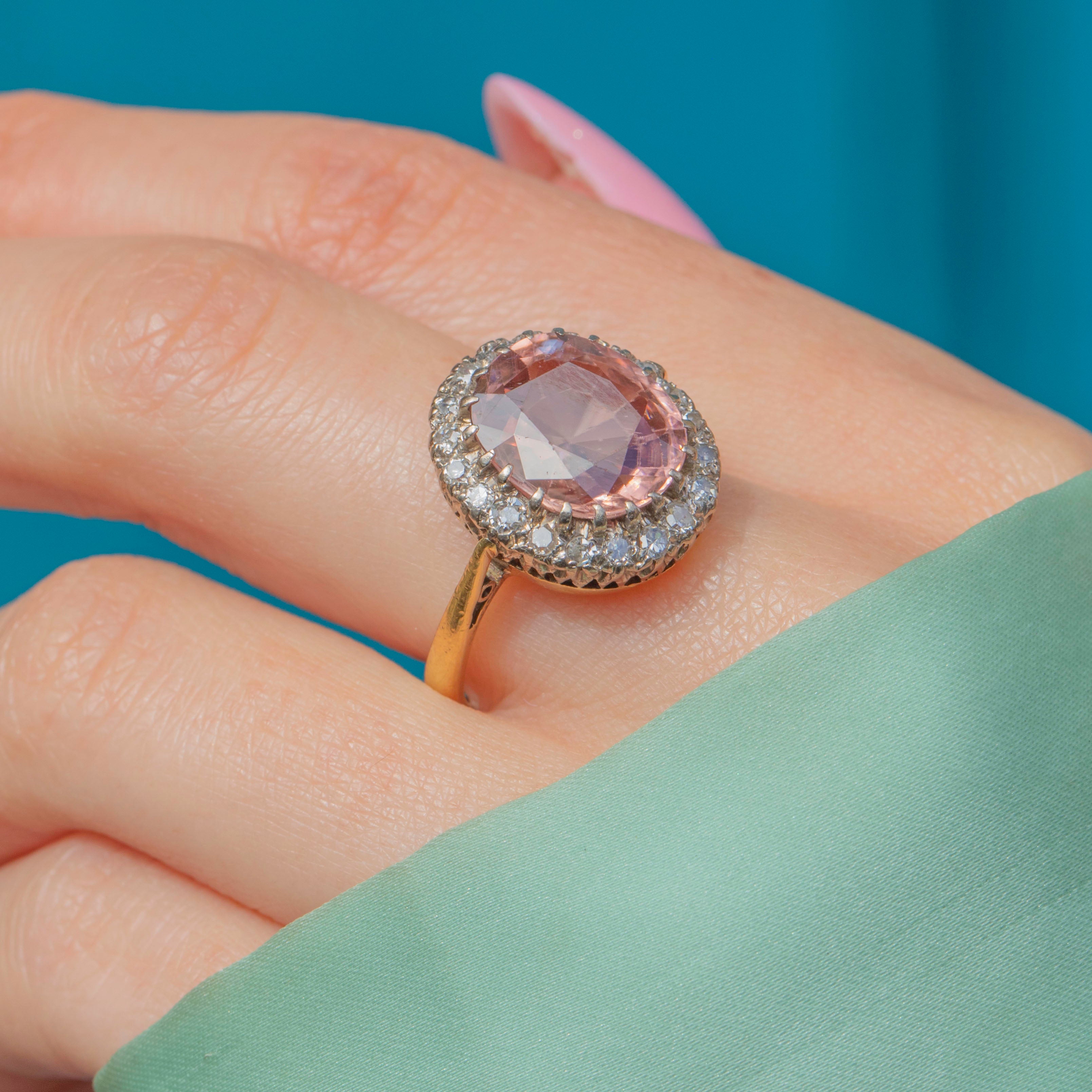 EXCELLENT: This rare 18ct Gold Pink Zircon Diamond cluster ring is in excellent condition. The Zircon has a crisp set of facets with no chips or abrasions, and is securely set. Her Diamonds and Zircon are held tightly in an 18ct Gold! The gemstones are free from any scratches or subtle wear! You can pop her on straight from her Lillicoco box!