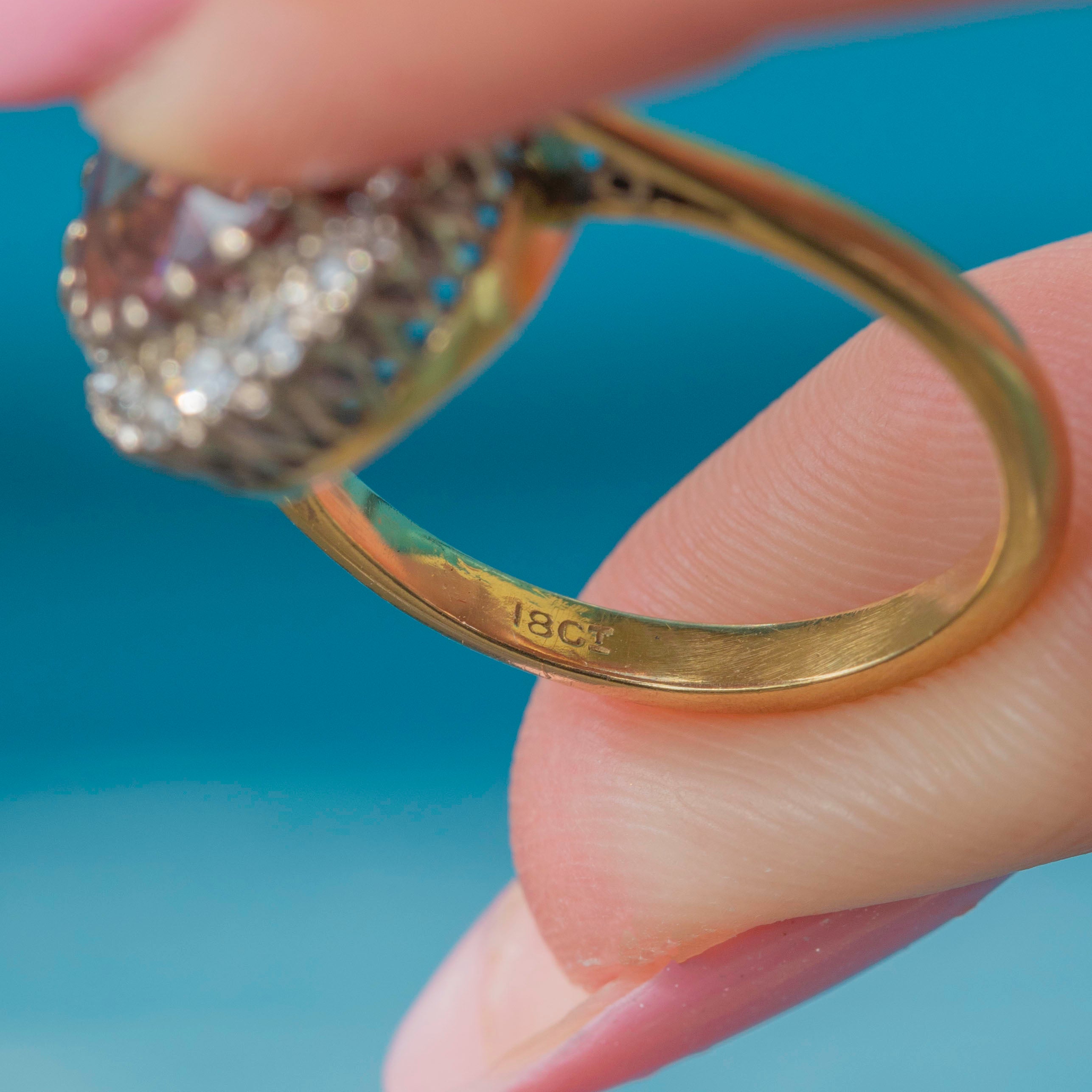 Cratfed from solid, brightly saturated 18ct Gold, this vintage Zircon Diamond ring provides exceptional finger coverage and will make a statement wherever she goes.