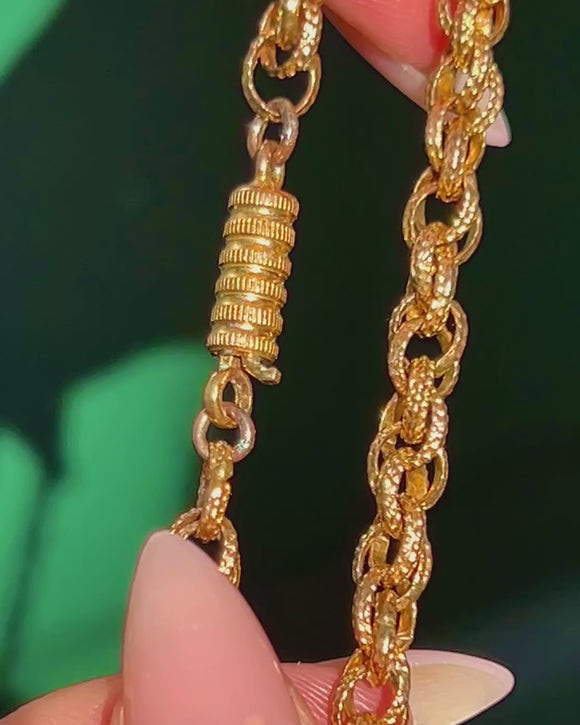 The rope-like textured links are wonderfully tactile, catching the light with every movement. At 43.1g, it has a luxurious weight, and the subtle signs of age add to its authenticity and antique charm. A versatile and collectable piece of Georgian jewellery history.
