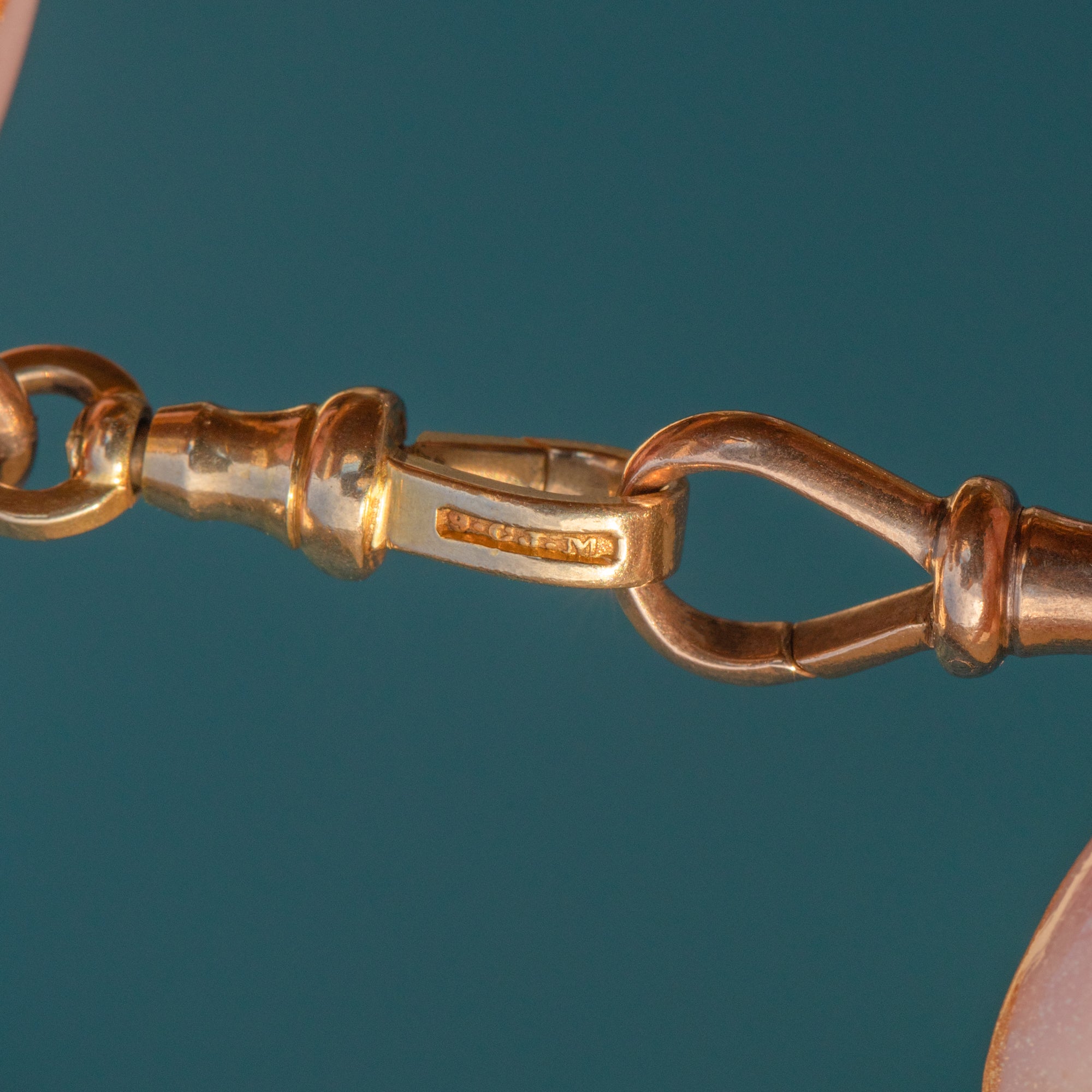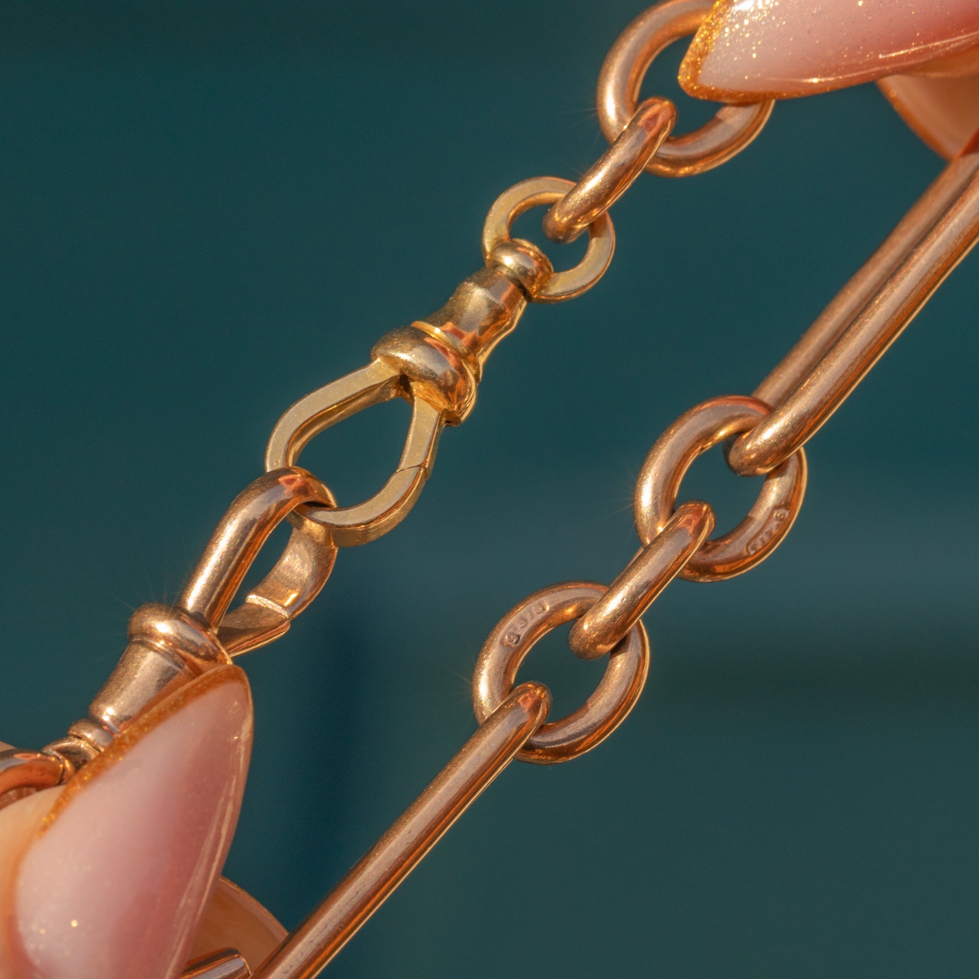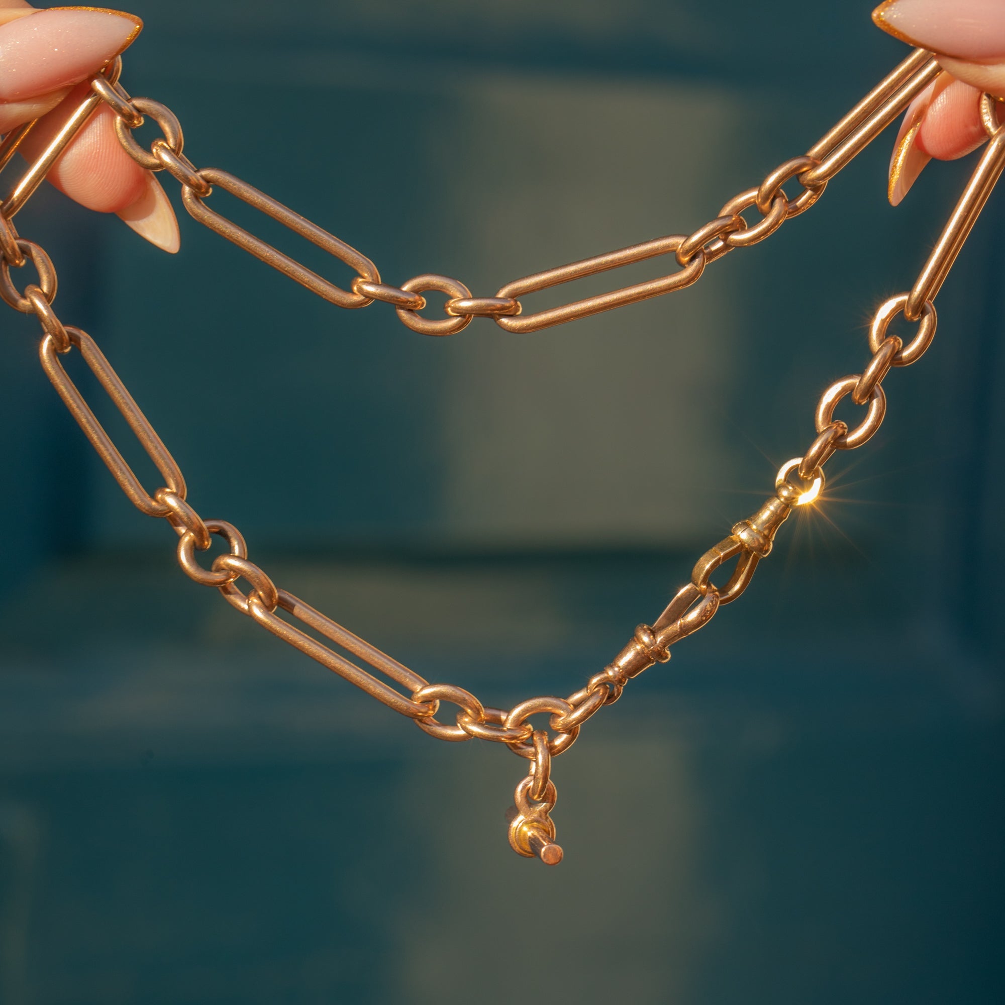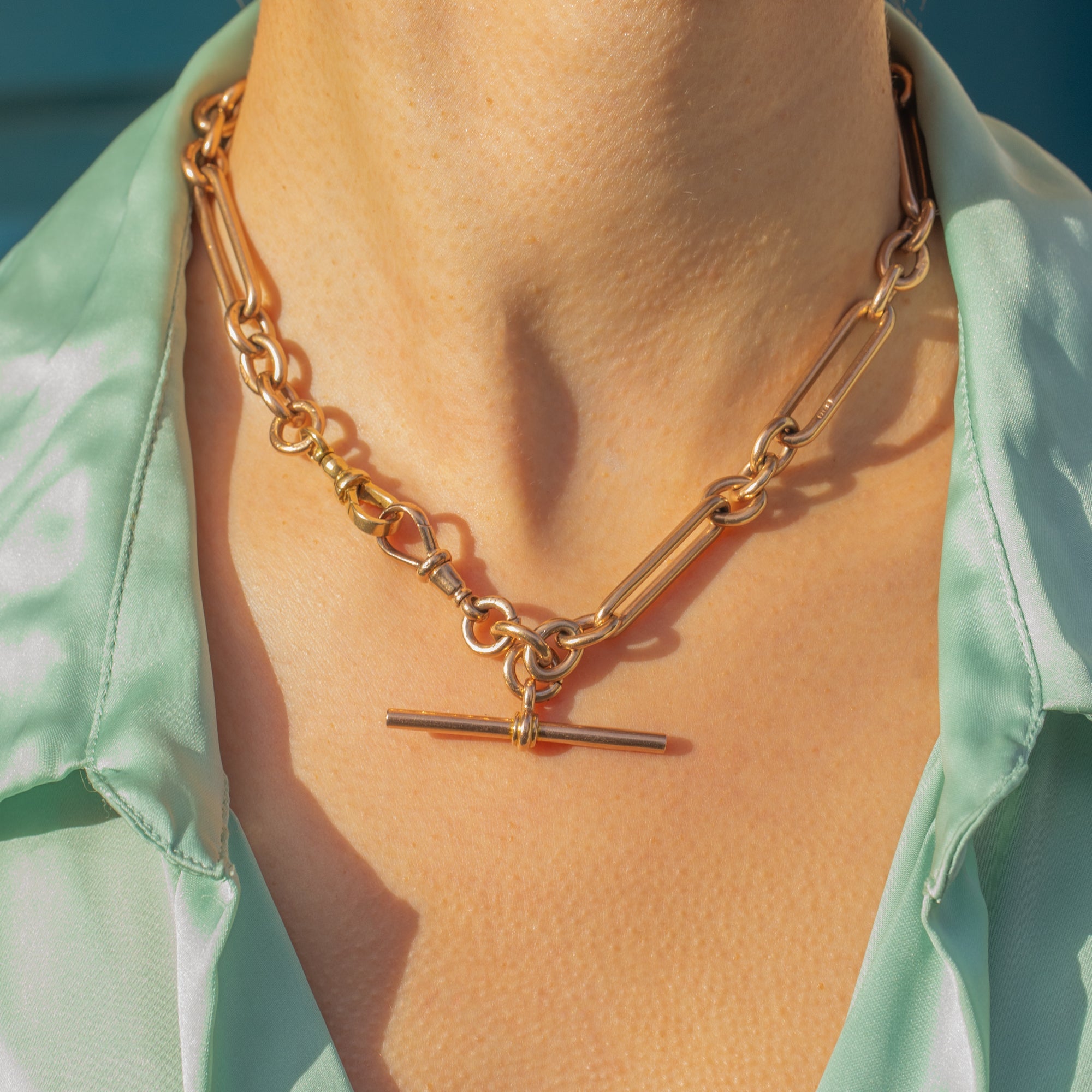 珍しい9ctゴールド トロンボーンTバー チェーン、2つのドッグクリップ 48.7グラム