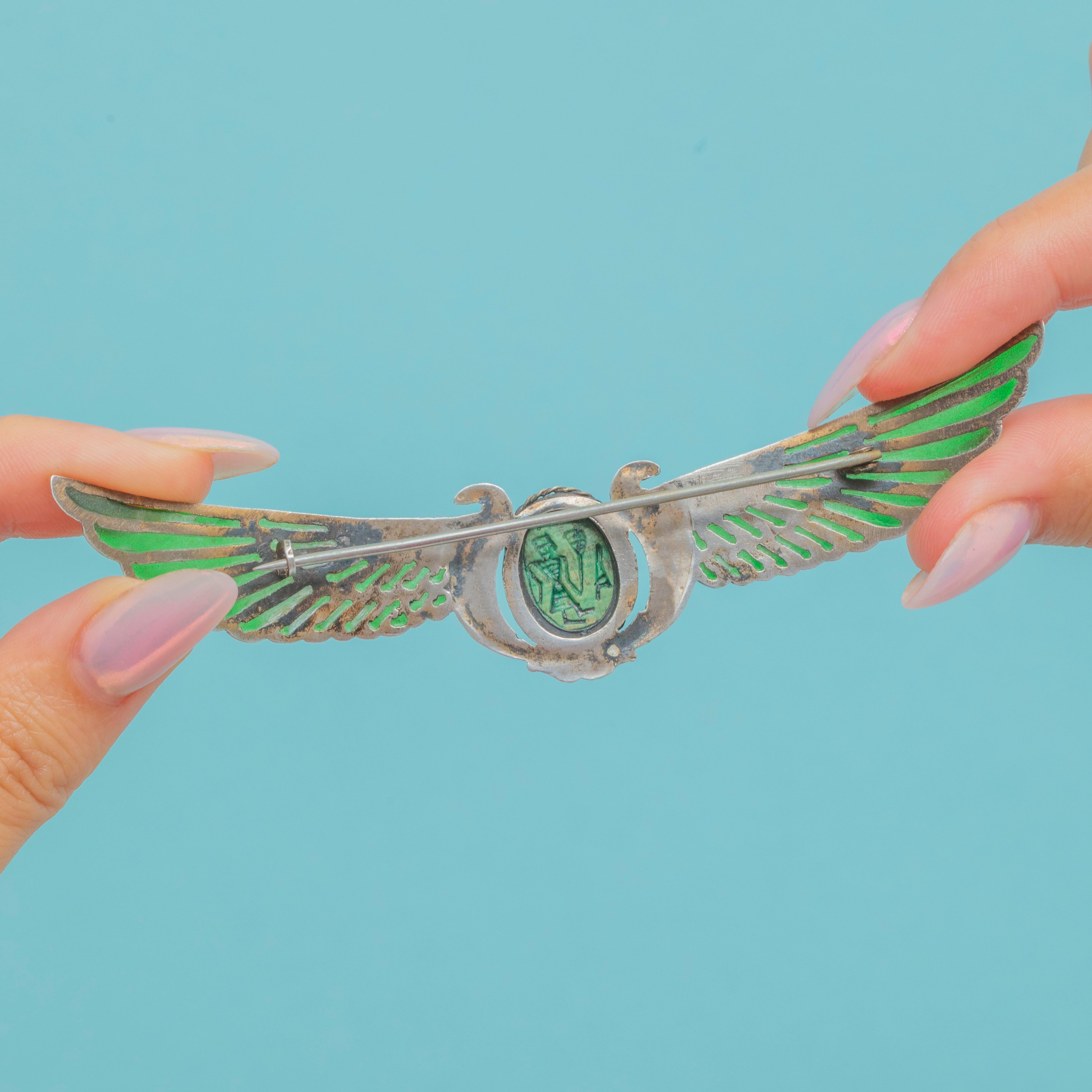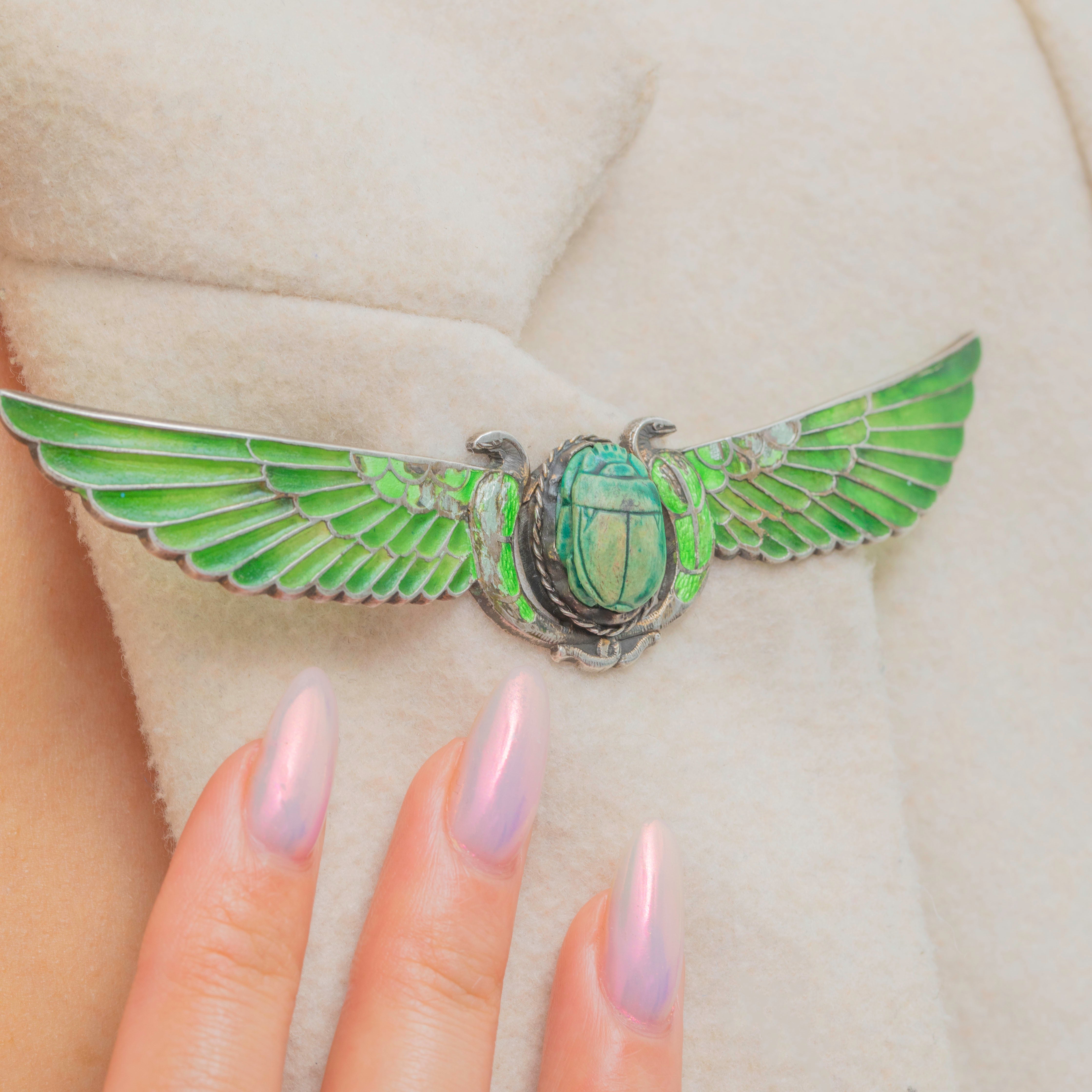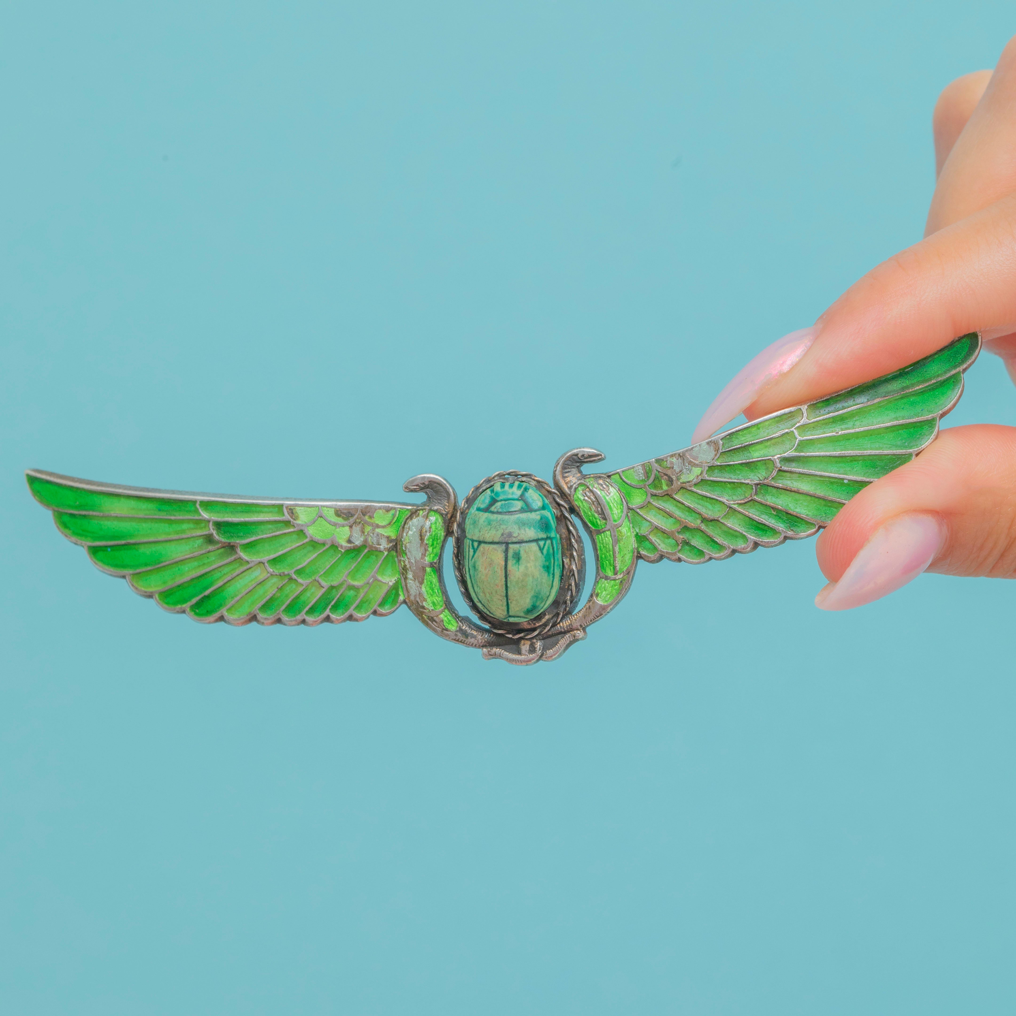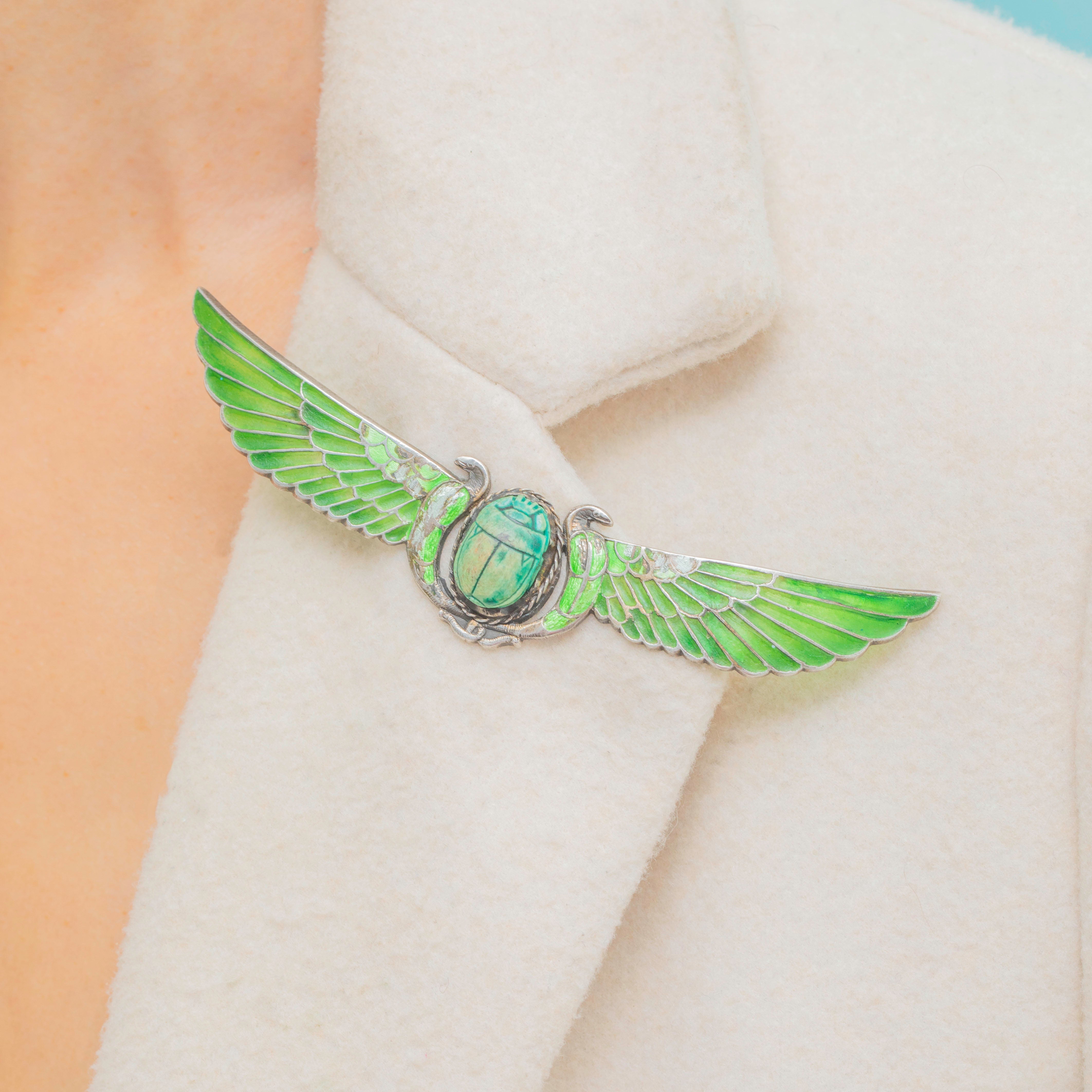 This rare Art Deco scarab beetle brooch is finely crafted from Silver and inlaid with a Faience Scarab and vibrant green Enamel.