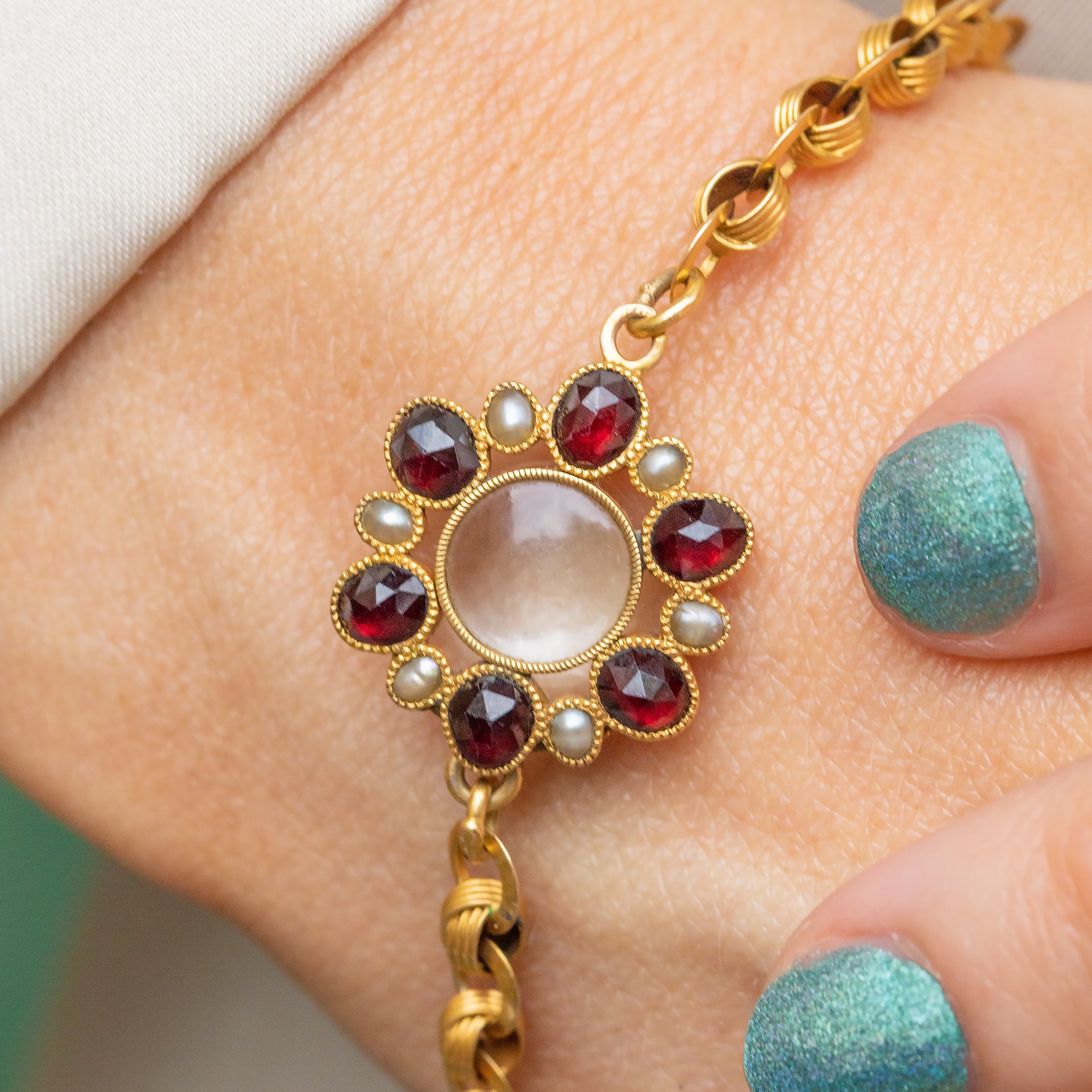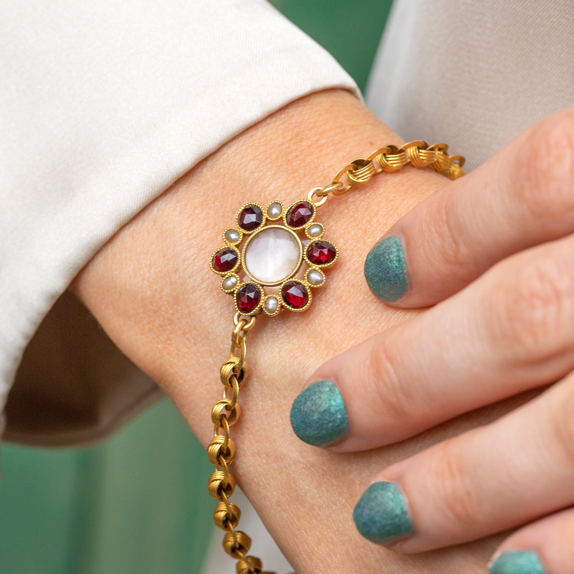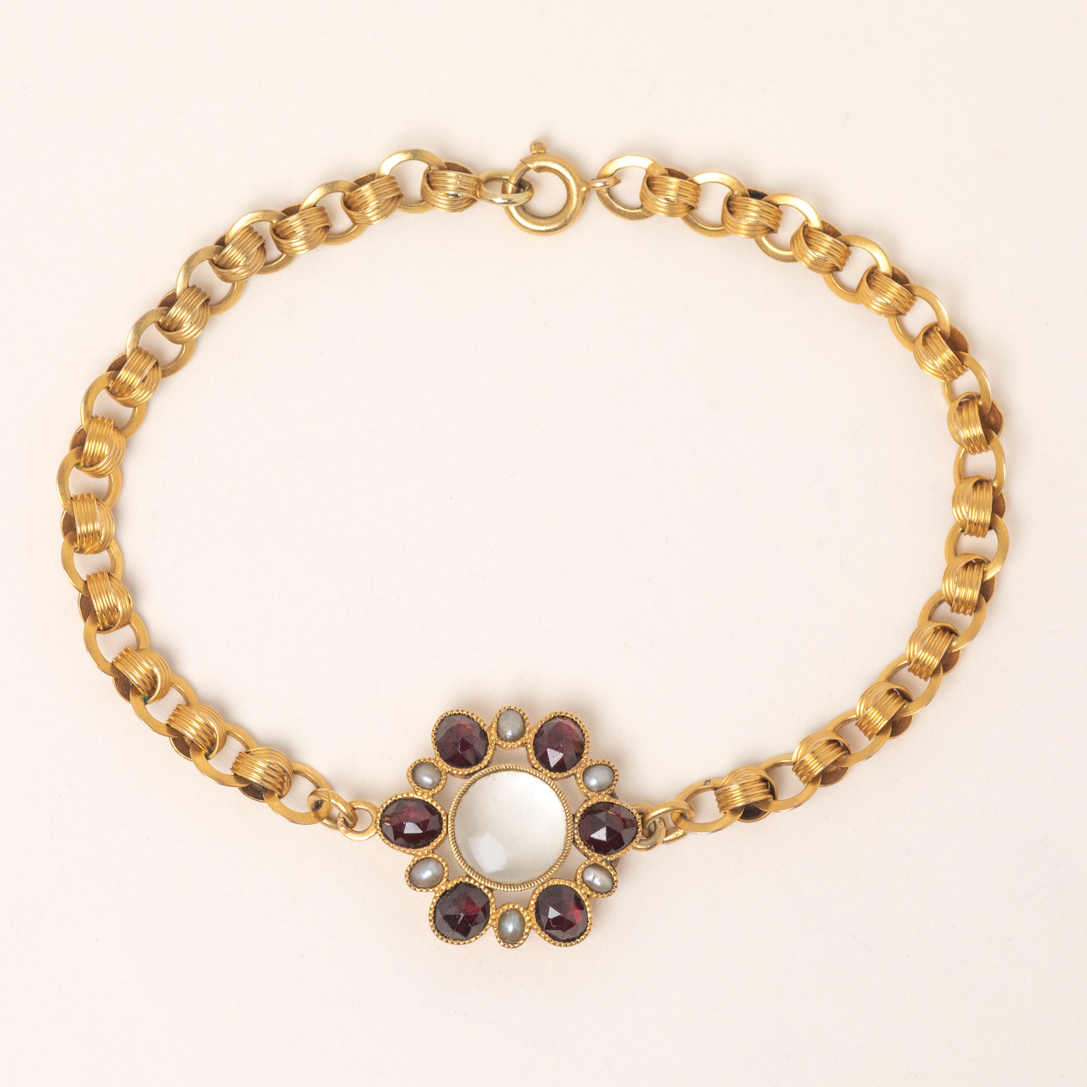 Immerse yourself in the charm of the early Victorian era with this 18ct Gold Garnet & Pearl flower bracelet. The links are a smooth 18ct Gold with a brushed finish that sit comfortably against the skin, and the piece has an undeniable charm with more than meets the eye!