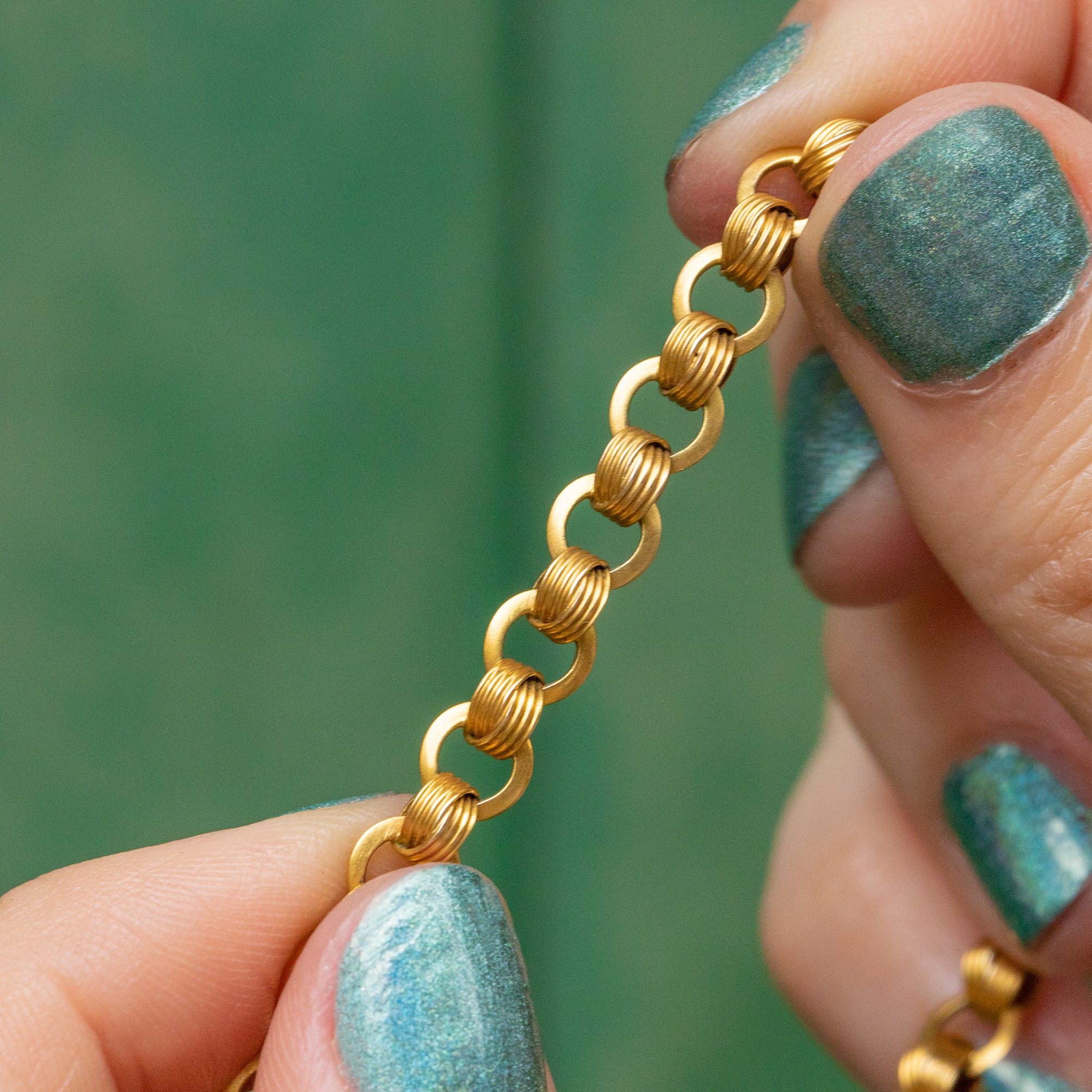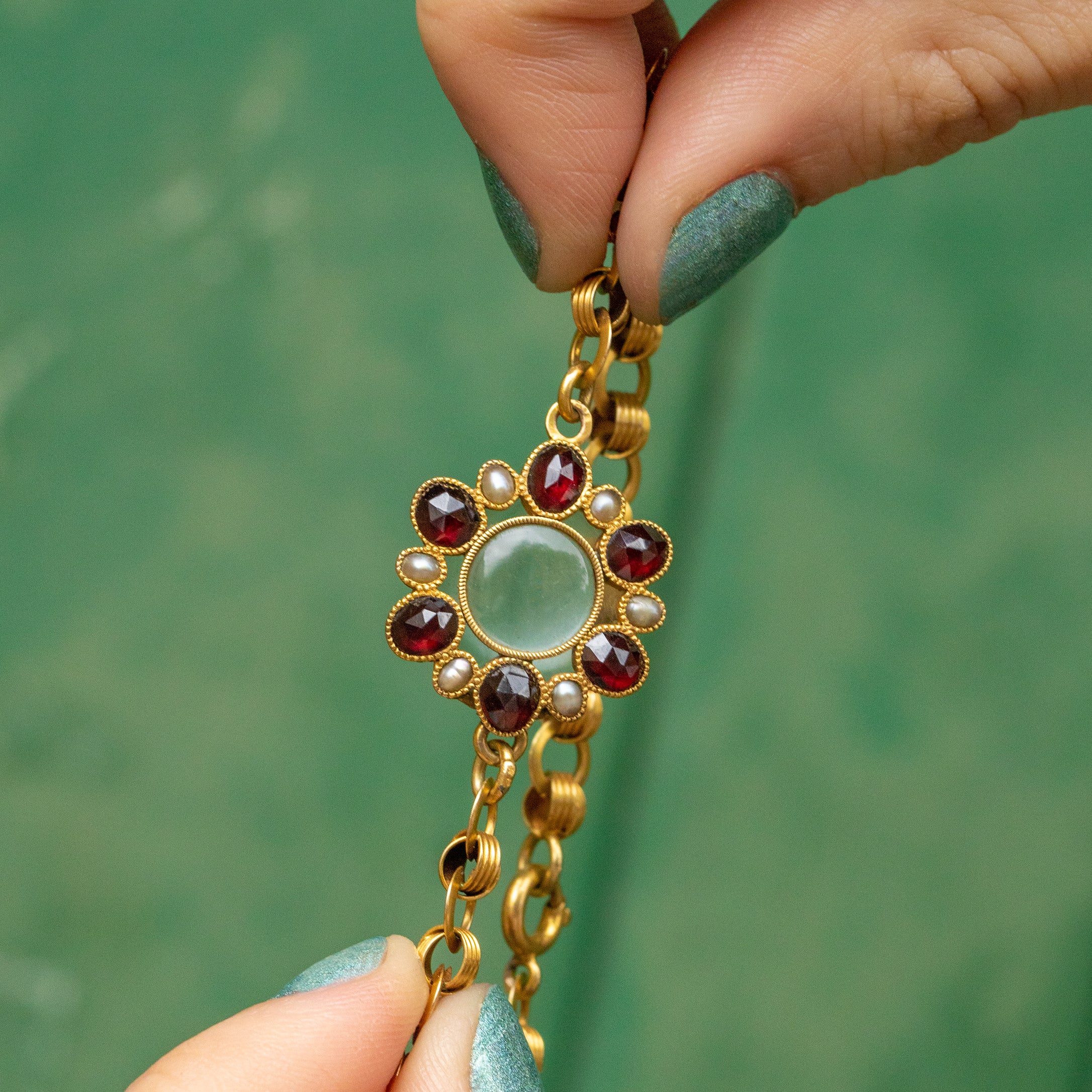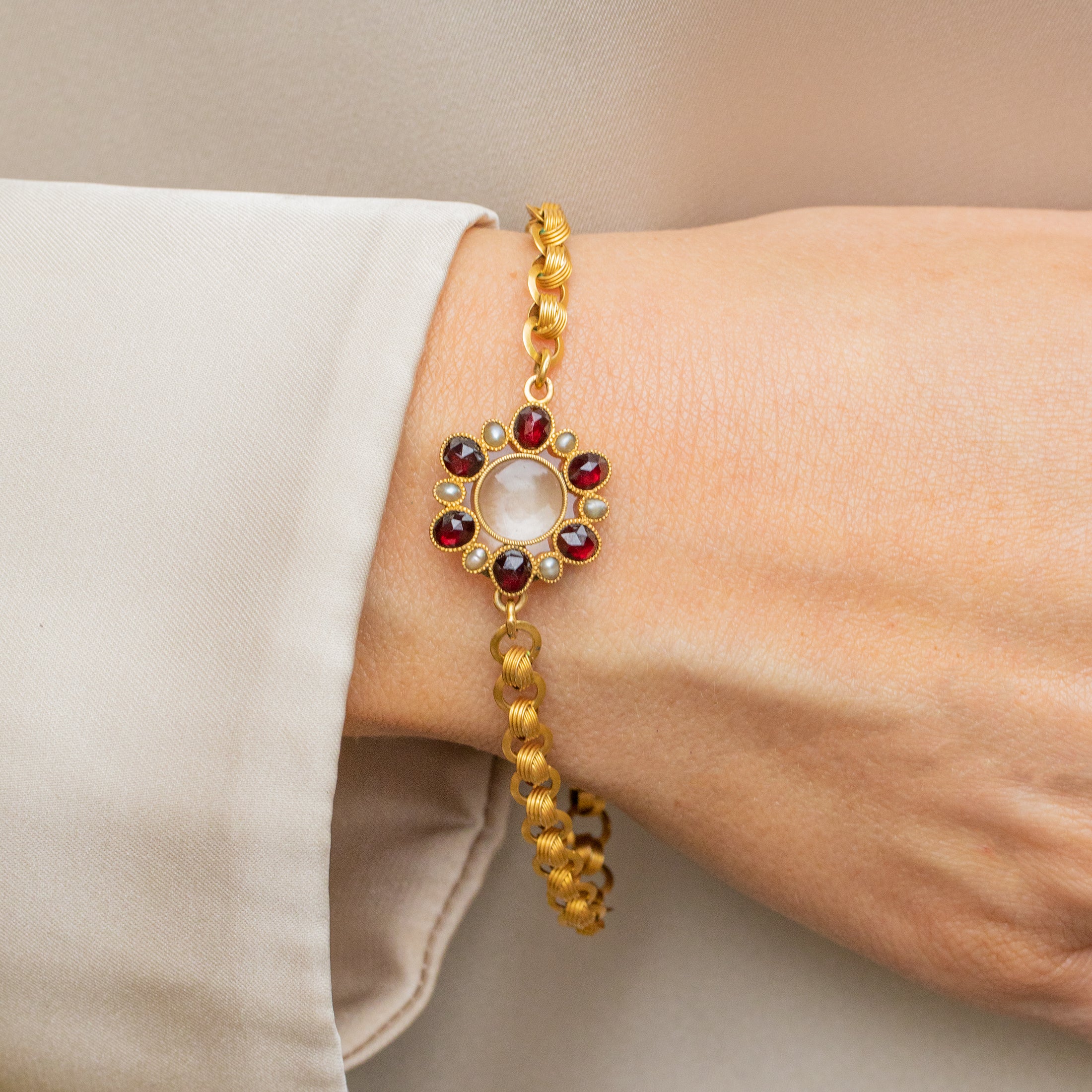Immerse yourself in the charm of the early Victorian era with this 18ct Gold Garnet & Pearl flower bracelet. The links are a smooth 18ct Gold with a brushed finish that sit comfortably against the skin, and the piece has an undeniable charm with more than meets the eye!