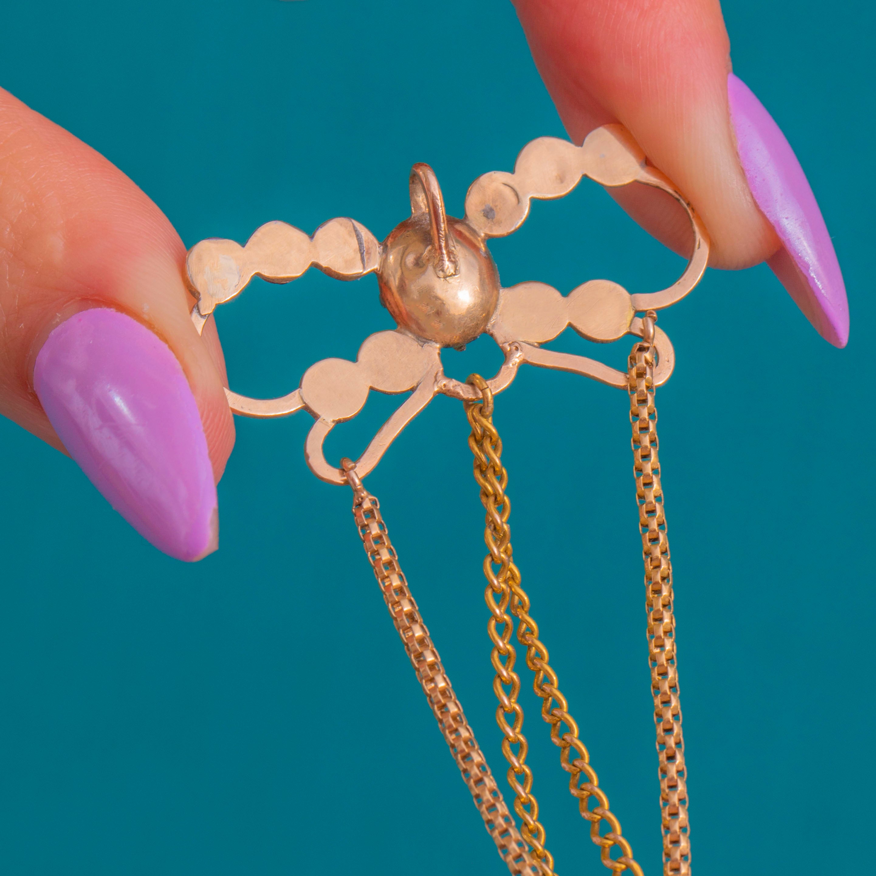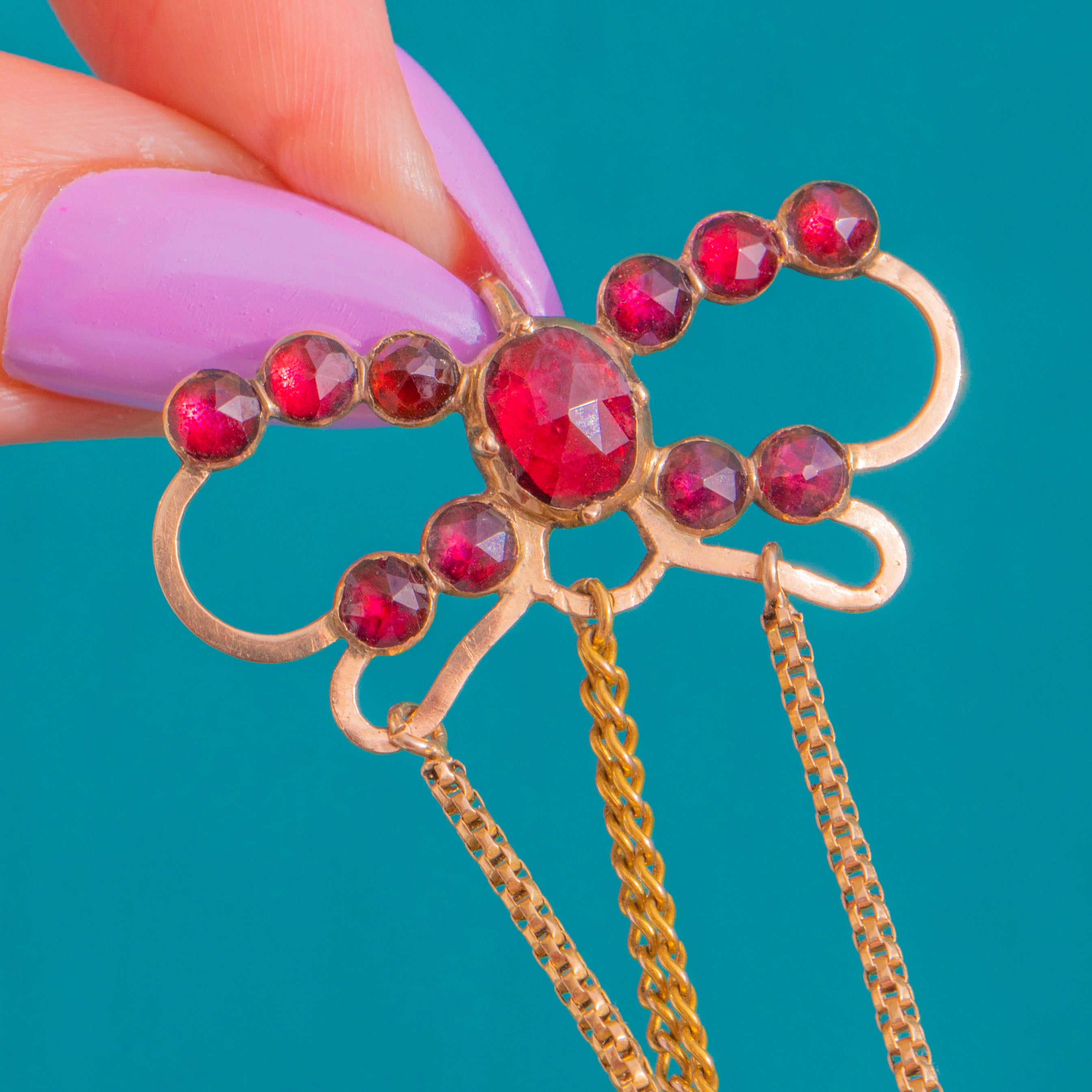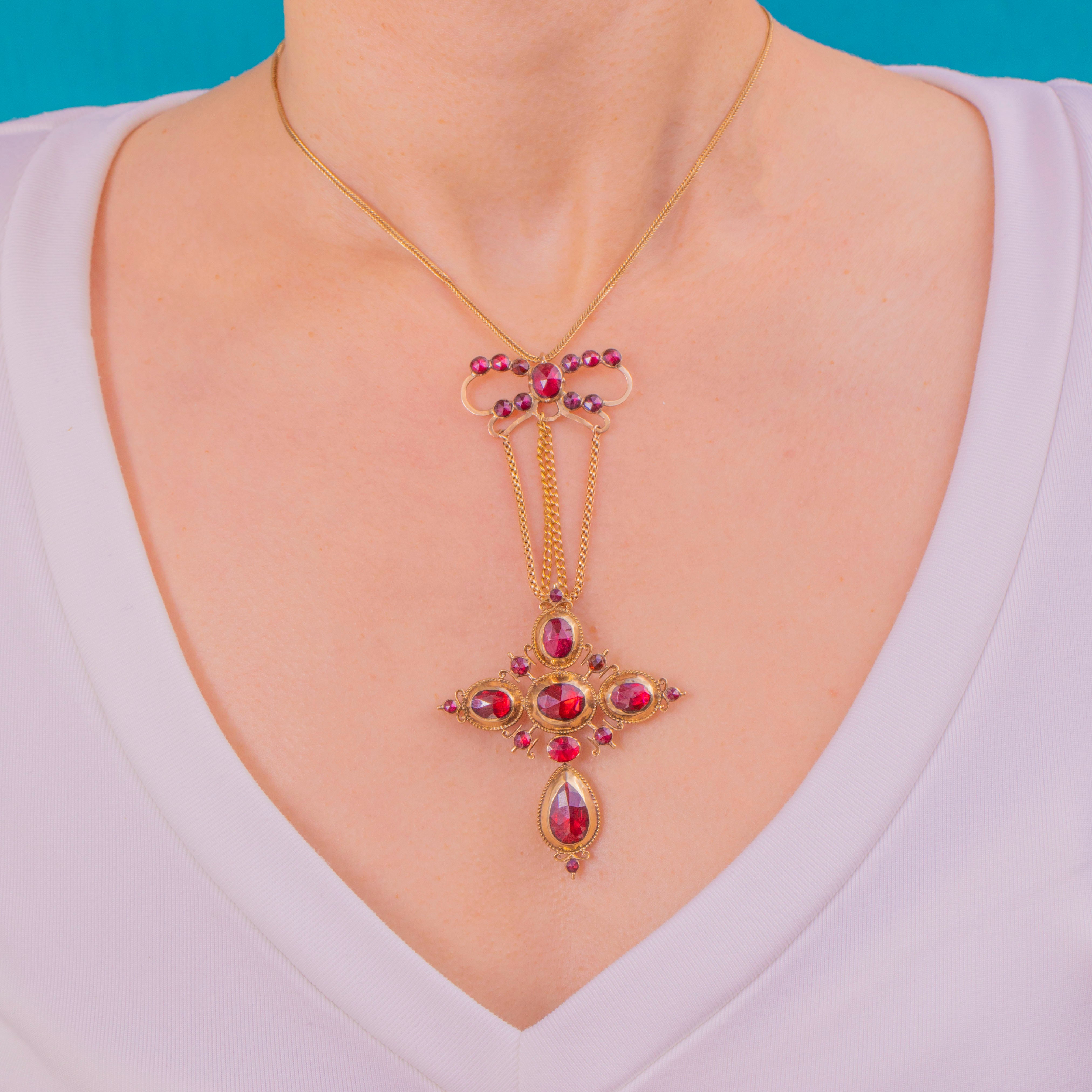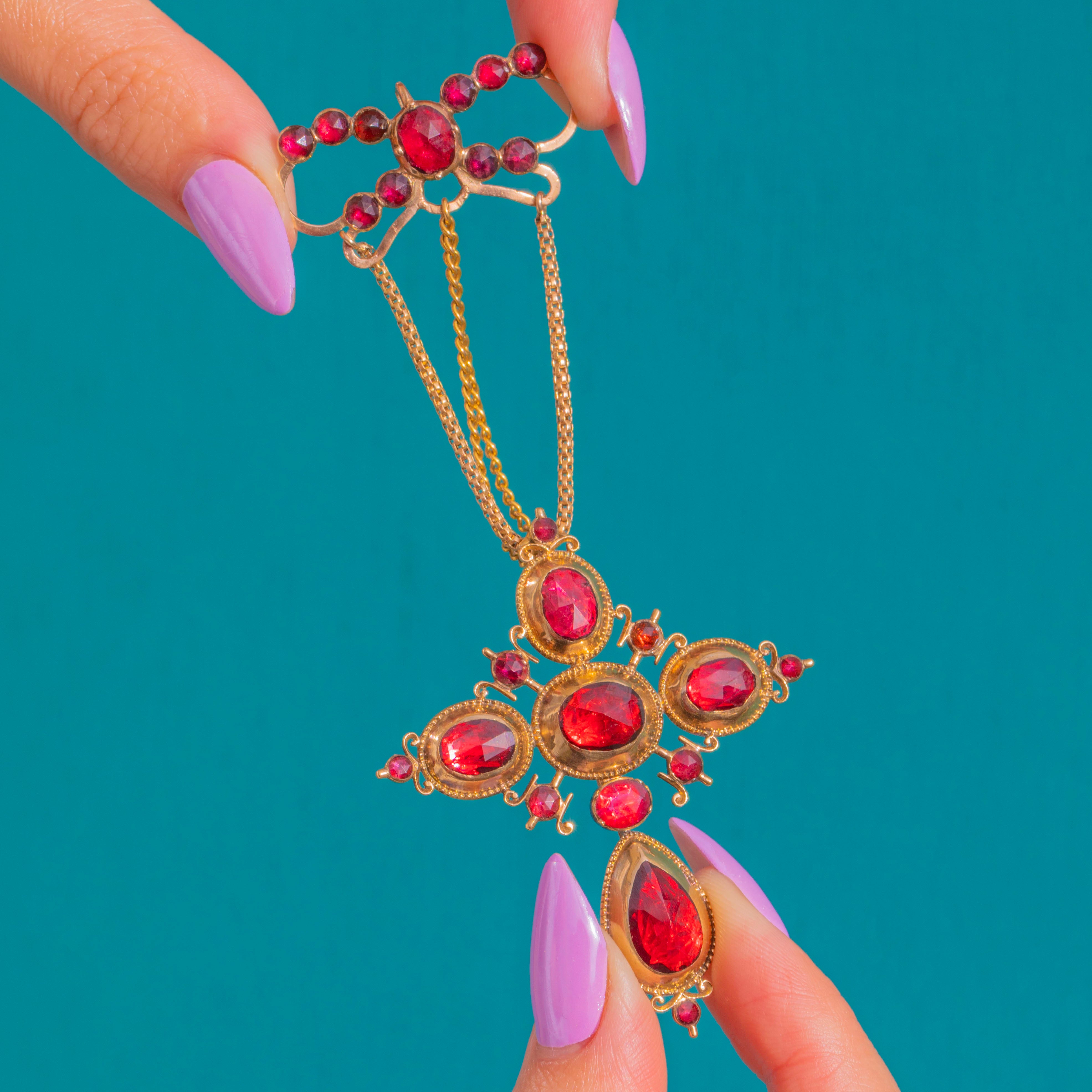 壮麗なGeorgian期のラヴァリエールスタイルのクロスペンダント。華やかなリボンモチーフのトップに、深みのあるワインレッドのペルピニャン・ガーネットが煌めく多連のドロップが連なり、贅沢な輝きを放ちます。リボンから三本の繊細なチェーンが流れるように交差し、シンメトリーなクロスを形作り、先端には優美なペアシェイプのドロップが揺れ動き、気品ある存在感を演出します。