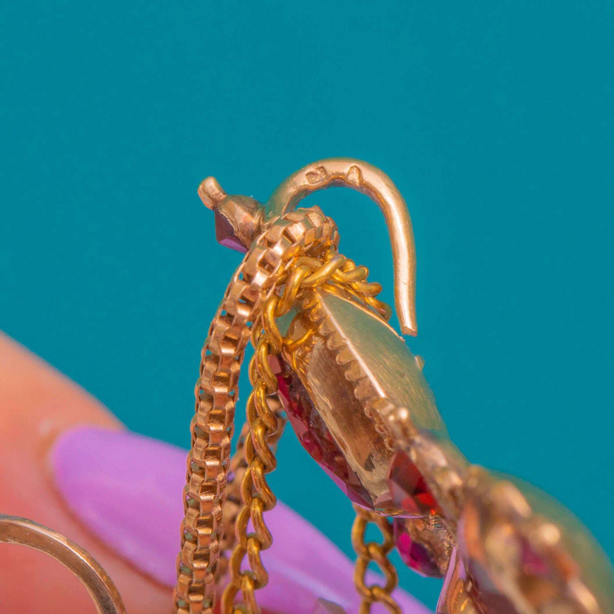 すべてのガーネットはローズカットで、立体的なクローズドバックの15カラットゴールドベゼルにセットされ、深紅の石に柔らかくロマンティックな輝きを添えています。手作業による仕上げ、微細なビーズ状の端部や植物モチーフのコネクターが装飾性を高め、アーティキュレート構造により、身に着けた際にしなやかに揺れ、優雅な動きを見せます。