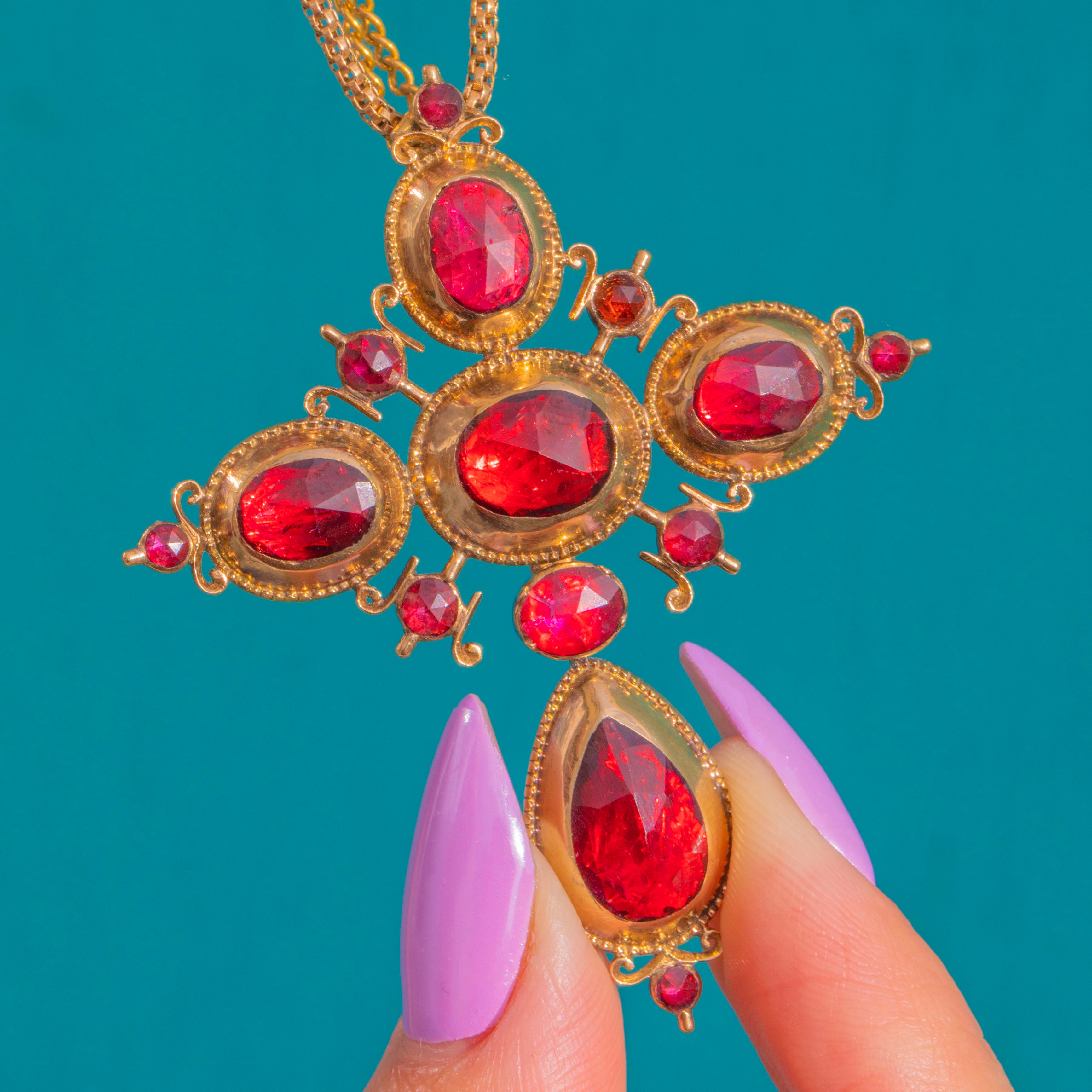 希少なGeorgian 18金ゴールド ペルピニャン ガーネット クロス ペンダント(リボン付き)c.1800