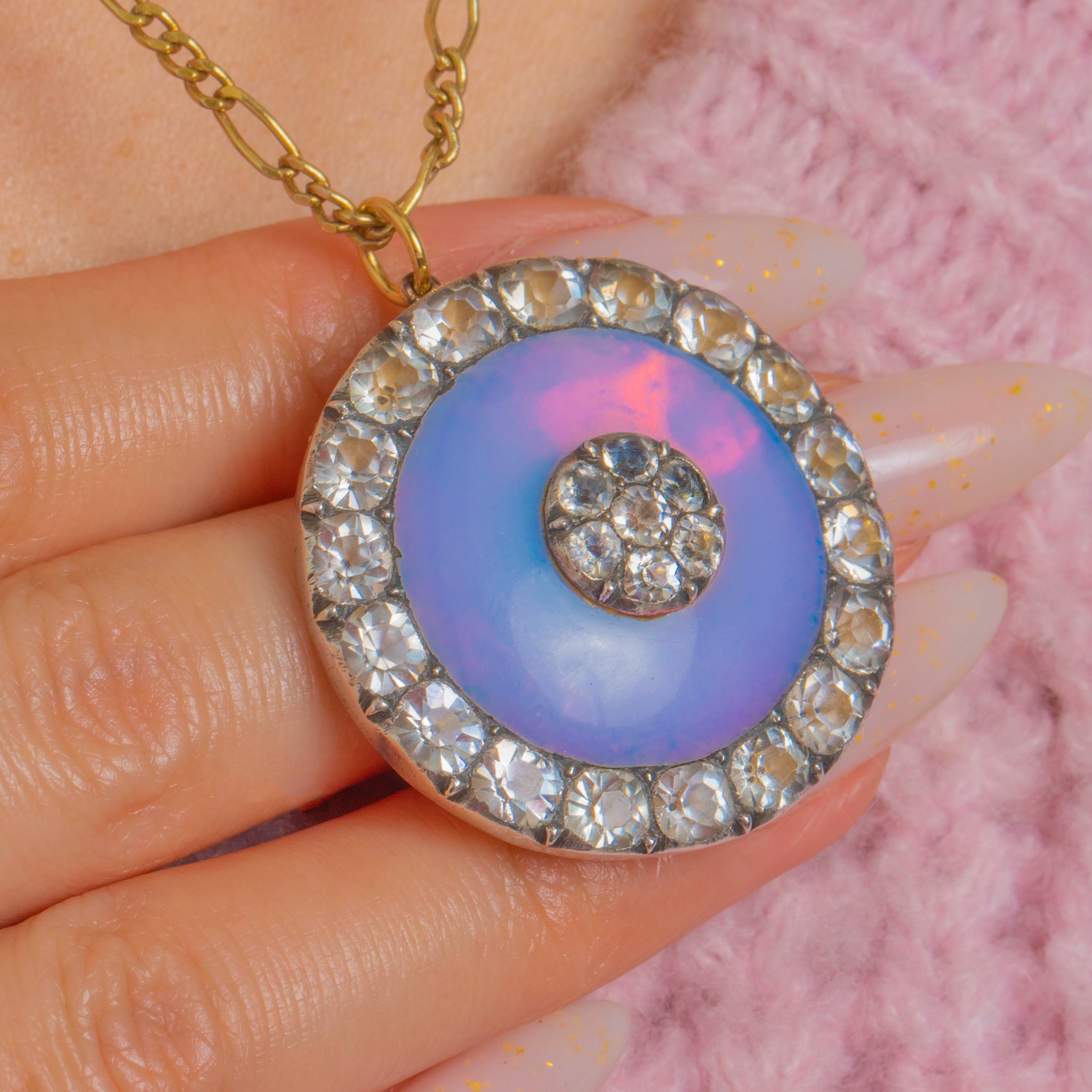 A luminous Georgian Silver roundel pendant with a dreamy Opaline centre that shimmers lavender-blue with soft pink flashes. At its heart sits a petite cluster of clear Paste, framed by a radiant halo of larger, graduated Paste stones. The crisp concentric “target” motif, closed-back collets and elegant symmetry deliver that sought-after period glamour in a wonderfully wearable design.