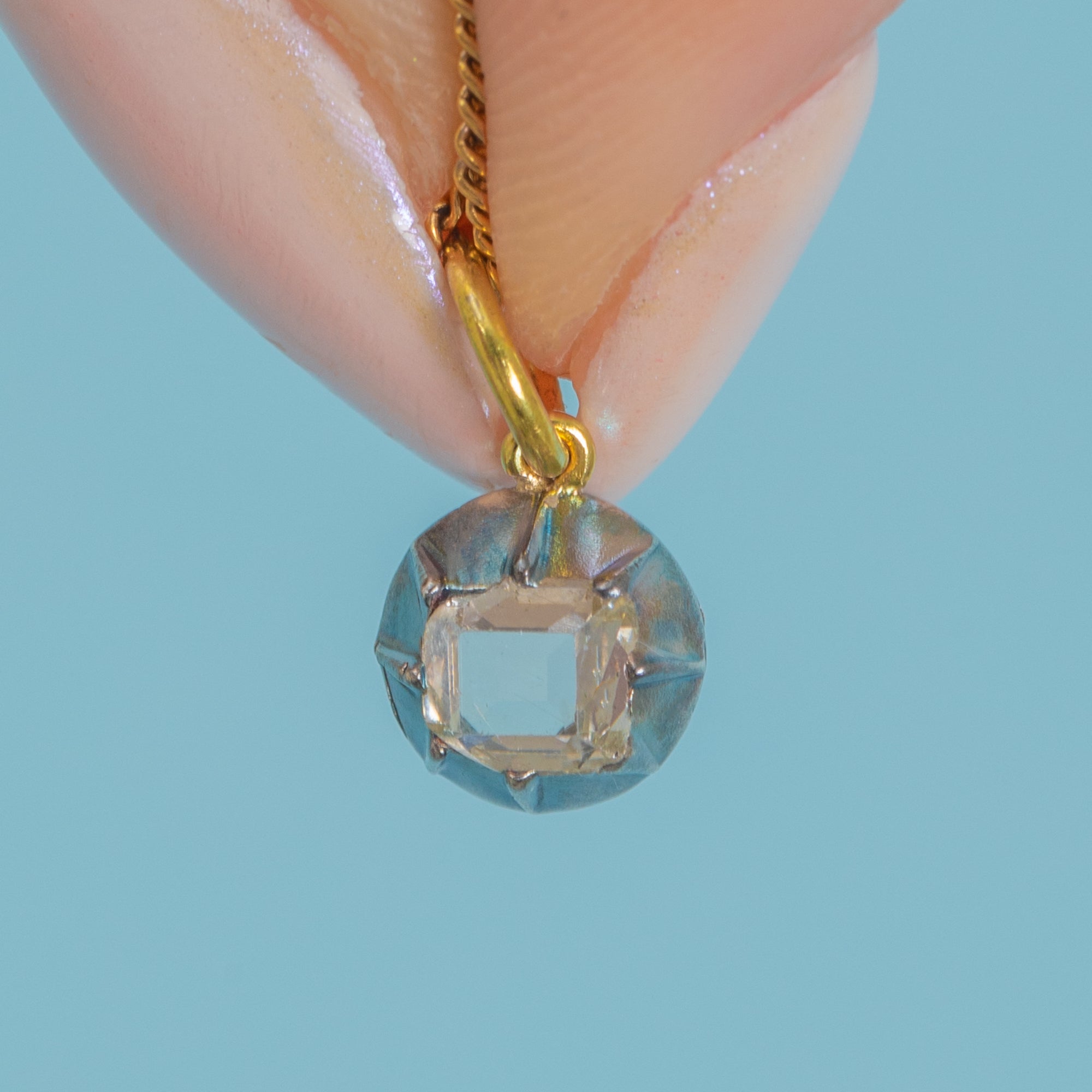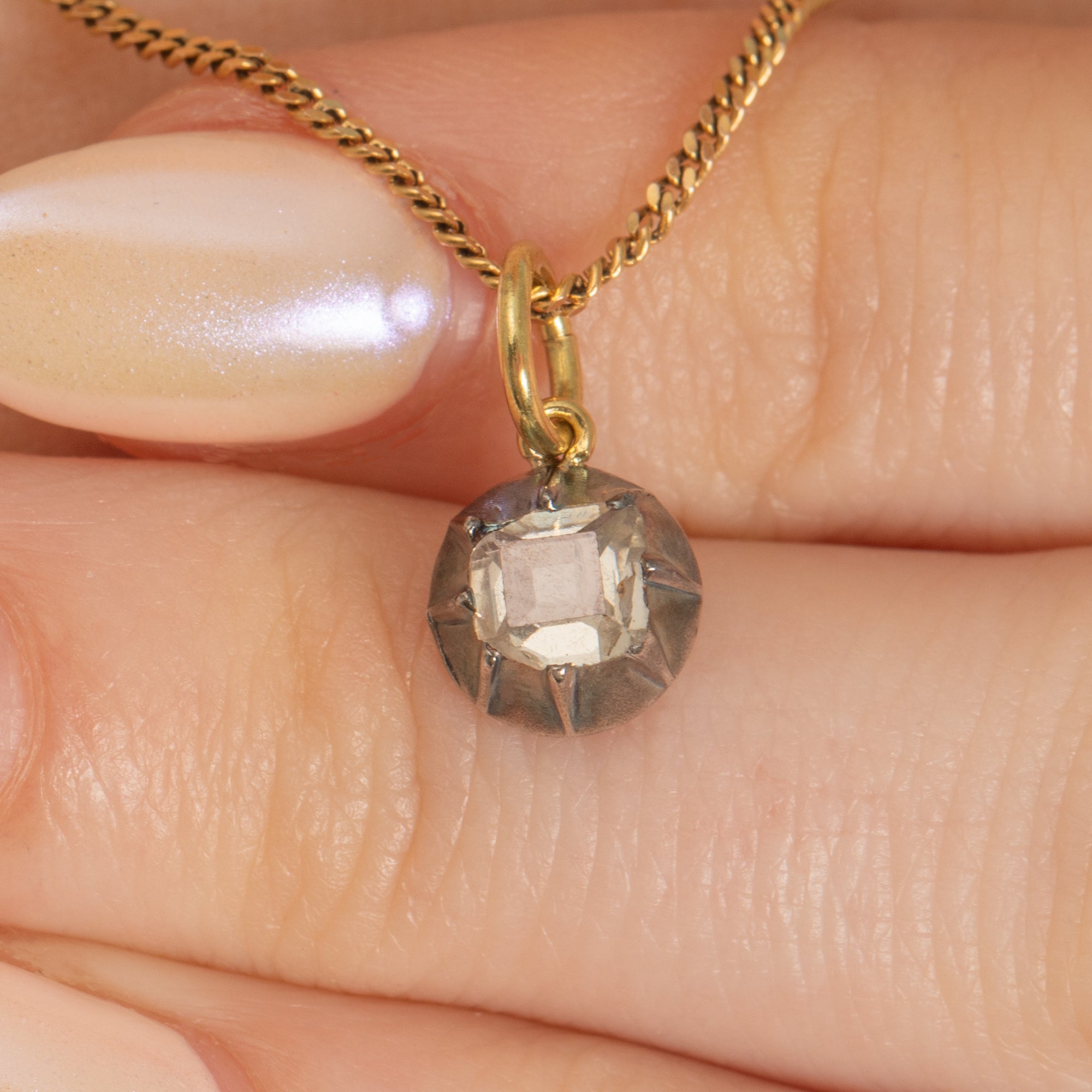 EXCELLENT. This rare Georgian table-cut Diamond charm is in excellent condition. The table-cut Diamond has crisp facets, free from fleabites or abrasions, and is securely held within its collet setting. There is some minor wear on the back of the Silver setting, but this cannot be seen when the pendant is worn and can easily be forgiven, especially when considering its grand age!