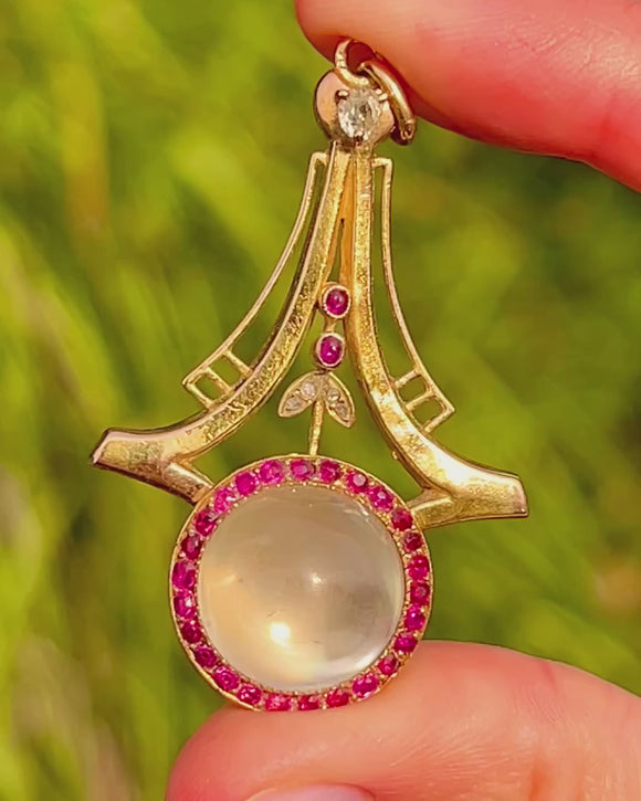 希少なユーゲントシュティール様式 一四金 月長石 紅玉 金剛石 標的型ペンダント