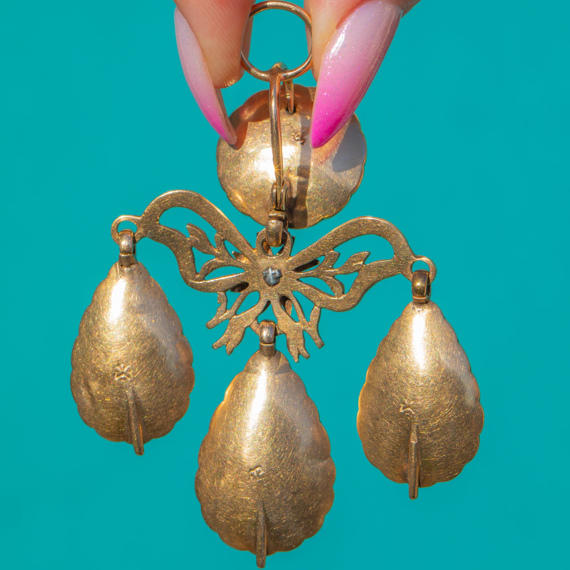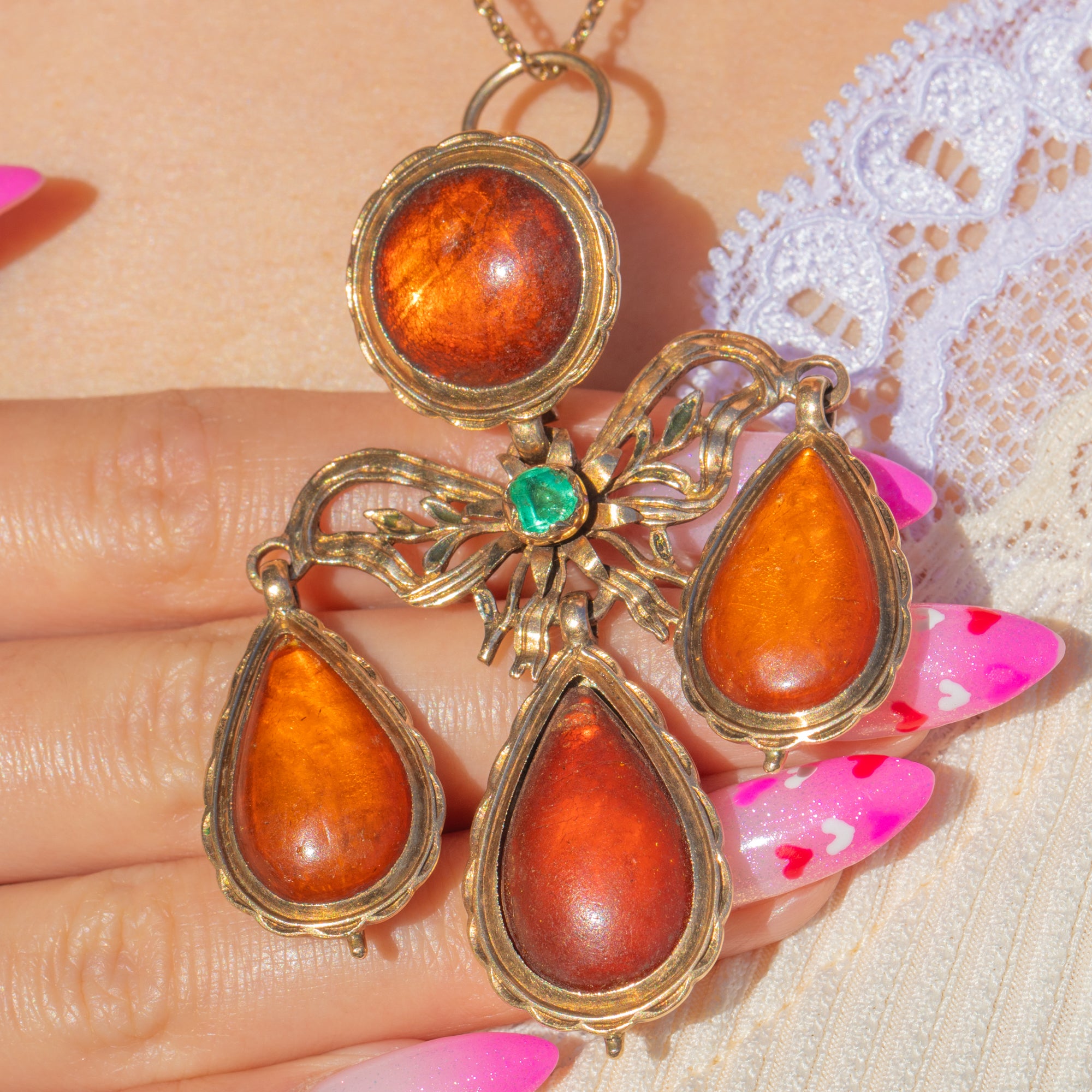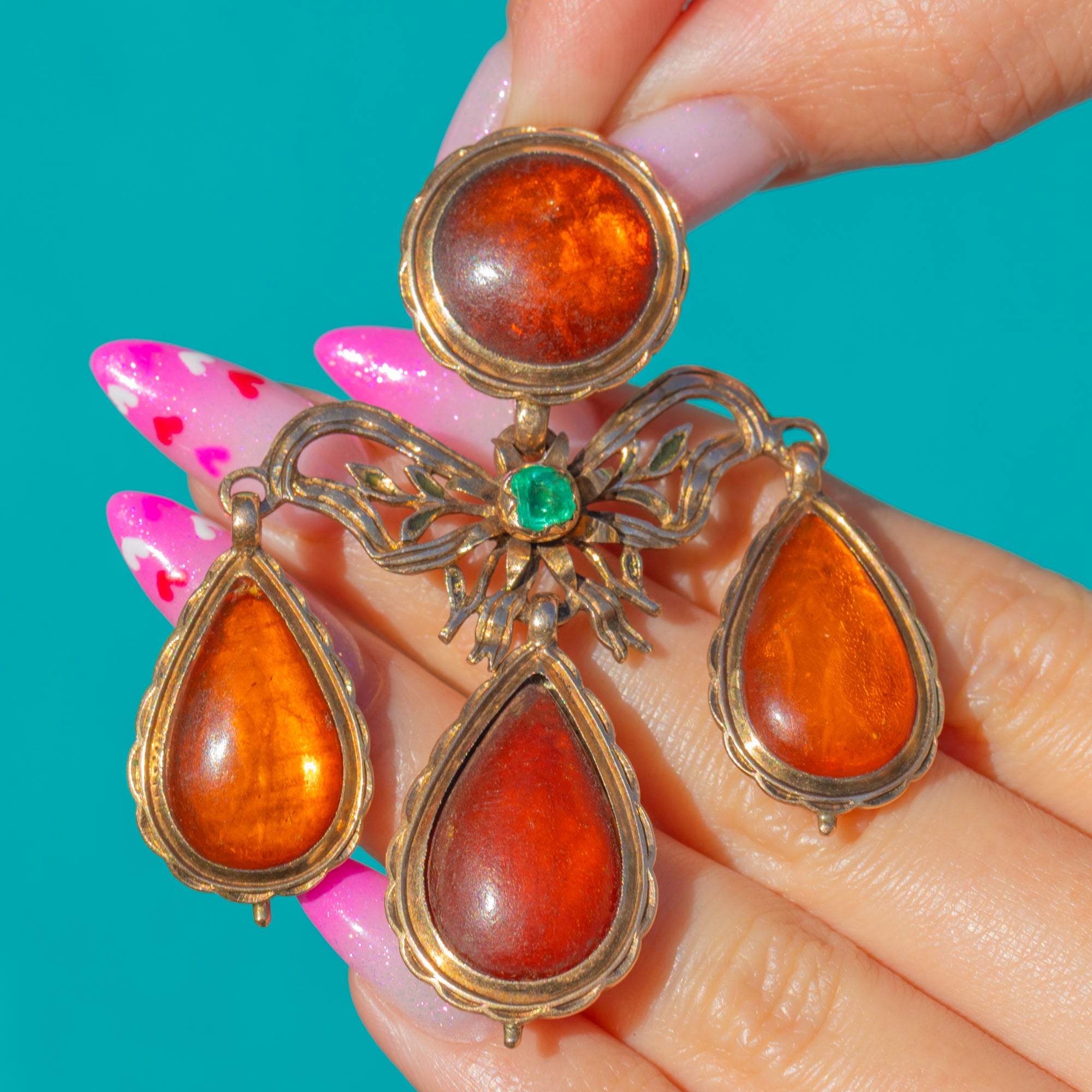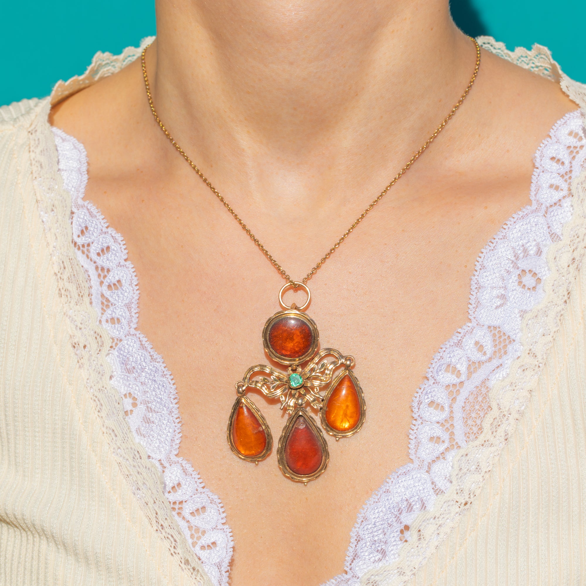 贅沢なポルトガル製Georgian時代のジランドールペンダント(約1760年製)。艶やかなアンバーが輝き、鮮やかなエメラルドがアクセントを添えています。重厚な18金ゴールドで仕立てられ、中央にはラウンド型アンバー・カボションが優美なリボンと植物モチーフの透かし細工の上に配され、三つの可動式ペアシェイプ・アンバードロップが流れるように連なります。スカラップ状のクローズドバックベゼルと滑らかな動きは、まさにGeorgian様式の真髄。歩みとともに揺れる、ロマンティックなシャンデリアシルエットを描きます。