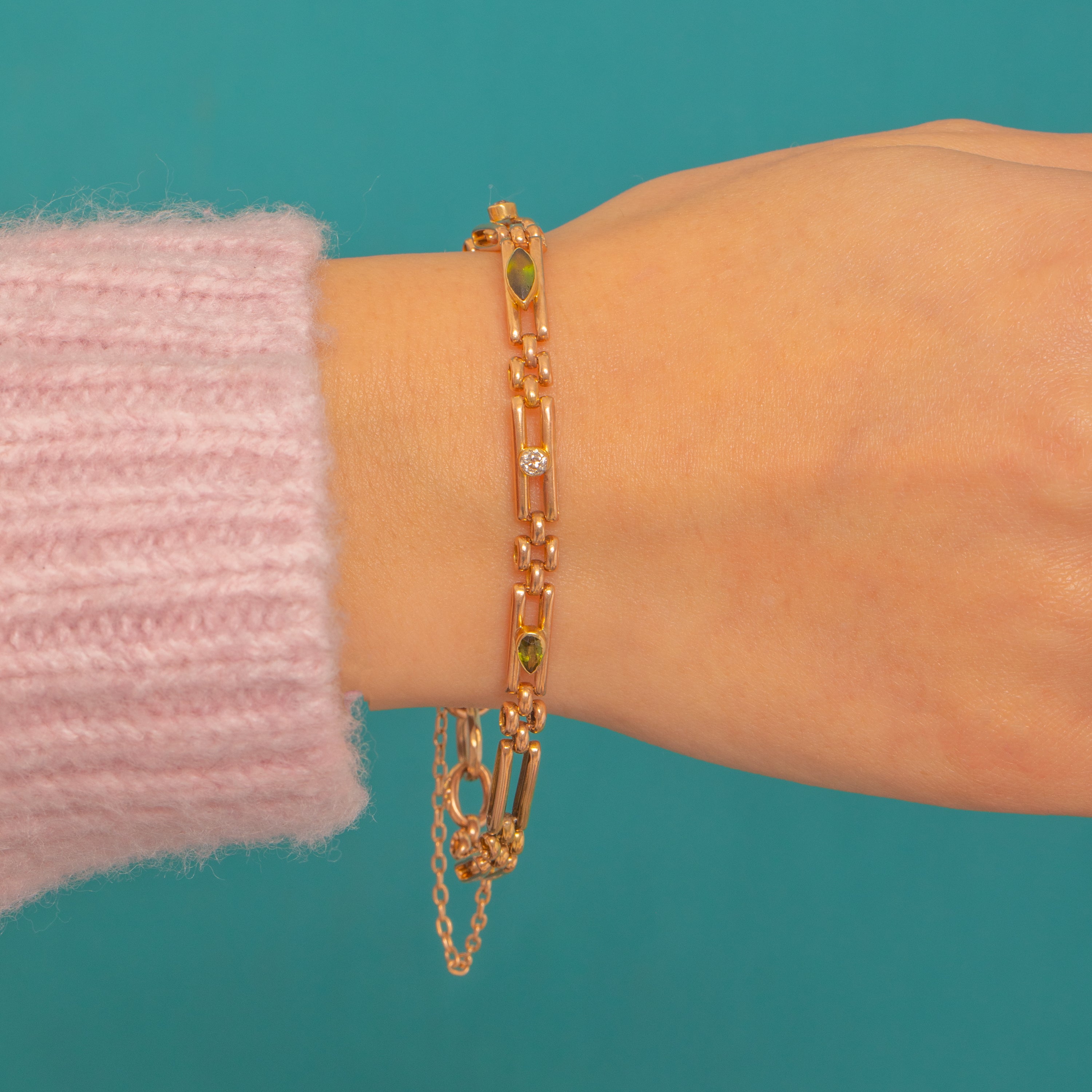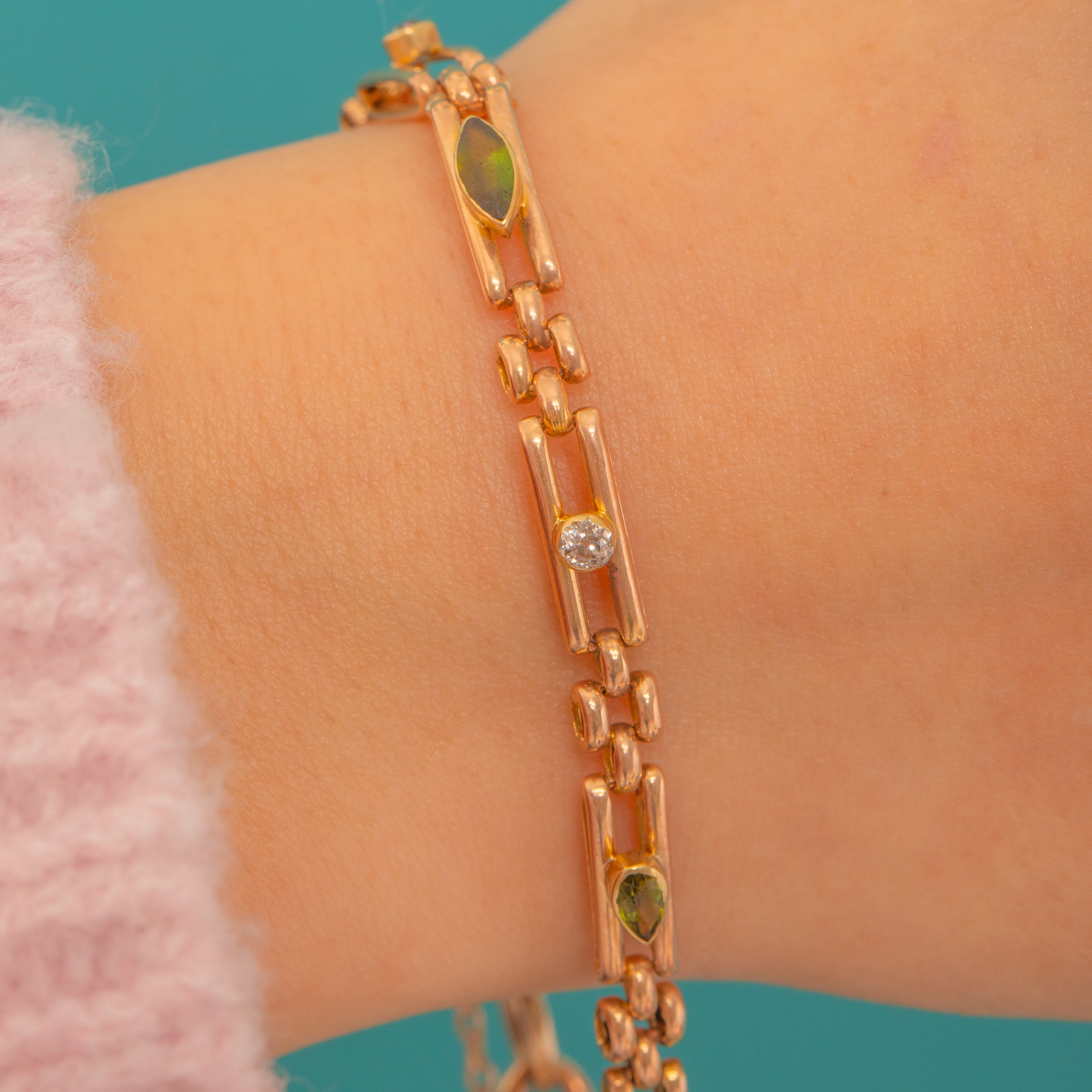 A chic Edwardian 15ct Gold bracelet with a refined bar-link silhouette, set at intervals with verdant Green Tourmalines and twinkling Old Mine Cut Diamond accents. Two pear-cut Tourmalines and a single marquise-cut stone sit in smooth bezel settings along sleek rectangular links, creating an elegant line of colour that’s delicate on the wrist yet full of character.