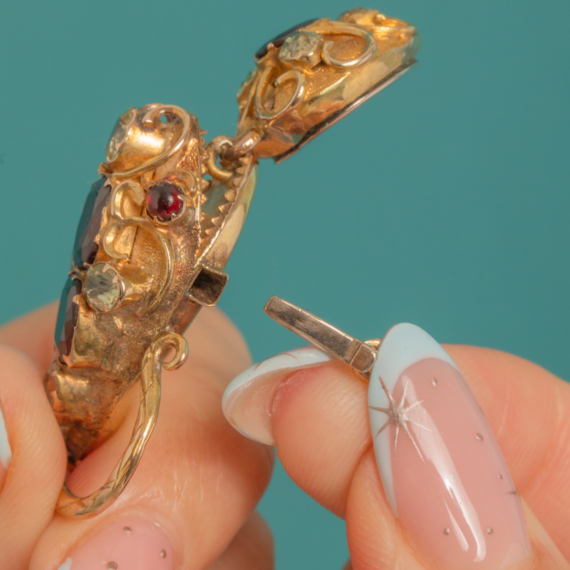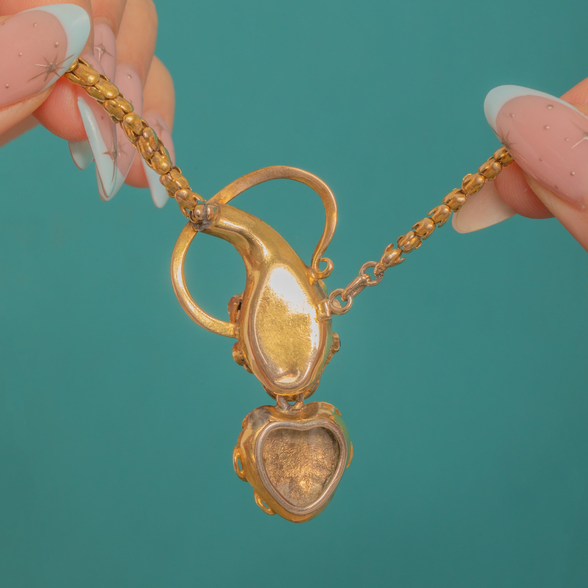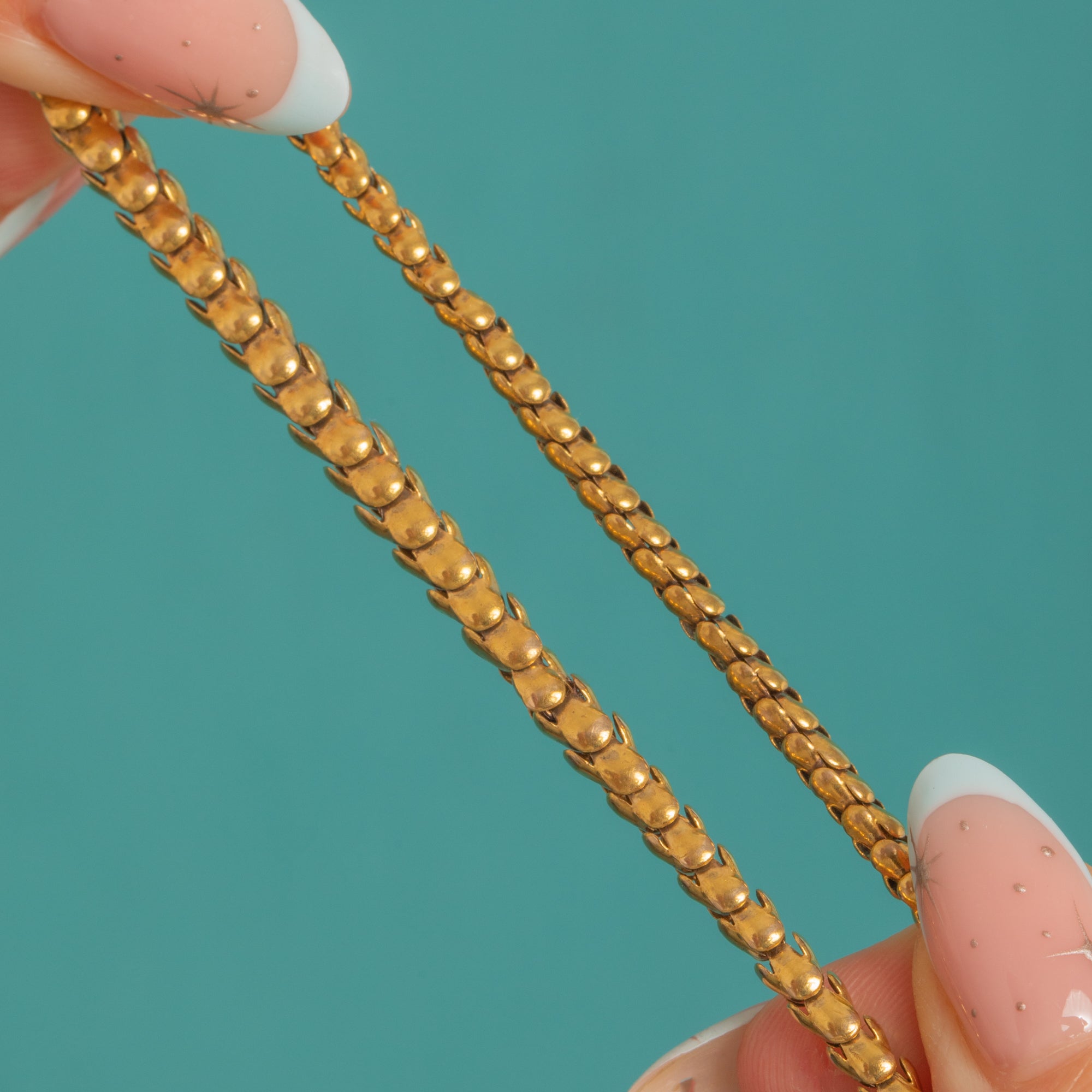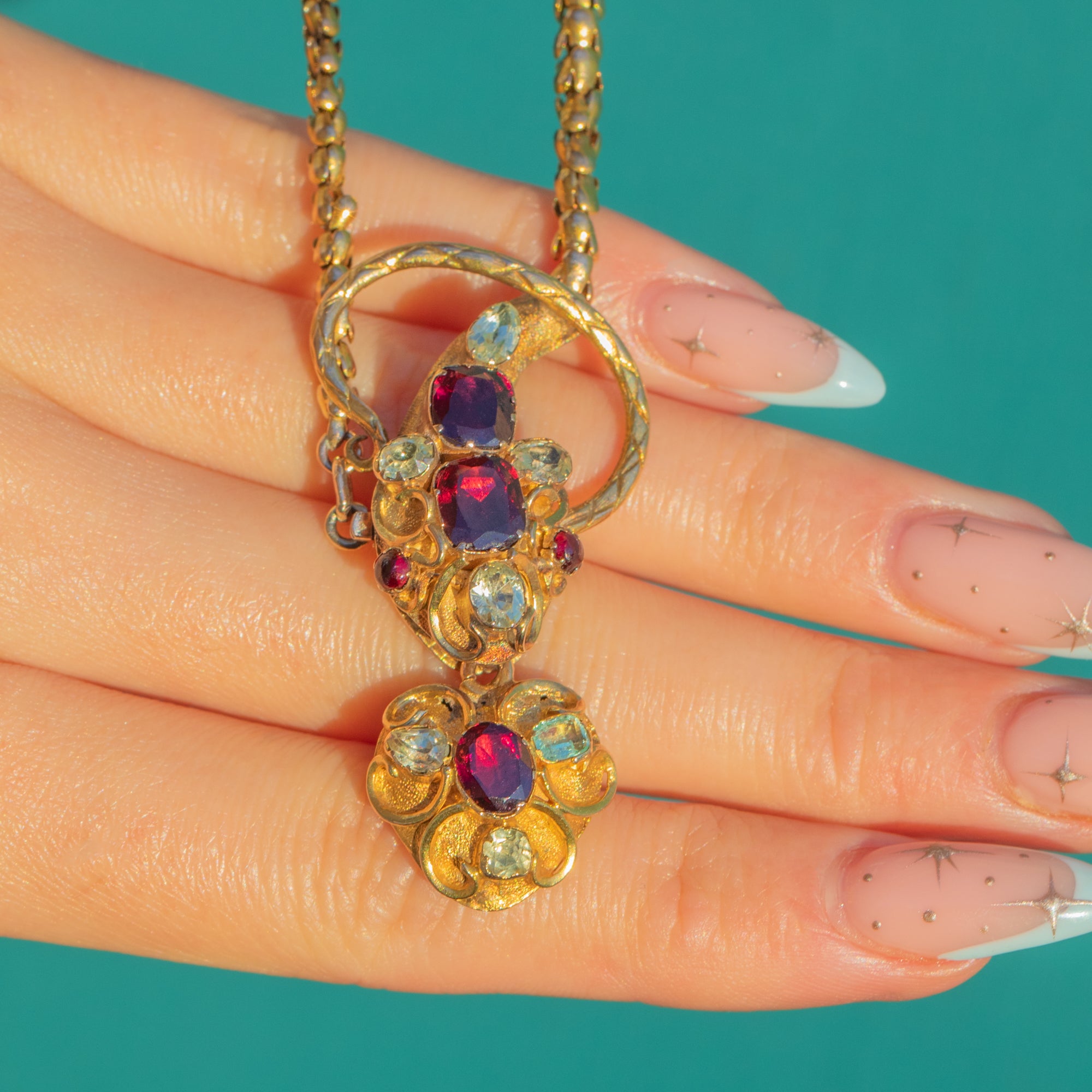 A glorious example of Victorian serpentine jewellery, this snake necklace is crafted in rich 18ct Gold and set with a duet of Garnet and Chrysoberyl gemstones. The supple, graduating links flow into a sculptural snake motif, beautifully punctuated by bright Chrysoberyl and lush Garnet accents for that signature antique allure.