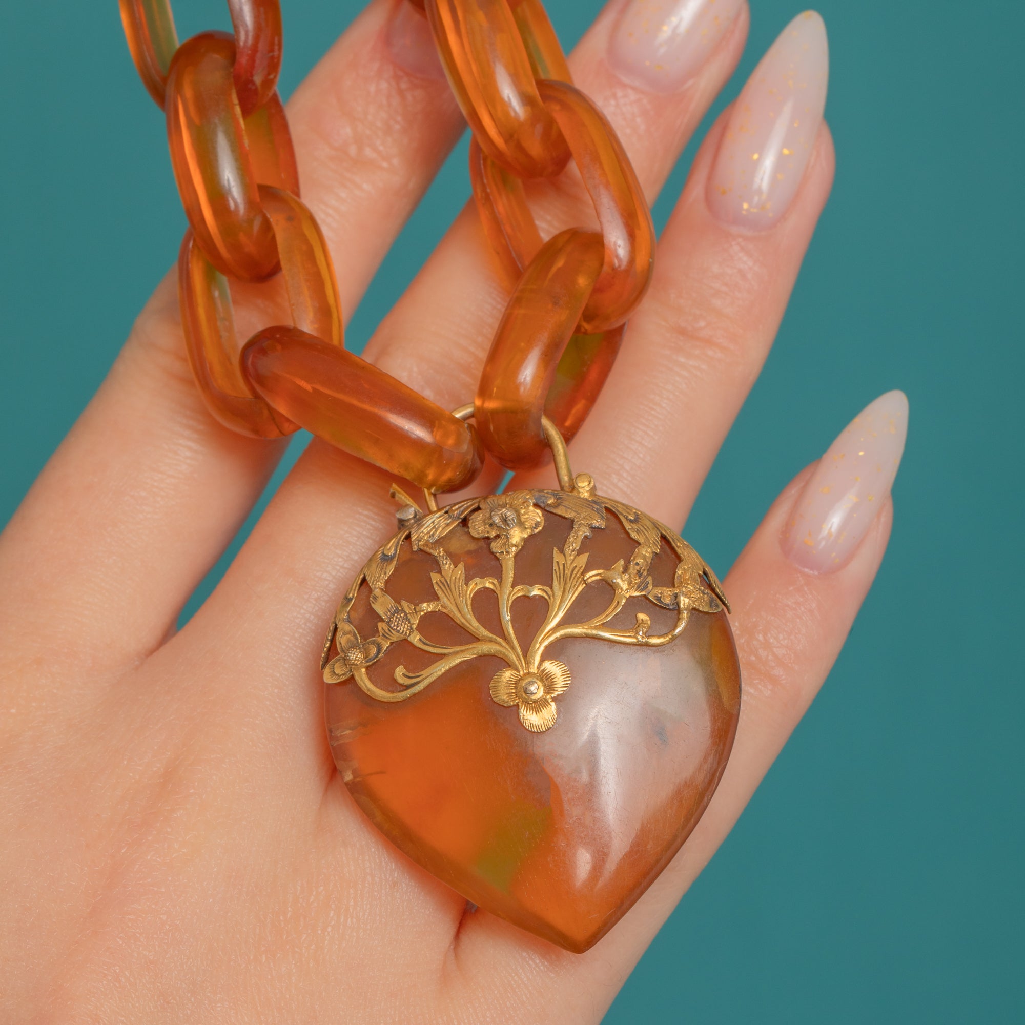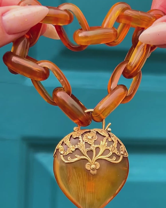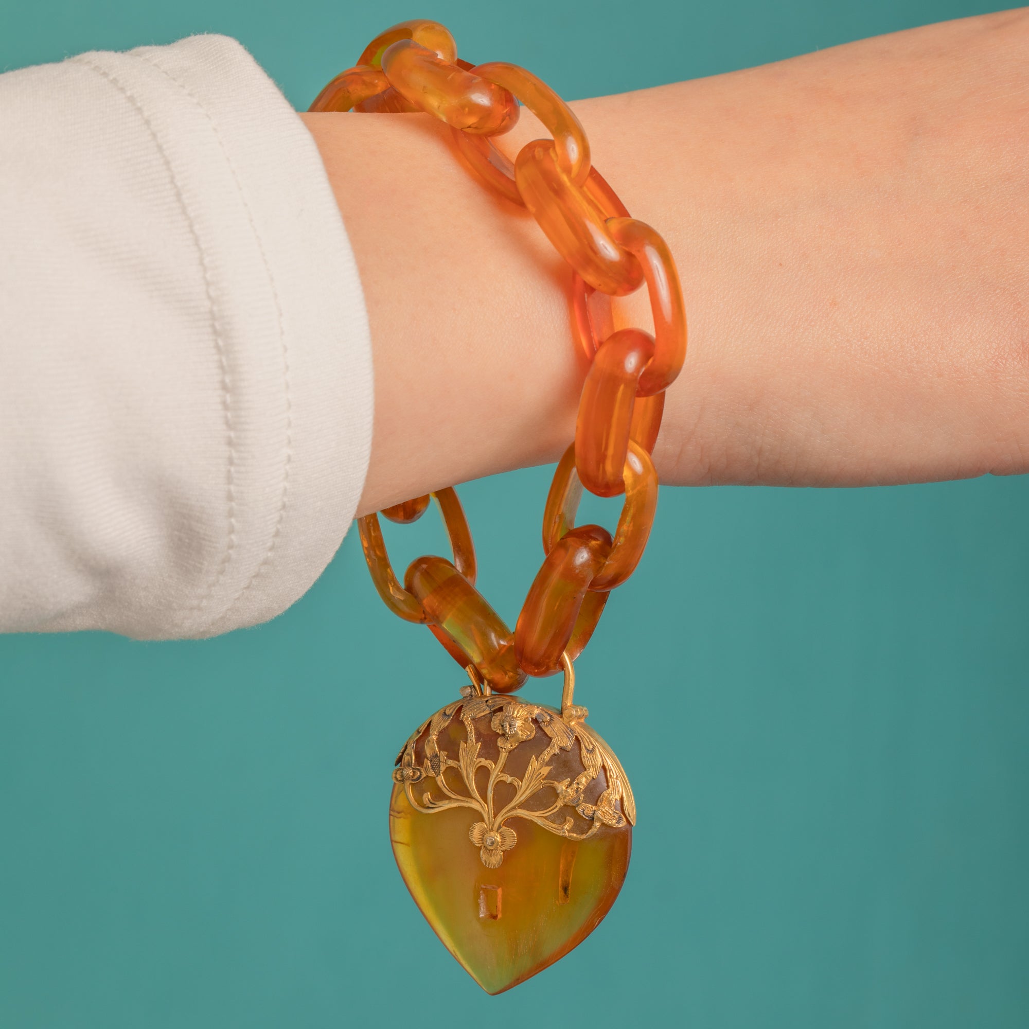 Glowing with the warm translucency of Blonde Tortoiseshell, this Victorian bracelet marries sculptural links with a romantic heart-shaped padlock clasp. The honeyed oval links are smooth and glossy, their natural swirls and veils catching the light beautifully, while the heart padlock is adorned with elegant foliate detailing in Sterling Silver Gilt for a richly decorative finish.