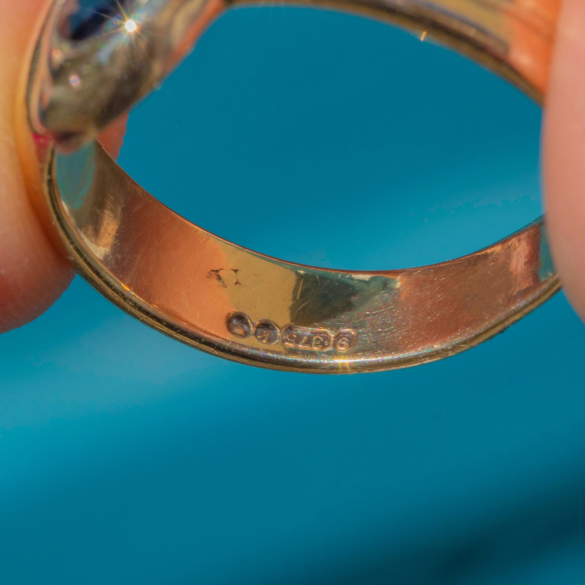 EXCELLENT: The Gold is bright and glossy, having retained a wonderful sheen. The Sapphire is radiant and is secure within its setting, free from chips or abrasions. The band is not perfectly round, though this does not affect the ring's wearability. Hallmarked and dated to 1965, it radiates vintage charm!