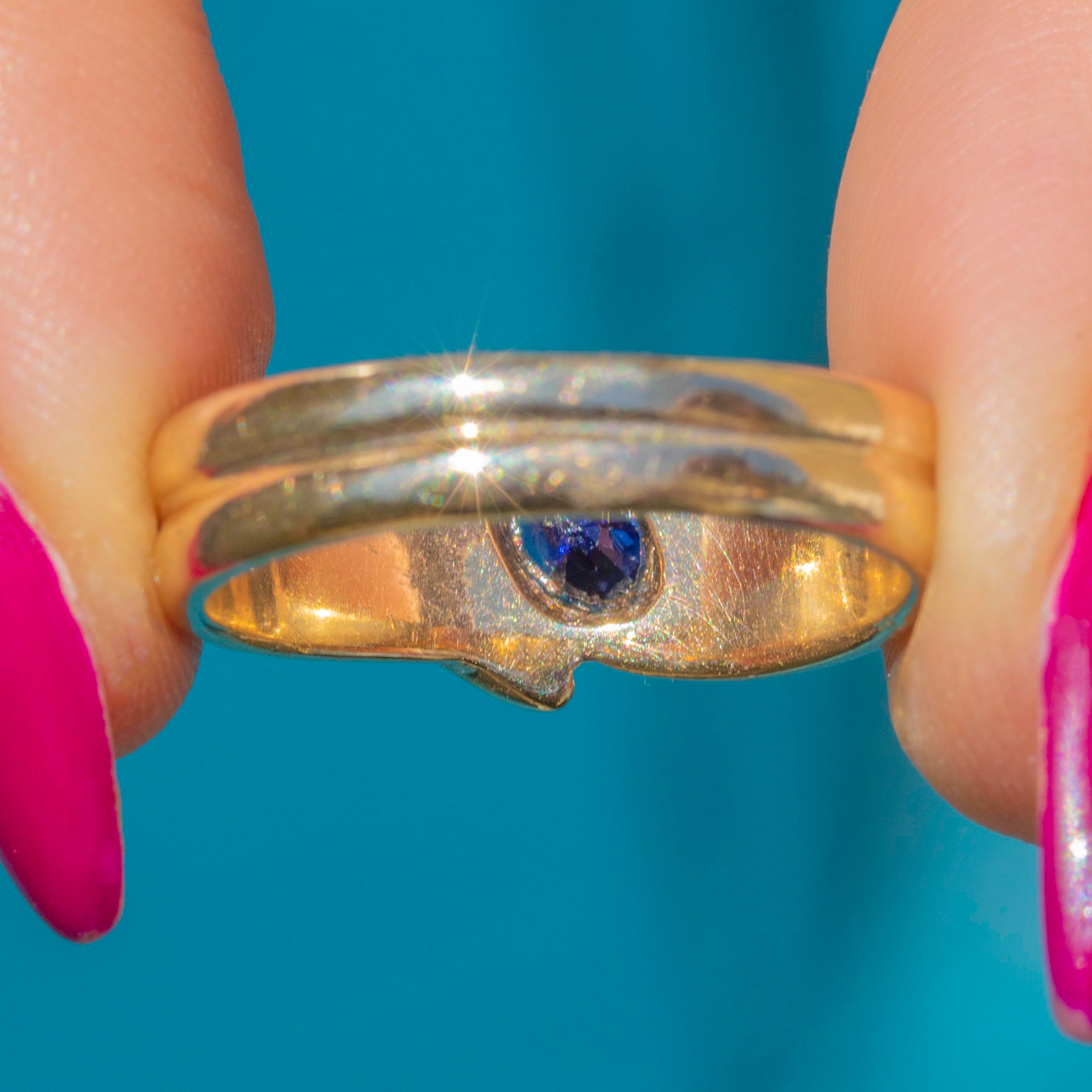 At the snake’s head sits a captivating natural 0.20ct royal Blue Sapphire, adding a touch of sophistication and character. Its polished band and low profile ensure comfortable wear, making this vintage piece a wonderful chunky addition to any collection.