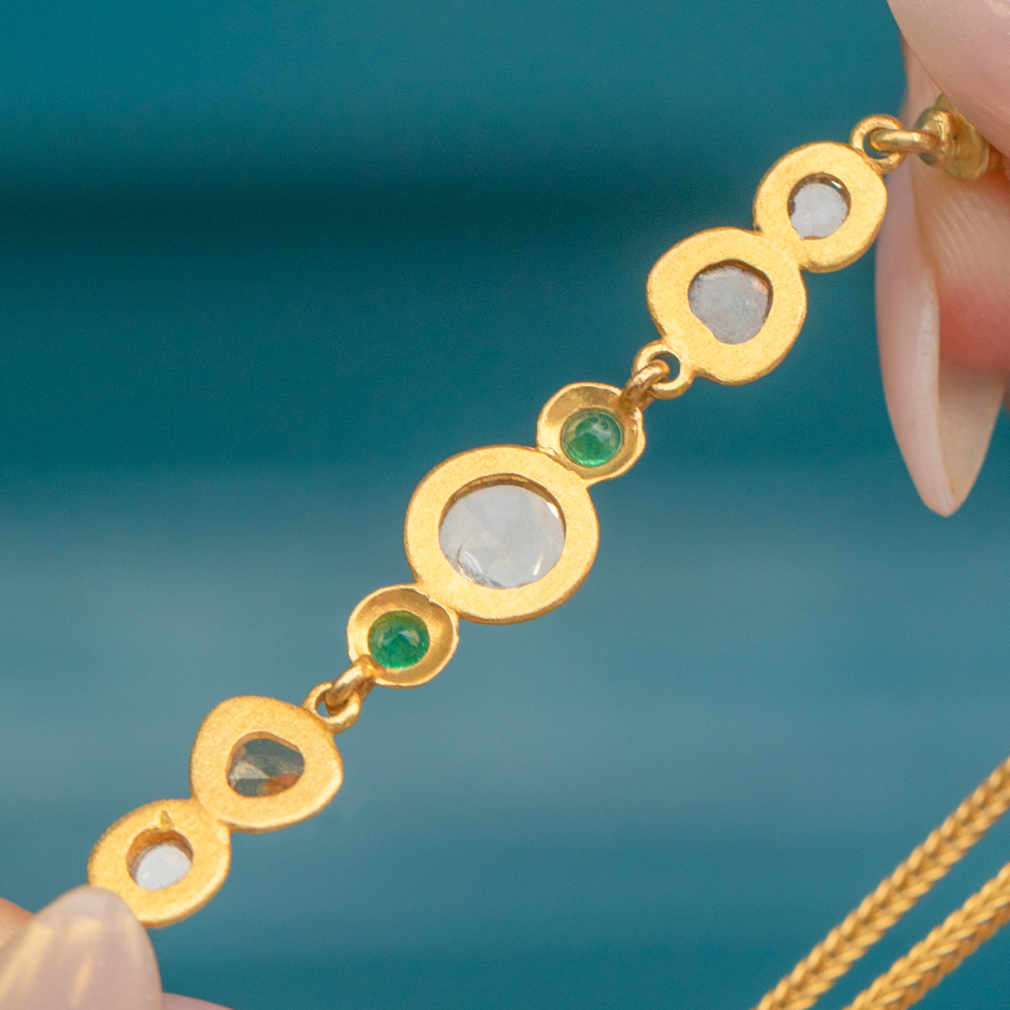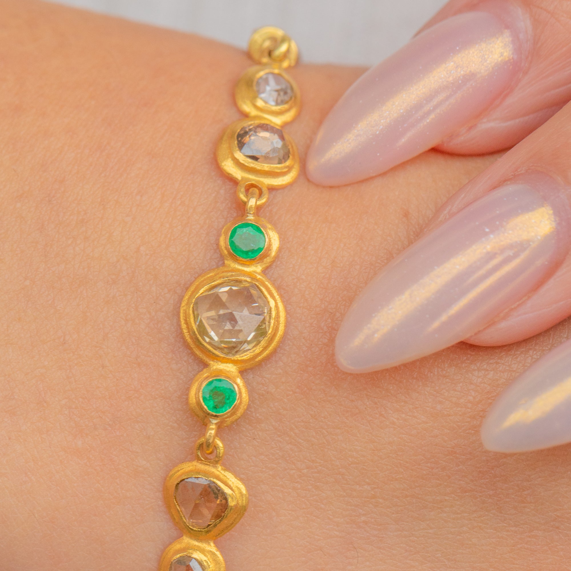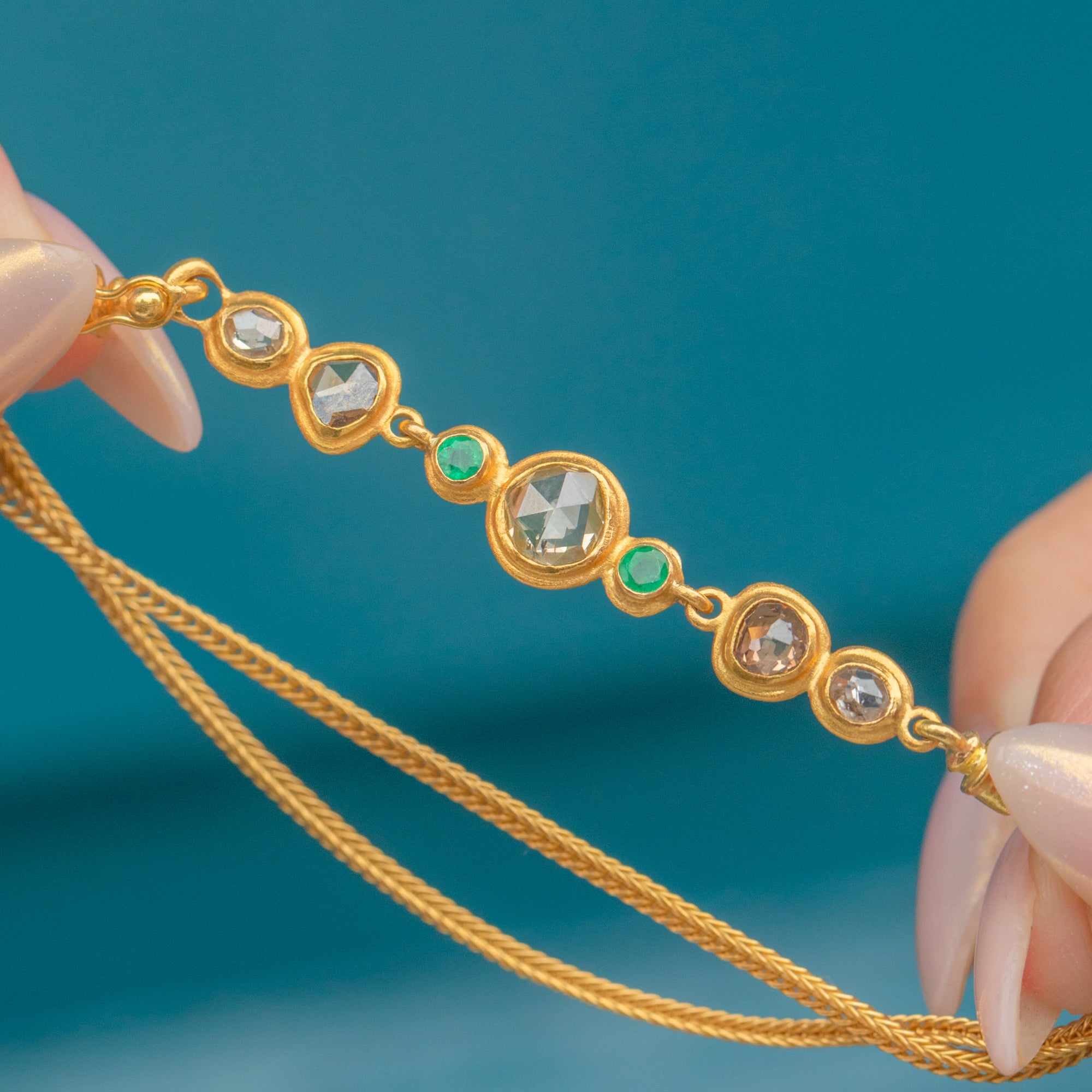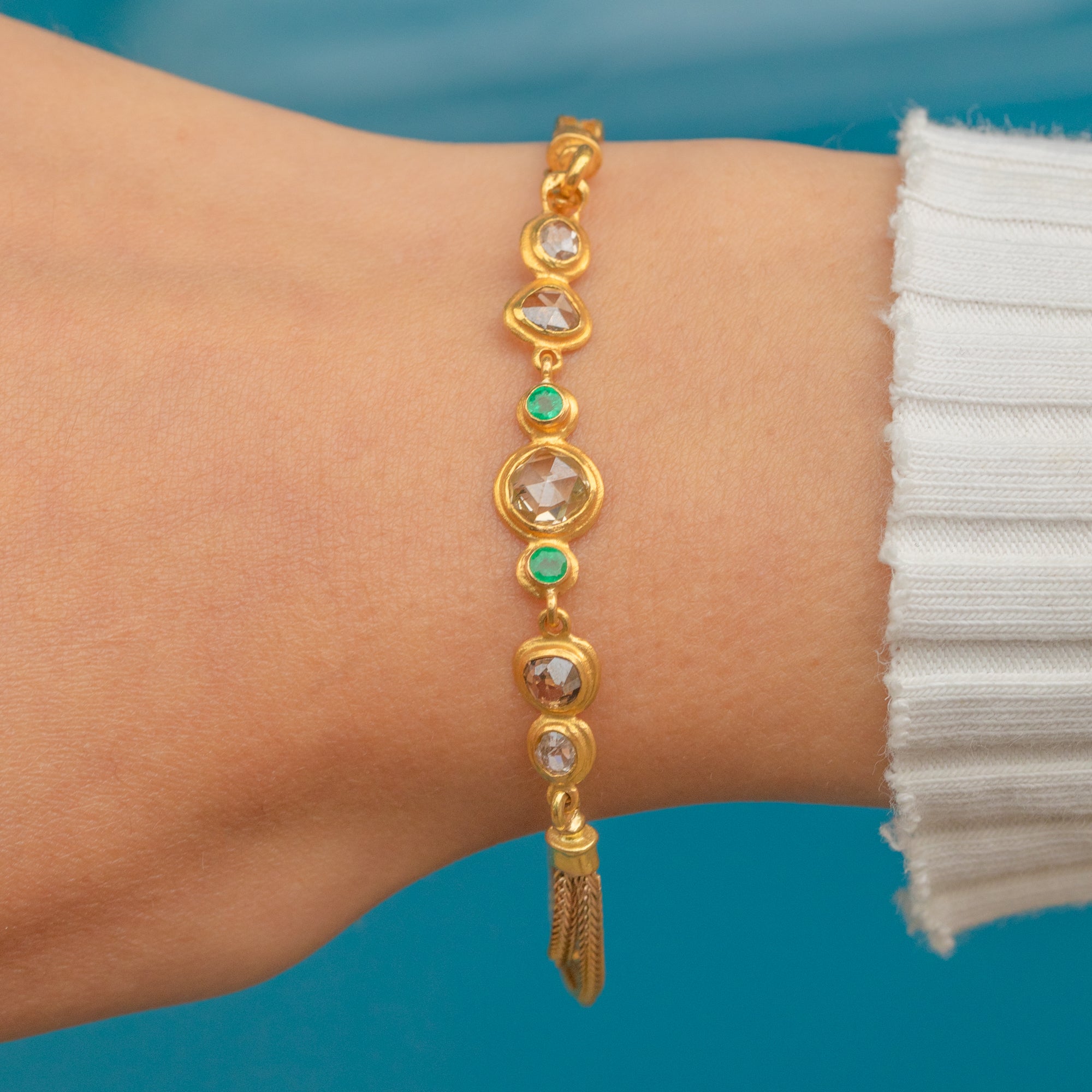 This exceptional bracelet showcases a series of rose-cut Diamonds and vivid Emeralds, each set in bold high carat Gold bezels. The gemstones are linked by fine fox-tail chains, creating a supple, flexible design that sits elegantly against the wrist. The Diamonds, individually shaped and full of antique character, display a variety of tones from silvery-white to soft cognac, enhanced by the glowing green of two natural Emerald accents.